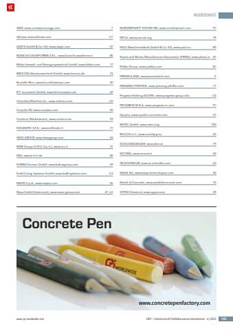 INSERZIONISTI www.cpi-worldwide.com C&PI %u2013 Calcestruzzo & Prefabbricazione International %u2013 6 | 2025 105AEM, www.conexpoconagg.com 7Afinitas, www.afinitas.com C1ASSYX GmbH & Co. KG, www.assyx.com 57BIANCHI CASSEFORME S.R.L., www.bianchicasseforme.it 85Bibko Umwelt- und Reinigungstechnik GmbH, www.bibko.com 17BRECON Vibrationstechnik GmbH, www.brecon.de 73Brunello Rino, www.brunellostampi.com 49B.T. innovation GmbH, www.bt-innovation.de 69Columbia Machine Inc., www.colmac.com C2Conplex BV, www.conplex.com 55Construx Weckenmann, www.construx.eu 93EDILMATIC S.P.A., www.edilmatic.it 77HESS GROUP, www.hessgroup.com 53IMER Group (O.R.U. S.p.A.), www.oru.it 31KBH, www.k-b-h.de 45KOBRA Formen GmbH, www.kobragroup.com 59Kraft Curing Systems GmbH, www.kraft-systems.com C3MAPEI S.p.A., www.mapei.com 25Masa GmbH Andernach, www.masa-group.com 27, 61NORDIMPIANTI SYSTEM SRL, www.nordimpianti.com 97NPCA, www.precast.org 79PAUL Maschinenfabrik GmbH & Co. KG, www.paul.eu 89Pavers and Blocks Manufacturers Association (PBMA), www.pbma.in 47Peikko Group, www.peikko.com 87PRENSOLAND, www.prensoland.com 5PRINZING PFEIFFER, www.prinzing-pfeiffer.com 11Progress Holding AG/SPA, www.progress-group.info C4PROGRESS M & A, www.progress-m.com 91Quadra, www.quadra-concrete.com 51RATEC GmbH, www.ratec.org 103ROCCHI s.r.l., www.rocchipg.eu 23SCHL%u00dcSSELBAUER, www.sbm.at 19SICOMA, www.sicoma.it 33SR SCHINDLER, www.sr-schindler.com 63WASA AG, www.wasa-technologies.com 35World of Concrete, www.worldofconcrete.com 75XYPEX Chemical, www.xypex.com 29www.concretepenfactory.comConcrete Pen