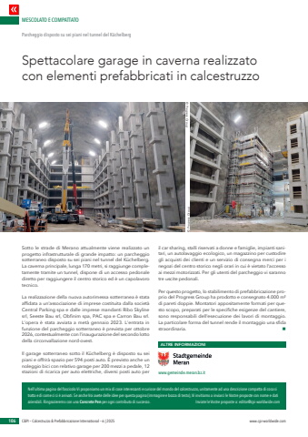 MESCOLATO E COMPATTATO C&PI %u2013 Calcestruzzo & Prefabbricazione International %u2013 6 | 2025 www.cpi-worldwide.comNell%u2019ultima pagina del fascicolo Vi proponiamo un mix di cose interessanti e curiose del mondo del calcestruzzo, unitamente ad una descrizione compatta di cosa si tratta e di come ci si %u00e8 arrivati. Se anche Voi avete delle idee per questa pagina (immagine e bozza di testo), Vi invitiamo a inviarci le Vostre proposte con nome e dati aziendali. Ringrazieremo con una Concrete Pen per ogni contributo di successo. Inviate le Vostre proposte a: editor@cpi-worldwide.com106Spettacolare garage in caverna realizzato con elementi prefabbricati in calcestruzzoParcheggio disposto su sei piani nel tunnel del K%u00fcchelberg Sotto le strade di Merano attualmente viene realizzato un progetto infrastrutturale di grande impatto: un parcheggio sotterraneo disposto su sei piani nel tunnel del K%u00fcchelberg. La caverna principale, lunga 170 metri, si raggiunge completamente tramite un tunnel, dispone di un accesso pedonale diretto per raggiungere il centro storico ed %u00e8 un capolavoro tecnico.La realizzazione della nuova autorimessa sotterranea %u00e8 stata affidata a un%u2019associazione di imprese costituita dalla societ%u00e0 Central Parking spa e dalle imprese mandanti Ribo Skyline srl, Seeste Bau srl, Obfinim spa, PAC spa e Carron Bau srl. L%u2019opera %u00e8 stata avviata a met%u00e0 gennaio 2023. L%u2019entrata in funzione del parcheggio sotterraneo %u00e8 prevista per ottobre 2026, contestualmente con l%u2019inaugurazione del secondo lotto della circonvallazione nord-ovest. Il garage sotterraneo sotto il K%u00fcchelberg %u00e8 disposto su sei piani e offrir%u00e0 spazio per 594 posti auto. %u00c8 previsto anche un noleggio bici con relativo garage per 200 mezzi a pedale, 12 stazioni di ricarica per auto elettriche, diversi posti auto per il car sharing, stalli riservati a donne e famiglie, impianti sanitari, un autolavaggio ecologico, un magazzino per custodire gli acquisti dei clienti e un servizio di consegna merci per i negozi del centro storico negli orari in cui %u00e8 vietato l%u2019accesso ai mezzi motorizzati. Per gli utenti del parcheggio vi saranno tre uscite pedonali.Per questo progetto, lo stabilimento di prefabbricazione proprio del Progress Group ha prodotto e consegnato 4.000 m%u00b2 di pareti doppie. Montatori appositamente formati per questo scopo, preparati per le specifiche esigenze del cantiere, sono responsabili dell%u2019esecuzione dei lavori di montaggio. La particolare forma del tunnel rende il montaggio una sfida straordinaria. nALTRE INFORMAZIONIwww.gemeinde.meran.bz.it %u00a9 Progress Group %u00a9 Progress Group