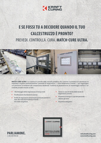 info@kraftcuring.com www.kraftcuring.comE SE FOSSI TU A DECIDERE QUANDO IL TUO CALCESTRUZZO %u00c8 PRONTO?PREVEDI. CONTROLLA. CURA. MATCH-CURE ULTRA.MATCH-CURE ULTRA %u00e8 un sistema di controllo della maturit%u00e0 predittiva che consente ai produttori di calcestruzzo di impostare e regolare automaticamente i parametri di stagionatura %u2014 come temperatura e durata %u2014 per raggiungere con precisione la resistenza alla compressione desiderata. Trasforma la produzione da un monitoraggio reattivo a un controllo proattivo basato sui dati.%uf07d Monitoraggio della stagionatura in tempo reale%uf07d Pianificazione di produzione precisa%uf07d Profilo di stagionatura determinato automaticamente in base alla maturit%u00e0/resistenza richiesta %u2014 fine delle congetture%uf07d Avviso in caso di ritardo della durata di stagionatura prevista%uf07d Risparmio di tempo e costi del personale %u2014 elimina gli errori%uf07d Risparmio energeticoPARLIAMONE.(+49) 595796120