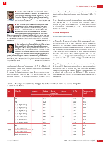 TECNICA DEL CALCESTRUZZOwww.cpi-worldwide.com C&PI %u2013 Calcestruzzo & Prefabbricazione International %u2013 6 | 2025 15stagionatura in bagno d%u2019acqua dopo 1, 3, 7, 28 e 90 giorni. Il controllo dei cubi %u00e8 stato effettuato secondo la norma sudafricana SANS 5863 (2006) [11].Il modulo di elasticit%u00e0 statico %u00e8 stato determinato secondo i principi della BS 1881 [12]. Per ogni miscela sono stati prodotti tre cilindri di calcestruzzo di 200 mm di altezza e 100 mm di diametro. Dopo la produzione, tutti i provini sono stati stagionati in un bagno d%u2019acqua e controllati dopo 7, 28 e 90 giorni.Il ritiro da essiccamento %u00e8 stato analizzato secondo la procedura dell%u2019ASTM C157 [13]. I provini sono stati prima stagionati per 28 giorni in acqua satura di calcare e poi conservati in un ambiente climatizzato a 23 %u00b1 2 %u00b0C e umidit%u00e0 relativadell%u2019aria di 50 %u00b1 4 %.Risultati delle prove Resistenza alla compressioneLe Figure 1 e 2 riportano i risultati della resistenza alla compressione dopo 1, 3, 7, 28 e 90 giorni. Come previsto, la resistenza alla compressione dei calcestruzzi LC3 dipende ampiamente dalla percentuale di clinker e di caolinite. Inoltre, la prestazione viene influenzata dalla superficie specifica (SSA) dell%u2019argilla e dal contenuto alcalino nel sistema, come descritto dettagliatamente in [14]. L%u2019argilla PH (PH-Clay) presentava una SSA maggiore rispetto alle argille B e H, mentre H-Clay aveva l%u2019SSA pi%u00f9 bassa e il maggiore contenuto alcalino.Dopo 90 giorni, tutte le miscele con un contenuto di clinker di almeno il 55 % presentavano resistenze alla compressione simili, mentre per le miscele con il 45 % di clinker venivano determinate resistenze inferiori. %u00c8 degno di nota il fatto che le miscele pi%u00f9 performanti con B-Clay e PH-Clay presentavano resistenze corrispondenti a quelle delle due miscele di riferimento.n Emmanuel Safari Leo %u00e8 docente presso l%u2019Universit%u00e0 di Daressalam, Facolt%u00e0 di Ingegneria e Tecnologia. Ha conseguito l%u2019MSc (Ing.) e il PhD all%u2019Universit%u00e0 di Citt%u00e0 del Capo, Sudafrica, e il BSc (Ing. civile) all%u2019Universit%u00e0 di Dar es Salaam, Tanzania. I suoi interessi di ricerca riguardano l'applicazione dei prodotti sostitutivi del cemento nel calcestruzzo. leo.emanuel@udsm.ac.tz n Mark Alexander %u00e8 professore emerito di ingegneria civile e ricercatore senior presso l%u2019Universit%u00e0 di Citt%u00e0 del Capo (UCT). Ha fatto il dottorato all%u2019Universit%u00e0 di Witwatersrand, Johannesburg, ed %u00e8 membro onorario di varie istituzioni, tra cui UCT, RILEM, Istituto Sudafricano di Ingegneria Civile, Accademia Sudafricana di Ingegneria e Istituto Indiano del Calcestruzzo. %u00c8 ingegnere professionista registrato in Sudafrica. A livello di ricerca, i suoi interessi sono la durabilit%u00e0 e le previsioni sulla vita utile delle opere in calcestruzzo, la sostenibilit%u00e0 del calcestruzzo e il risanamento di costruzioni in calcestruzzo danneggiate. mark.alexander@uct.ac.zan Hans Beushausen %u00e8 professore all%u2019Universit%u00e0 di Citt%u00e0 del Capo. %u00c8 direttore dell%u2019Unit%u00e0 di Ricerca sui Materiali in Calcestruzzo e l'Integrit%u00e0 Strutturale che si specializza sulla performance e sulla riparazione delle opere in calcestruzzo. Tra i suoi campi di ricerca troviamo la durabilit%u00e0 del calcestruzzo, i calcestruzzi con ridotta impronta di CO2 e i sistemi di riparazione per strutture in calcestruzzo. Tra i suoi altri interessi troviamo la tecnologia della prefabbricazione, inoltre %u00e8 un redattore della rivista di settore Calcestruzzo e Prefabbricazione International, C&PI. %u00c8 attivo in numerosi organismi internazionali e attualmente vicepresidente di RILEM. hans.beushausen@uct.ac.zaTabella 1: Mix design del calcestruzzo, dosaggio di superfluidificante (SF, riferito alla quantit%u00e0 di legante) e assettamento ottenuto.a/c Miscela Legante Sabbia Grana grossolanaAcqua SF (%) Assettamento (mm)kg/m%u00b30,4R14008661000 1600,60 80R2 863 0,55 120LC3-65(B:25/10) 852 1,15 110LC3-55(B:35/10) 847 1,20 100LC3-45(B:40/15) 842 1,25 95LC3-65(H:25/10) 852 1,10 120LC3-55(H:35/10) 846 1,20 105LC3-45(H:40/15) 842 1,25 110LC3-55(PH:35/10) 849 1,50 900,55R1291964 0,80 115LC3-55(B:35/10) 950 1,20 90LC3-55(H:35/10) 949 1,15 95LC3-55(HC:35/10) 954 2,00 45