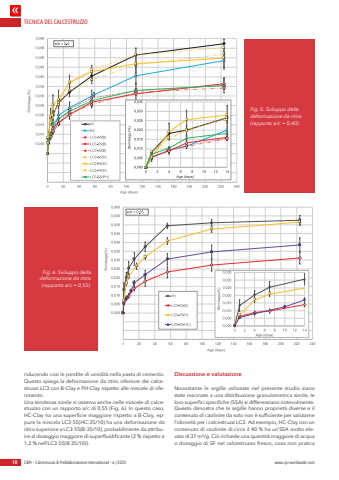 TECNICA DEL CALCESTRUZZO18 C&PI %u2013 Calcestruzzo & Prefabbricazione International %u2013 6 | 2025 www.cpi-worldwide.comriducendo cos%u00ec le perdite di umidit%u00e0 nella pasta di cemento. Questo spiega la deformazione da ritiro inferiore dei calcestruzzi LC3 con B-Clay e PH-Clay rispetto alle miscele di riferimento.Una tendenza simile si osserva anche nelle miscele di calcestruzzo con un rapporto a/c di 0,55 (Fig. 6). In questo caso, HC-Clay ha una superficie maggiore rispetto a B-Clay, eppure la miscela LC3-55(HC:35/10) ha una deformazione da ritiro superiore a LC3-55(B:35/10), probabilmente da attribuire al dosaggio maggiore di superfluidificante (2 % rispetto a 1,2 % nell%u2019LC3-55(B:35/10)).Discussione e valutazioneNonostante le argille utilizzate nel presente studio siano state macinate a una distribuzione granulometrica simile, le loro superfici specifiche (SSA) si differenziano notevolmente. Questo dimostra che le argille hanno propriet%u00e0 diverse e il contenuto di caolinite da solo non %u00e8 sufficiente per valutarne l%u2019idoneit%u00e0 per i calcestruzzi LC3. Ad esempio, HC-Clay con un contenuto di caolinite di circa il 40 % ha un%u2019SSA molto elevata di 37 m%u00b2/g. Ci%u00f2 richiede una quantit%u00e0 maggiore di acqua o dosaggio di SF nel calcestruzzo fresco, cosa non pratica Fig. 5: Sviluppo della deformazione da ritiro (rapporto a/c = 0,40).Fig. 6: Sviluppo della deformazione da ritiro (rapporto a/c = 0,55).