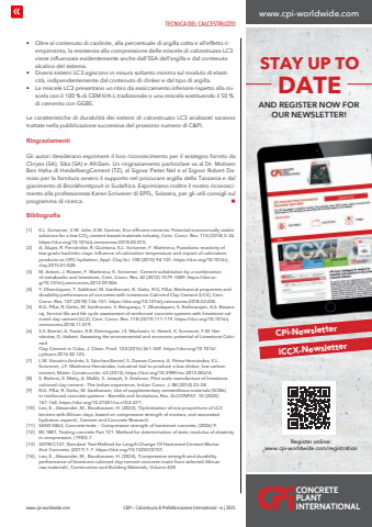 TECNICA DEL CALCESTRUZZOwww.cpi-worldwide.com C&PI %u2013 Calcestruzzo & Prefabbricazione International %u2013 6 | 2025%u2022 Oltre al contenuto di caolinite, alla percentuale di argilla cotta e all%u2019effetto riempimento, la resistenza alla compressione delle miscele di calcestruzzo LC3 viene influenzata evidentemente anche dall%u2019SSA dell%u2019argilla e dal contenuto alcalino del sistema.%u2022 Diversi sistemi LC3 agiscono in misura soltanto minima sul modulo di elasticit%u00e0, indipendentemente dal contenuto di clinker e dal tipo di argilla.%u2022 Le miscele LC3 presentano un ritiro da essiccamento inferiore rispetto alla miscela con il 100 % di CEM II/A-L tradizionale o una miscela sostituendo il 50 % di cemento con GGBS.Le caratteristiche di durabilit%u00e0 dei sistemi di calcestruzzo LC3 analizzati saranno trattate nella pubblicazione successiva del prossimo numero di C&PI.Ringraziamenti Gli autori desiderano esprimere il loro riconoscimento per il sostegno fornito da Chryso (SA), Sika (SA) e AfriSam. Un ringraziamento particolare va al Dr. Mohsen Ben Haha di HeidelbergCement (TZ), al Signor Pieter Nel e al Signor Robert Damian per la fornitura ovvero il supporto nel procurare argilla della Tanzania e dal giacimento di Bronkhorstpruit in Sudafrica. Esprimiamo inoltre il nostro riconoscimento alla professoressa Karen Scrivener di EPFL, Svizzera, per gli utili consigli sul programma di ricerca. nBibliografia[1] K.L. Scrivener, V.M. John, E.M. Gartner, Eco-efficient cements: Potential economically viable solutions for a low-CO2 cement-based materials industry, Cem. Concr. Res. 114 (2018) 2%u201326. https://doi.org/10.1016/j.cemconres.2018.03.015.[2] A. Alujas, R. Fern%u00e1ndez, R. Quintana, K.L. Scrivener, F. Martirena, Pozzolanic reactivity of low grade kaolinitic clays: Influence of calcination temperature and impact of calcination products on OPC hydration, Appl. Clay Sci. 108 (2015) 94%u2013101. https://doi.org/10.1016/j.clay.2015.01.028.[3] M. Antoni, J. Rossen, F. Martirena, K. Scrivener, Cement substitution by a combination of metakaolin and limestone, Cem. Concr. Res. 42 (2012) 1579%u20131589. https://doi.org/10.1016/j.cemconres.2012.09.006.[4] Y. Dhandapani, T. Sakthivel, M. Santhanam, R. Gettu, R.G. Pillai, Mechanical properties and durability performance of concretes with Limestone Calcined Clay Cement (LC3), Cem. Concr. Res. 107 (2018) 136%u2013151. https://doi.org/10.1016/j.cemconres.2018.02.005.[5] R.G. Pillai, R. Gettu, M. Santhanam, S. Rengaraju, Y. Dhandapani, S. Rathnarajan, A.S. Basavaraj, Service life and life cycle assessment of reinforced concrete systems with limestone calcined clay cement (LC3), Cem. Concr. Res. 118 (2019) 111%u2013119. https://doi.org/10.1016/j.cemconres.2018.11.019.[6] S.S. Berriel, A. Favier, E.R. Dom%u00ednguez, I.S. Machado, U. Heierli, K. Scrivener, F.M. Hern%u00e1ndez, G. Habert, Assessing the environmental and economic potential of Limestone Calcined Clay Cement in Cuba, J. Clean. Prod. 124 (2016) 361%u2013369. https://doi.org/10.1016/ j.jclepro.2016.02.125.[7] L.M. Vizca%u00edno-Andr%u00e9s, S. S%u00e1nchez-Berriel, S. Damas-Carrera, A. P%u00e9rez-Hern%u00e1ndez, K.L. Scrivener, J.F. Martirena-Hern%u00e1ndez, Industrial trial to produce a low clinker, low carbon cement, Mater. Construcci%u00f3n. 65 (2015). https://doi.org/10.3989/mc.2015.00614.[8] S. Bishnoi, S. Maity, A. Mallik, S. Joseph, S. Krishnan, Pilot scale manufacture of limestone calcined clay cement : The Indian experience, Indian Concr. J. 88 (2014) 22%u201328.[9] R.G. Pillai, R. Gettu, M. Santhanam, Use of supplementary cementitious materials (SCMs) in reinforced concrete systems %u2013 Benefits and limitations, Rev. ALCONPAT. 10 (2020) 147%u2013164. https://doi.org/10.21041/ra.v10i2.477.[10] Leo, E., Alexander, M., Beushausen, H. (2023), %u2018Optimisation of mix proportions of LC3 binders with African clays, based on compressive strength of mortars, and associated hydration aspects%u2019, Cement and Concrete Research.[11] SANS 5863, Concrete tests %u2014 Compressive strength of hardened concrete, (2006) 9.[12] BS 1881, Testing concrete Part 121. Method for determination of static modulus of elasticity in compression, (1983) 7.[13] ASTM C157, Standard Test Method for Length Change Of Hardened Cement Mortar And Concrete, (2017) 1%u20137. https://doi.org/10.1520/C0157.[14] Leo, E., Alexander, M., Beushausen, H. (2024), %u2018Compressive strength and durability performance of limestone calcined clay cement concrete made from selected African raw materials%u2019, Construction and Building Materials, Volume 438.www.cpi-worldwide.comRegister online: www.cpi-worldwide.com/registrationCPi-NewsletterICCX-NewsletterSTAY UP TO DATEAND REGISTER NOW FOR OUR NEWSLETTER!CONCRETE PLANTINTERNATIONALTRADE JOURNALS FOR THE CONCRETE INDUSTRY