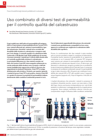 TECNICA DEL CALCESTRUZZO22 C&PI %u2013 Calcestruzzo & Prefabbricazione International %u2013 6 | 2025 www.cpi-worldwide.comIl test sudafricano dell%u2019indice di permeabilit%u00e0 all%u2019ossigeno (OPI) e il test svizzero di permeabilit%u00e0 all%u2019aria Torrent (TPT) sono metodi affermati per valutare la permeabilit%u00e0 ai gas del calcestruzzo. Entrambi i metodi sono correlati alla durabilit%u00e0 delle strutture in calcestruzzo e vengono usati per il mix design, il controllo qualit%u00e0 e la valutazione della conformit%u00e0. Il fib Model Code 2020 pubblicato di recente riconosce entrambi i metodi per il calcolo della durata utile e il controllo qualit%u00e0 delle strutture in calcestruzzo. La principale differenza tra i due metodi consiste nel fatto che mentre il test OPI viene eseguito solitamente su carote prelevate dalla struttura vera e propria o dall%u2019elemento prefabbricato oppure da un blocco di prova che rappresenta la struttura/l%u2019elemento, il test TPT si svolge direttamente sulla struttura. Pertanto, per quanto riguarda i metodi di prova il test TPT %u00e8 pi%u00f9 pratico, mentre il test OPI %u00e8 in grado di misurare le propriet%u00e0 di permeabilit%u00e0 indipendentemente dalle condizioni ambientali presenti in loco. Test di laboratorio approfonditi dimostrano che entrambi i metodi sono perfettamente compatibili tra loro come approccio combinato per migliorare la valutazione della durabilit%u00e0 del copriferro.Finora, la combinazione dei due metodi %u00e8 stata studiata solo su provini prodotti e testati in condizioni di laboratorio. Il presente lavoro esamina la praticabilit%u00e0 di un approccio combinato in cui il metodo OPI e il metodo TPT vengono usati insieme per valutare la permeabilit%u00e0 a gas di elementi prefabbricati in calcestruzzo esposti in loco. A tale scopo, gli elementi in calcestruzzo vengono prodotti da un produttore locale di elementi prefabbricati di Citt%u00e0 del Capo e conservati in presenza di condizioni ambientali naturali. La permeabilit%u00e0 ai gas %u00e8 stata misurata a 28 e 56 giorni per analizzare la sensibilit%u00e0 dei metodi OPI e TPT alle variabili come il rapporto acqua-legante (rapporto a/l), il tipo di legante e l%u2019et%u00e0 del calcestruzzo.I risultati dimostrano che entrambi i metodi in presenza di condizioni climatiche secche, ovvero nei mesi estivi a Citt%u00e0 del Capo, hanno una buona corrispondenza con i set di dati esistenti e confermano i vantaggi generali di un'applicazione congiunta. Sono tuttavia necessarie ulteriori ricerche per comprendere meglio l'influenza delle condizioni ambientali Uso combinato di diversi test di permeabilit%u00e0 per il controllo qualit%u00e0 del calcestruzzoProva di durabilit%u00e0 degli elementi prefabbricati in calcestruzzon Sean Alfred, Remedy Asset Protection, Australia / UCT, SudafricaHans Beushausen e Mark Alexander, Universit%u00e0 di Citt%u00e0 del Capo (UCT), SudafricaFig. 1: Nel test dell%u2019indice di permeabilit%u00e0 all%u2019ossigeno (OPI) i dischi di calcestruzzo vengono inseriti in una camera a pressione e sottoposti a una differenza di pressione di 10 bar. La perdita di pressione in funzione del tempo viene registrata e valutata per determinare la permeabilit%u00e0 ai gas del calcestruzzo.