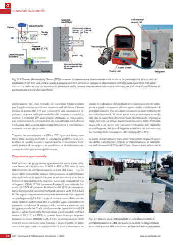 TECNICA DEL CALCESTRUZZO24 C&PI %u2013 Calcestruzzo & Prefabbricazione International %u2013 6 | 2025 www.cpi-worldwide.comcorrelazione tra i due metodi. Un incentivo fondamentale per l'applicazione combinata consiste nell'utilizzare il breve tempo di prova del TPT per consentire una valutazione rapida e completa della permeabilit%u00e0 del calcestruzzo in loco, mentre il metodo OPI pu%u00f2 essere utilizzato, se necessario, per determinare la permeabilit%u00e0 del calcestruzzo escludendo l'influenza dell'umidit%u00e0 ambientale attraverso il precondizionamento mirato dei provini.Tuttavia, le correlazioni tra OPI e TPT riportate finora non sono state ancora verificate in condizioni pratiche reali. L'obiettivo di questo lavoro %u00e8 quindi quello di esaminare l'idoneit%u00e0 pratica di un approccio combinato e di elaborare raccomandazioni per la sua applicazione.Programma sperimentaleNell'ambito del programma sperimentale sono state utilizzate lastre di calcestruzzo di 600 %u00d7 400 %u00d7 150 mm in uno stabilimento di prefabbricazione a Citt%u00e0 del Capo (Fig. 3). Sono state selezionate cinque composizioni di calcestruzzo che soddisfano le specifiche per le infrastrutture critiche in termini di durabilit%u00e0 nella regione. Sono stati utilizzati tre tipi di leganti: CEM I 52.5 N (cemento Portland), una miscela formata dal 70 % di cemento Portland e dal 30 % di cenere volante (CV) nonch%u00e9 cemento Portland calcareo CEM II/A-L 52.5 N. Per ogni composizione sono stati selezionati due rapporti acqua/legante (0,5 e 0,6). La produzione %u00e8 stata effettuata durante l%u2019estate sudafricana che a Citt%u00e0 del Capo normalmente presenta condizioni di tempo caldo, asciutto e ventoso con piogge sporadiche. Tra la produzione dei provini e l%u2019et%u00e0 di 28 giorni, i valori medi della temperatura e dell%u2019umidit%u00e0 dell%u2019aria erano di 20,3 %u00b0C e il 70 %, in questo lasso di tempo le precipitazioni si sono attestate a 24,4 mm. Le composizioni delle miscele sono riassunte nella Tabella 1. Dopo il getto, le lastre sono state spruzzate con un prodotto di post-trattamento secondo le indicazioni del produttore e successivamente sottoposte a post-trattamento all'aria aperta nello stabilimento di prefabbricazione. Per simulare condizioni di post-trattamento naturali sfavorevoli, le lastre sono state posizionate in modo tale che la superficie di prova fosse direttamente esposta ai raggi del sole. Le prove di permeabilit%u00e0 sono state effettuate dopo 28 e 56 giorni per valutare l'influenza del rapporto acqua/legante, del tipo di legante e dell'et%u00e0 del calcestruzzo sui risultati delle misurazioni dei metodi OPI e TPT.Le lastre di calcestruzzo sono state trasportate dopo 28 giorni dal getto dallo stabilimento di prefabbricazione al laboratorio dell%u2019Universit%u00e0 di Citt%u00e0 del Capo, dove %u00e8 stato effettuato il Fig. 2: Il Torrent Permeability Tester (TPT) consente di determinare direttamente sulla struttura la permeabilit%u00e0 all%u2019aria del calcestruzzo. A tal fine, una cella a vuoto a doppia camera genera un campo di depressione definito sulla superficie del calcestruzzo. La velocit%u00e0 con cui aumenta la pressione nella camera interna viene misurata e utilizzata per calcolare il coefficiente di permeabilit%u00e0 all'aria del copriferro.Fig. 3: I provini sono stati prodotti in uno stabilimento di prefabbricazione a Citt%u00e0 del Capo e durante la stagionatura sono stati esposti alle condizioni ambientali estive prevalenti.
