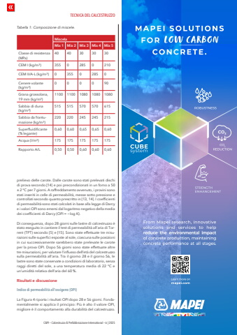 TECNICA DEL CALCESTRUZZOC&PI %u2013 Calcestruzzo & Prefabbricazione International %u2013 6 | 2025prelievo delle carote. Dalle carote sono stati prelevati dischi di prova secondo [14] e poi precondizionati in un forno a 50 %u00b1 2 %u00b0C per 7 giorni. A raffreddamento avvenuto, i provini sono stati inseriti in celle di permeabilit%u00e0, messe sotto pressione e controllati secondo quanto prescritto in [13, 14]. I coefficienti di permeabilit%u00e0 sono stati calcolati in base alla legge di Darcy e i valori OPI sono emersi dal logaritmo negativo della media dei coefficienti di Darcy (OPI = %u2212log K).Di conseguenza, dopo 28 giorni sulle lastre di calcestruzzo %u00e8 stato eseguito in cantiere il test di permeabilit%u00e0 all%u2019aria di Torrent (TPT) secondo [5] e [15]. Sono state effettuate tre misurazioni sulle superfici esposte al sole, ciascuna sulle posizioni in cui successivamente sarebbero state prelevate le carote per la prova OPI. Dopo 56 giorni sono state effettuate altre tre misurazioni, per valutare l%u2019influsso dell%u2019et%u00e0 del calcestruzzo sulla permeabilit%u00e0 all%u2019aria. Tra il giorno 28 e il giorno 56, le lastre sono state conservate a condizioni di laboratorio, senza raggi diretti del sole, a una temperatura media di 22 %u00b0C e un%u2019umidit%u00e0 relativa dell%u2019aria del 60 %.Risultati e discussioneIndice di permeabilit%u00e0 all%u2019ossigeno (OPI)La Figura 4 riporta i risultati OPI dopo 28 e 56 giorni. Fondamentalmente si applica il principio: Pi%u00f9 %u00e8 alto il valore OPI, migliore %u00e8 il comportamento alla durabilit%u00e0 del calcestruzzo. Tabella 1: Composizione di miscele.MiscelaMix 1 Mix 2 Mix 3 Mix 4 Mix 5Classe di resistenza (MPa)40 40 30 30 30CEM I (kg/m%u00b3) 355 0 285 0 210CEM II/A-L (kg/m%u00b3) 0 355 0 285 0Cenere volante (kg/m%u00b3)0 0 0 0 90Grana grossolana, 19 mm (kg/m%u00b3)1100 1100 1080 1080 1080Sabbia di duna (kg/m%u00b3)515 515 570 570 615Sabbia da frantumazione (kg/m%u00b3)220 220 245 245 215Superfluidificante (% legante)0,60 0,60 0,65 0,65 0,60Acqua (l/m%u00b3) 175 175 175 175 175Rapporto A/L 0,50 0,50 0,60 0,60 0,60