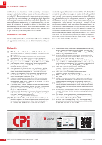 TECNICA DEL CALCESTRUZZO28 C&PI %u2013 Calcestruzzo & Prefabbricazione International %u2013 6 | 2025 www.cpi-worldwide.comdi kT in loco non rispettano i limiti consentiti, %u00e8 necessario eseguire ulteriori analisi sui carote prelevate utilizzando il metodo OPI. Questo approccio rappresenta una procedura in due fasi che pu%u00f2 migliorare la valutazione della durabilit%u00e0 nella pratica. In questo modo, il controllo della durabilit%u00e0 pu%u00f2 essere effettuato rapidamente e, in casi poco chiari o in presenza di indicazioni di possibili problemi di durabilit%u00e0, pu%u00f2 essere integrato da analisi di laboratorio approfondite. L'approccio consente una valutazione rigorosa della permeabilit%u00e0 ai gas in situ e quindi della potenziale durabilit%u00e0.Osservazioni conclusiveLo studio ha esaminato le possibilit%u00e0 di attuazione pratica di un approccio combinato per la determinazione della permeabilit%u00e0 ai gas utilizzando i metodi OPI e TPT. Entrambi i metodi di prova hanno reagito in modo simile alle variabili sperimentali come rapporto acqua/legante, tipo di legante ed et%u00e0 degli elementi in calcestruzzo prodotti in loco a Citt%u00e0 del Capo nel periodo estivo. %u00c8 stata riscontrata una forte correlazione tra i valori ottenuti con entrambi i metodi, in linea con le osservazioni di studi precedenti. Su questa base, %u00e8 attualmente in fase di sviluppo un approccio praticabile per l'implementazione, basato su una procedura in due fasi che consente di effettuare test completi in loco con metodi non distruttivi e che pu%u00f2 essere integrata da analisi di laboratorio in scenari che evidenziano possibili problemi di durabilit%u00e0. Lavori futuri analizzeranno l%u2019influsso dell%u2019umidit%u00e0 sulla correlazione tra i metodi OPI e TPT in loco. nBibliografia[1] M. G. Alexander, J. R. Mackechnie, and Y. Ballim, %u2018Guide to the use of durability indexes for achieving durability in concrete structures%u2019. pp. 1%u201318, 1999.[2] M. J. Alexander, %u2018Durability indexes and their use in concrete engineering%u2019, pp. 9%u201322, 2005, doi: 10.1617/2912143586.002.[3] M. G. Alexander, A. Bentur, and S. Mindess, Durability of concrete: Design and construction. CRC Press - Taylor & Francis Group, 2017.[4] G. W. Nganga, %u2018Practical implemenation of the durability indexbased performance approach%u2019, MSc. Thesis submitted to University of Cape Town, 2012.[5] G. W. Nganga, M. G. Alexander, and H. D. Beushausen, %u2018Quality control of reinforced concrete structures for durability%u2019, XIII Conf. Durab. Build. Mater. Components, no. 1, pp. 1006%u20131014, 2014.[6] S. Starck, %u2018The Integration of Non-Destructive test methods into the South African Durability Index Approach%u2019, MSc. Thesis submitted to University of Cape Town, 2013.[7] S. Starck, H. Beushausen, M. Alexander, and R. Torrent, %u2018Complementarity of in situ and laboratory-based concrete permeability measurements%u2019, Mater. Struct. Constr., vol. 50, no. 3, pp. 1%u201315, 2017, doi: 10.1617/s11527-017-1037-3.[8] R. J. Torrent and G. Frenzer, %u2018A method for the rapid determination of the coefficient of permeability of cover concrete%u2019, in International Symposium on Non-destructive Testing in Civil Engineering (NDT-CE), 1995, pp. 985%u2013992.[9] R. J. Torrent, R. D. Neves, and K.-I. Imamoto, Concrete Permeability & Durability Performance: From Theory to Field Applications, First. CRC Press - Taylor & Francis Group, 2022. doi: https://doi.org/10.1201/9780429505652-5.[10] M. G. Alexander, Y. Ballim, and K. Stanish, %u2018A framework for use of durability indexes in performance-based design and specifications for reinforced concrete structures%u2019, Mater. Struct. Constr., vol. 41, no. 5, pp. 921%u2013936, 2008, doi: 10.1617/s11527-007-9295-0.[11] A. Bahurudeen and M. Santhanam, %u2018Performance evaluation of sugarcane bagasse ash-based cement for durable concrete%u2019, Proc. 4thInt. Conf. Durab. Concr. Struct. ICDCS 2014, no. July, pp. 275%u2013281, 2014, doi: 10.5703/1288284315412.[12] M. Romer, %u2018Effect of moisture and concrete composition on the Torrent permeability measurement%u2019, Mater. Struct. Constr., vol. 38, no. 279, pp. 541%u2013547, 2005, doi: 10.1617/14321.[13] RILEM Technical Committee, %u2018Comparative Test - Part I : \bility \in Non-Destructive Evaluation of the Penetrability and Thickness of the Concrete Cover, no. May, RILEM, 2007, pp. 157%u2013185.[14] SANS 3001-CO3-1, %u2018Civil engineering test methods %u2013 Part CO3-1 : Concrete durability index testing %u2013Preparation of test specimens%u2019, 2015.[15] SANS 3001-CO3-2, %u2018Concrete durability index testing. Part CO3-2: Oxygen permeability test%u2019, 2015.[16] WITS and UCT, %u2018Durability Index Testing Procedure Manual%u2019, Nov. 2023.[17] SIA 262/1, %u2018Construction en b%u00e9ton %u2013 Sp%u00e9cifications compl%u00e9mentaires. Annex E: %u201cPerm%u00e9abilit%u00e9 %u00e0 l%u2019air dans les structures%u201d (Extract)%u2019, Soci%u00e9t%u00e9 suisse des ing%u00e9nieurs et des Architectes, Zurich, 2019.[18] COTO, %u2018Quality assurance (Draft standard)%u2019, in Standard Specifications for Road and Bridge Works for South African Road Authorities, no. October, The South African National Roads Agency SOC Ltd., 2020.[19] M. Glinicki and G. Nowowiejski, %u2018Strength and permeability of concrete with CEM II and %u201cCEM V%u201d cements containing high calcium fly ash%u2019. 2013.[20] B. S. Dhanya, %u2018Study of the influence of supplementary cementitious materials on selected durability parameters of concrete%u2019, Indian Institute of Technology Madras, 2015.[21] M. Romer et al., %u2018Comparative test - Part I - Comparative test of %u201cpenetrability%u201d methods%u2019, Mater. Struct. Constr., vol. 38, no. 284, pp. 895%u2013906, 2005, doi: 10.1617/14384.www.cpi-worldwide.comNACHRICHTEN NACHRICHTEN18 BWI %u2013 BetonWerk International %u2013 6 | 2024 www.cpi-worldwide.com www.cpi-wor