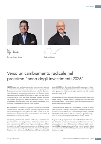 www.cpi-worldwide.com C&PI %u2013 Calcestruzzo & Prefabbricazione International %u2013 6 | 2025 3EDITORIALEVerso un cambiamento radicale nel prossimo %u201canno degli investimenti 2026%u201dIl 2025 ha portato tanti cambiamenti e, come sempre quando ci sono dei cambiamenti, %u00e8 importante come vengono gestiti. Soprattutto quando si tratta cambiamenti a livello di personale, dobbiamo sempre tenere presente che il nostro obiettivo deve essere quello di formare un team che sia pienamente presente l%u2019uno per l%u2019altro. Sebbene ognuno si occupi del proprio ambito, tutti possono, devono e hanno il diritto di guardare oltre il proprio naso, per proporre e avviare cambiamenti e miglioramenti anche in altri ambiti.Recentemente, durante un viaggio ho incontrato un cliente che ha riferito, tra l%u2019altro, di aver concluso la pianificazione del personale per il 2028 (!). Non l%u2019ho detto ad alta voce, ma dentro di me ho sentito tanta ammirazione e desiderato di essere anch%u2019io gi%u00e0 a quel punto.Per poter guardare cos%u00ec lontano nel futuro, occorrono una pianificazione e una preparazione meticolose, senza attendere cambiamenti dall%u2019esterno. Il governo tedesco nel frattempo (...) ha anch%u2019esso riconosciuto che ci debbano essere dei cambiamenti, per ripristinare quella sicurezza nella pianificazione che %u00e8 alla base della fiducia e dell%u2019imprenditorialit%u00e0 attiva. Nel 2026 in Germania si investir%u00e0 in particolare in istruzione, infrastrutture, digitalizzazione e sicurezza. Bei concetti, tutto giusto, ma chi prima di agire aspetta che ci%u00f2 accada arriver%u00e0 troppo tardi.Numerosi stabilimenti di prefabbricazione gi%u00e0 alla bauma mi hanno riferito di essere pronti a investire, ma mancano loro prospettive future e secondo me %u00e8 gi%u00e0 da troppo tempo che si attendono tempi migliori.Quando sono necessari dei cambiamenti, occorre incominciare in piccolo e bisogna farlo il prima possibile. Questo pu%u00f2 causare decisioni difficili, ma occorre sempre tenere presente ci%u00f2 che ho scritto all%u2019inizio. Chi ha un team, in grande o in piccolo, su cui pu%u00f2 fare affidamento %u00e8 sulla buona strada.Auguro a tutti gli imprenditori di avere tanta forza in tal senso, per affrontare tempi in cui bisogna prendere in mano il proprio destino. Se poi effettivamente nell%u2019anno degli investimenti 2026 si aggiungeranno influssi esterni positivi, allora sono fiducioso che a fine 2026 si potr%u00e0 parlare di dati migliori rispetto ad oggi.Dr.-Ing. Holger Karutz Gabriele Pianta