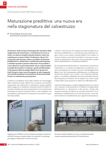 TECNICA DEL CALCESTRUZZO30 C&PI %u2013 Calcestruzzo & Prefabbricazione International %u2013 6 | 2025 www.cpi-worldwide.comDa decenni, Kraft Curing %u00e8 all%u2019avanguardia nel settore della stagionatura del calcestruzzo. L%u2019introduzione di nuovi cementi, con diversi riempitivi (idraulici latenti e inerti) che sostituiscono in parte il clinker Portland per ridurre l%u2019impronta CO2 del cemento, induce i produttori di elementi prefabbricati in calcestruzzo e calcestruzzo precompresso a chiedersi quando si possono disarmare i loro prodotti o si pu%u00f2 sbloccare la precompressione senza compromettere la qualit%u00e0 dei prodotti. In risposta a queste problematiche, l%u2019introduzione della tecnologia Match Cure da parte di Kraft Curing lo scorso anno ha segnato un altro traguardo nel controllo qualit%u00e0 per la produzione di elementi prefabbricati e in calcestruzzo precompresso.Il sistema %u00e8 progettato come vasto sistema di monitoraggio della resistenza iniziale. Match Cure consente ai produttori di garantire che l%u2019elemento in calcestruzzo appena gettato abbia raggiunto la resistenza necessaria prima di essere disarmato o di sbloccare la precompressione. Il riconoscimento tempestivo di questo momento riduce i costi energetici e di manodopera, garantendo al contempo la sicurezza e la qualit%u00e0 del prodotto. I cilindri e cubi di prova che vengono prodotti nel getto di un elemento prefabbricato o in calcestruzzo precompresso vengono messi in una camera climatica Match Cure isolata. La camera climatica consente di controllare e misurare con precisione la temperatura dei provini che corrisponde a quella interna dell%u2019elemento in calcestruzzo effettivo.Se la temperatura dell%u2019elemento in calcestruzzo aumenta (con l%u2019idratazione o un sistema di stagionatura accelerato), un%u2019unit%u00e0 di riscaldamento riscalda il provino nell%u2019alloggiamento Match Cure. Se la temperatura dell%u2019elemento in calcestruzzo scende (ad esempio con il vento o una copertura danneggiata), un ventilatore raffredda il provino portandolo almeno alla temperatura ambiente. Per le regioni con inverni rigidi %u00e8 disponibile come optional un sistema di raffreddamento.I sensori di temperatura, a scelta collegati tramite cavi o senza cavi, misurano continuamente le condizioni di stagionatura dell%u2019elemento in calcestruzzo e del provino. Questi dati vengono trasmessi al sistema di controllo AutoCure%u00ae. Se la temperatura dell%u2019elemento %u00e8 pi%u00f9 alta del provino, viene attivato il sistema di riscaldamento per regolare la temperatura. Maturazione predittiva: una nuova era nella stagionatura del calcestruzzoKraft Curing Systems GmbH, 49699 Lindern, Germanian Bertrand Delforge, JB Concrete, FranciaApril Kraft, Kraft Curing Systems, Kraft Curing Systems GmbH, Germania Integrazione di Match Cure nel sistema ecologico AutoCure di Kraft Curing per evitare sistemi di controllo e monitoraggio doppi e risparmiare in termini di costi.Camere climatiche Match Cure per complessivamente cinque aree/piste/stampi/banchi di produzione.