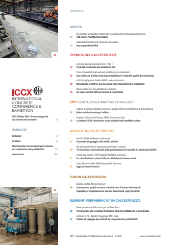 C&PI %u2013 Calcestruzzo & Prefabbricazione International %u2013 6 | 2025 www.cpi-worldwide.comCONTENUTONOVIT%u00c0Da inventore a produttore leader nella tecnologia del calcestruzzo precompresso10 100 anni di Paul MaschinenfabrikInternational Prestressed Hollowcore Association13 Nuovo presidente IPHATECNICA DEL CALCESTRUZZOCemento a bassa impronta di CO2, Parte 114 Propriet%u00e0 meccaniche del calcestruzzo LC3Prova di durabilit%u00e0 degli elementi prefabbricati in calcestruzzo22 Uso combinato di diversi test di permeabilit%u00e0 per il controllo qualit%u00e0 del calcestruzzoKraft Curing Systems GmbH, 49699 Lindern, Germania30 Maturazione predittiva: una nuova era nella stagionatura del calcestruzzoMapei GmbH, 63762 Gro%u00dfostheim, Germania36 Un nuovo servizio: EPD per miscele di calcestruzzoSistema di stampa installato sul Cantiere Digitale dell%u2019Universit%u00e0 Tecnica di Braunschweig38 Robot multifunzionale per l%u2019ediliziaProgress 3D Concrete Printing, 39042 Bressanone, Italia40 La stampa 3D del calcestruzzo: nuovi standard nella prefabbricazioneARTICOLI IN CALZESTRUZZOPeri SE, 89264 Wei%u00dfenhorn, Germania 44%u0009 Il pannello di appoggio nella verifica dei fattiDa subito possibilit%u00e0 di registrazione online per i visitatori48 13a Conferenza Internazionale sulle pavimentazioni in masselli di calcestruzzo (ICCBP)Hess Group GmbH, 57299 Burbach-Wahlbach, Germania52 Da radici familiari a visioni di futuro: Micheletto PavimentazioniKobra Formen GmbH, 08485 Lengenfeld, Germania58 Oggi plasmare il domaniTUBI IN CALCESTRUZZOAfinitas, Clayton, MO 63105 USA64 Automazione, qualit%u00e0 e cultura aziendale sono il motore del nuovo di impianto per la produzione di tubi alla Nansemond, negli Stati UnitiELEMENTI PREFABBRICATI IN CALCESTRUZZOBreve panoramica dello status quo nei Paesi Bassi68%u0009 Pianificazione per il riutilizzo di strutture portanti prefabbricate in calcestruzzoEdilmatic S.P.A., 460202 Pegognaga (MN), Italia76 Sistemi de appoggio per pannelli de tamponamento prefabbricati6430ICCX T%u00fcrkiye 2026 %u2013 Evento inaugurale con interessanti interventi 8RUBRICHEEditoriale 3Colofone 6Manifestazioni internazionali per l%u2019industria del calcestruzzo e dei prefabbricati 13Inserzionisti 105INTERNATIONAL CONCRETECONFERENCE & EXHIBITION