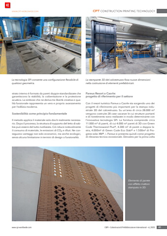 www.cpi-worldwide.com C&PI %u2013 Calcestruzzo & Prefabbricazione International %u2013 6 | 2025 41strato interno %u00e8 formato da pareti doppie standardizzate che garantiscono la stabilit%u00e0, la coibentazione e la protezione acustica. La simbiosi che ne deriva tra libert%u00e0 creativa e qualit%u00e0 funzionale rappresenta un vero e proprio avanzamento per l%u2019edilizia moderna.Sostenibilit%u00e0 come principio fondamentaleIl metodo applica il materiale solo dov%u2019%u00e8 realmente necessario. Dopo il processo, la struttura di supporto del letto di sabbia pu%u00f2 essere del tutto riutilizzata. Ci%u00f2 riduce notevolmente il consumo di materiale, le emissioni di CO2 e rifiuti. Ne conseguono vantaggi non solo economici, ma anche ecologici, senza alcuna limitazione in termini di design o funzionalit%u00e0.Pareus Resort a Caorle: progetto di riferimento per il settoreCon il resort turistico Pareus a Caorle sta sorgendo uno dei progetti di riferimento pi%u00f9 importanti per la stampa industriale 3D del calcestruzzo. Su un%u2019area di circa 28.000 m%u00b2 vengono costruite 28 case vacanze le cui strutture portanti e di rivestimento sono realizzate in modo determinante con l%u2019innovativa tecnologia SPI. La fornitura comprende circa 11.000 m%u00b2 di paerti, di cui 4.000 m%u00b2 pareti di 3D con Green Code Thermowand Plus%u00ae, 4.300 m%u00b2 di pareti a doppia lastra, 4.000m%u00b2 di Green Code Eco Slab%u00ae e 1.500m%u00b2 di Progress solai XM%u00ae. i. Pareus si presenta quindi come progetto di rilevanza tecnica eccezionale. Dimostra per la prima volta La tecnologia SPI consente una configurazione flessibile di qualsiasi geometria.La stampante 3D del calcestruzzo fissa nuove dimensioni nella costruzione di elementi prefabbricati.Elemento di parete con effetto mattoni stampato in 3D.