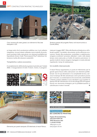 42 C&PI %u2013 Calcestruzzo & Prefabbricazione International %u2013 6 | 2025 www.cpi-worldwide.comALTRE INFORMAZIONIProgress 3D Concrete PrintingJulius-Durst-Stra%u00dfe 10039042 Bressanone, ItaliaT +39 0472 9791003d@progress-m.comwww.progress-3d.comsu larga scala che la produzione additiva non %u00e8 pi%u00f9 soltanto integrativa, ma pu%u00f2 essere utilizzata come metodo di produzione portante nella costruzione con elementi prefabbricati. Soprattutto Green Code Thermowand Plus%u00ae sottolinea l%u2019attenzione rivolta alle soluzioni sostenibili.Tempistiche e valore economicoIl completamento della struttura grezza %u00e8 previsto per l'estate 2026. L%u2019inaugurazione di tutto il resort, invece, %u00e8 programmata per maggio 2027. Oltre alla libert%u00e0 architettonica e all%u2019elevata qualit%u00e0, il prodotto documenta anche efficienza economica. Grazie alla produzione controllata in stabilimento, vengono accelerati i processi, abbattuti i costi e allo stesso tempo viene assicurato un livello di massima precisione. In questo modo le risorse vengono impiegate in modo ottimale rispettando i tempi di realizzazione.Un modello internazionaleIl resort Pareus rappresenta un punto di riferimento per le grandi opere future nella costruzione con elementi prefabbricati. Con le sue dimensioni e la complessit%u00e0 tecnica, sancisce la stampa 3D del calcestruzzo come procedura pronta per il mercato. La combinazione di economicit%u00e0, sostenibilit%u00e0 e libert%u00e0 creativa stabilisce nuovi standard e pu%u00f2 rendere la stampa 3D del calcestruzzo con la tecnologia SPI di Progress Group uno strumento strategico per la prefabbricazione in calcestruzzo in tutto il mondo. nCasa vacanze allo stato grezzo con elementi di facciata stampato in 3D.Struttura grezza del progetto Pareus nel resort turistico a Caorle (Italia).Elemento per pareti stampato 3D destinato al resort Pareus.Video sulla relazionePROGRESS GROUP ha sponsorizzato la possibilit%u00e0 di scaricare gratuitamente il pdf di questo articolo per tutti i lettori di CuPI. Vi preghiamo di verificare il sito web www.cpi-worldwide.com/channels/progressgroup oppure di fare la scansione del codice QR con il Vostro smartphone per avere accesso diretto a questo sito web.
