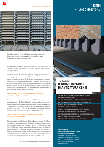 ARTICOLI IN CALCESTRUZZOC&PI %u2013 Calcestruzzo & Prefabbricazione International %u2013 6 | 2025dalla penetrazione incontrollata di acqua, anche in caso di elevata umidit%u00e0 dell'aria o condizioni estreme nelle camere di stagionatura. %u201cIl nostro punto di forza vero e proprio sta proprio l%u00e0 dove alcuni suppongono il punto debole del nostro prodotto: sfruttiamo le propriet%u00e0 naturali del legno consentendo consapevolmente un esiguo assorbimento e rilascio dell%u2019umidit%u00e0, in modo controllato e in linea con le propriet%u00e0 naturali del legno come materia prima. In questo modo, il nostro prodotto affronta miratamente le sfide che si presentano nel processo di produzione%u201d, spiega Kathrin Wunder. Dato di fatto 3: Un rivestimento smart riduce al minimo il bisogno di disarmante Il rivestimento speciale resistente all%u2019abrasione provvede a parti posteriori dei blocchi pulite e riduce al minimo anche l%u2019uso di disarmanti grazie al suo speciale effetto separazione. %u201cLa maggior parte dei nostri clienti lavora del tutto senza disarmante, quindi oltre a proteggere l%u2019ambiente abbatte anche i costi di esercizio%u201d, afferma Kathrin Wunder. Dato di fatto 4: Durevole e sostenibile grazie al nuovo rivestimento Rispetto ai pannelli in legno dolce a buon mercato, Peri Pave si distingue per una vita utile molto pi%u00f9 lunga e un processo di produzione ottimizzato. In questo modo, il bilancio complessivo migliora in modo sostenibile. Grazie a una trasmissione delle vibrazioni ottimale e uniforme, l'energia e il tempo di vibrazione possono essere notevolmente ridotti e mantenuti costantemente bassi. Allo stesso tempo, i clienti beneficiano di una qualit%u00e0 sempre elevata dei loro prodotti finali. Peri Pave da anni viene utilizzato con successo anche in camere chiuse e vaporizzate, come qui nel caso della ditta BWL di W%u00f6rth a.d. Isar.%u00b7 \%u00b7 PAVIMENTAZIONI E LASTRE%u00b7 BLOCCHI PER MURATURA A SECCO IN TUTTE LE VARIANTI%u00b7 ANTICATURA DOPO UN TEMPO DI PRESA DI SOLE 24 ORE%u00b7 ALTEZZE PRODOTTO DA 50 MM A 400 MM%u00b7 STRUTTURA SUPERCOMPATTA%u00b7 TEMPO CICLO PER PAVIMENTAZIONI 10 - 15 SECONDI%u00b7 INTENSIT%u00c0 DEL TRATTAMENTO SELEZIONABILE%u00b7 PRODUZIONE MAGGIORE GRAZIE AD UN'ALTA DISPONIBILIT%u00c0%u00b7 BASSA ESIGENZA DI MANUTENZIONE%u00b7 TEMPI DI PREPARAZIONE MINIMI (1 - 5 MINUTI)%u201cIL GENIO%u201dIL NUOVO IMPIANTODI ANTICATURA KBH II%u00aeBaustoffwerke Gebhart & S%u00f6hne GmbH & Co. KG KBH MaschinenbauEin%u00f6de 2 , D-87760 LachenTelefono +49 (0) 83 31- 95 03-0Fax +49 (0) 83 31- 95 03-40maschinen@k-b-h.dewww.k-b-h.de