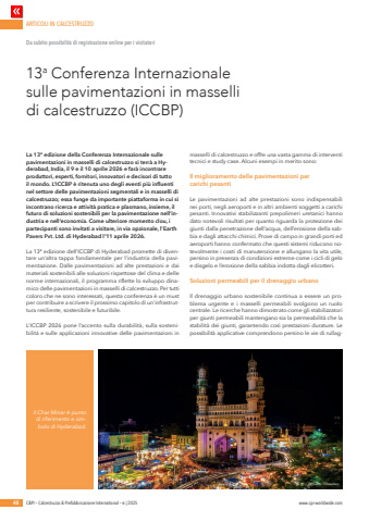 ARTICOLI IN CALCESTRUZZO48 C&PI %u2013 Calcestruzzo & Prefabbricazione International %u2013 6 | 2025 www.cpi-worldwide.comLa 13%u00aa edizione della Conferenza Internazionale sulle pavimentazioni in masselli di calcestruzzo si terr%u00e0 a Hyderabad, India, il 9 e il 10 aprile 2026 e far%u00e0 incontrare produttori, esperti, fornitori, innovatori e decisori di tutto il mondo. L%u2019ICCBP %u00e8 ritenuta uno degli eventi pi%u00f9 influenti nel settore delle pavimentazioni segmentali e in masselli di calcestruzzo; essa funge da importante piattaforma in cui si incontrano ricerca e attivit%u00e0 pratica e plasmano, insieme, il futuro di soluzioni sostenibili per la pavimentazione nell%u2019industria e nell%u2019economia. Come ulteriore momento clou, i partecipanti sono invitati a visitare, in via opzionale, l%u2019Earth Pavers Pvt. Ltd. di Hyderabad l%u201911 aprile 2026.La 13%u00aa edizione dell%u2019ICCBP di Hyderabad promette di diventare un%u2019altra tappa fondamentale per l%u2019industria della pavimentazione. Dalle pavimentazioni ad alte prestazioni e dai materiali sostenibili alle soluzioni rispettose del clima e delle norme internazionali, il programma riflette lo sviluppo dinamico delle pavimentazioni in masselli di calcestruzzo. Per tutti coloro che ne sono interessati, questa conferenza %u00e8 un must per contribuire a scrivere il prossimo capitolo di un%u2019infrastruttura resiliente, sostenibile e futuribile.L%u2019ICCBP 2026 pone l%u2019accento sulla durabilit%u00e0, sulla sostenibilit%u00e0 e sulle applicazioni innovative delle pavimentazioni in masselli di calcestruzzo e offre una vasta gamma di interventi tecnici e study case. Alcuni esempi in merito sono:Il miglioramento delle pavimentazioni per carichi pesantiLe pavimentazioni ad alte prestazioni sono indispensabili nei porti, negli aeroporti e in altri ambienti soggetti a carichi pesanti. Innovativi stabilizzanti prepolimeri uretanici hanno dato notevoli risultati per quanto riguarda la protezione dei giunti dalla penetrazione dell%u2019acqua, dell%u2019erosione della sabbia e dagli attacchi chimici. Prove di campo in grandi porti ed aeroporti hanno confermato che questi sistemi riducono notevolmente i costi di manutenzione e allungano la vita utile, persino in presenza di condizioni estreme come i cicli di gelo e disgelo e l%u2019erosione della sabbia indotta dagli elicotteri.Soluzioni permeabili per il drenaggio urbanoIl drenaggio urbano sostenibile continua a essere un problema urgente e i masselli permeabili svolgono un ruolo centrale. Le ricerche hanno dimostrato come gli stabilizzatori per giunti permeabili mantengano sia la permeabilit%u00e0 che la stabilit%u00e0 dei giunti, garantendo cos%u00ec prestazioni durature. Le possibilit%u00e0 applicative comprendono persino le vie di rullag13a Conferenza Internazionale sulle pavimentazioni in masselli di calcestruzzo (ICCBP)Da subito possibilit%u00e0 di registrazione online per i visitatori%u00a9Prudhvi ChowdaryIl Char Minar %u00e8 punto di riferimento e simbolo di Hyderabad.