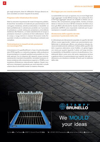 ARTICOLI IN CALCESTRUZZOwww.cpi-worldwide.com C&PI %u2013 Calcestruzzo & Prefabbricazione International %u2013 6 | 2025 49gio negli aeroporti, dove le infiltrazioni d%u2019acqua devono essere conciliate con severi requisiti di sicurezza.Progresso nelle infrastrutture ferroviarieVista la crescente importanza dei mezzi di trasporto pubblici, le banchine necessitano di materiali per pavimentazioni che coniugano resistenza, antisdrucciolevolezza e durabilit%u00e0. Le lastre prefabbricate in calcestruzzo prodotte con il processo di pressatura a umido sottovuoto presentano un%u2019eccellente resistenza alla flessione, un basso assorbimento di acqua e prestazioni durature in presenza di forti sollecitazioni. Studi di campo a lungo termine in stazioni ferroviarie molto frequentate in India ne confermano l%u2019idoneit%u00e0 per ambienti cos%u00ec complessi.Pavimentazione in masselli ad alte prestazioni con tecnologia PCEL%u2019introduzione di superfluidificanti a base di policarbossilati eteri (PCE) significa un notevole progresso nella produzione di pavimentazioni in masselli autobloccanti prodotti con il metodo wetcast. Con la riduzione del rapporto acqua-cemento mantenendo invariata la lavorabilit%u00e0, i produttori possono ottenere resistenze alla compressione superiori a 70 MPa e una resistenza all%u2019abrasione notevolmente migliore. Questi masselli sono interessanti soprattutto per aree aziendali e strade urbane dove la durabilit%u00e0 riveste la massima rilevanza.Riciclaggio per una crescita sostenibileLa sostenibilit%u00e0 non %u00e8 pi%u00f9 un'opzione, ma un must. Dagli studi sugli aggregati riciclati (RCA) emerge che sostituendo fino al 50 % gli aggregati naturali nei masselli si ottiene una resistenza alla compressione paragonabile, mentre al tempo stesso si riducono di circa il 30 % le emissioni di CO2 e di un terzo gli effetti sulle discariche. Questi risultati sottolineano il potenziale dell%u2019RCA come importante materiale per le pavimentazioni in masselli ecosostenibili.Sfruttamento delle superfici dei tetti: aumentare il potenziale delle citt%u00e0In citt%u00e0 sempre pi%u00f9 densamente popolate, le superfici dei tetti offrono nuove opportunit%u00e0. I sistemi per pavimentazioni prefabbricate in calcestruzzo offrono una soluzione robusta, duratura ed esteticamente valida per l%u2019utilizzo delle superfici dei tetti e superano alternative come l%u2019asfalto o la ghiaia legata con resina per quanto riguarda il valore nel lungo termine, la riparabilit%u00e0 e la flessibilit%u00e0 in termini di pianificazione. Considerando fattori come carico del vento, espansione termica e gestione idrica, le pavimentazioni per superfici dei tetti costituiscono una soluzione orientata al futuro per la resilienza delle citt%u00e0.