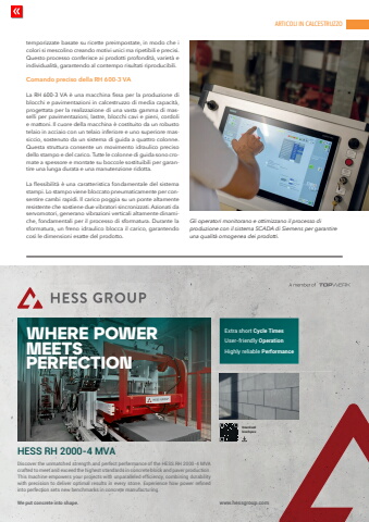 ARTICOLI IN CALCESTRUZZOwww.cpi-worldwide.com C&PI %u2013 Calcestruzzo & Prefabbricazione International %u2013 6 | 2025 53temporizzate basate su ricette preimpostate, in modo che i colori si mescolino creando motivi unici ma ripetibili e precisi. Questo processo conferisce ai prodotti profondit%u00e0, variet%u00e0 e individualit%u00e0, garantendo al contempo risultati riproducibili.Comando preciso della RH 600-3 VALa RH 600-3 VA %u00e8 una macchina fissa per la produzione di blocchi e pavimentazioni in calcestruzzo di media capacit%u00e0, progettata per la realizzazione di una vasta gamma di masselli per pavimentazioni, lastre, blocchi cavi e pieni, cordoli e mattoni. Il cuore della macchina %u00e8 costituito da un robusto telaio in acciaio con un telaio inferiore e uno superiore massiccio, sostenuto da un sistema di guida a quattro colonne. Questa struttura consente un movimento idraulico preciso dello stampo e del carico. Tutte le colonne di guida sono cromate a spessore e montate su boccole sostituibili per garantire una lunga durata e una manutenzione ridotta.La flessibilit%u00e0 %u00e8 una caratteristica fondamentale del sistema stampi. Lo stampo viene bloccato pneumaticamente per consentire cambi rapidi. Il carico poggia su un ponte altamente resistente che sostiene due vibratori sincronizzati. Azionati da servomotori, generano vibrazioni verticali altamente dinamiche, fondamentali per il processo di sformatura. Durante la sformatura, un freno idraulico blocca il carico, garantendo cos%u00ec le dimensioni esatte del prodotto.Gli operatori monitorano e ottimizzano il processo di produzione con il sistema SCADA di Siemens per garantire una qualit%u00e0 omogenea dei prodotti.www.hessgroup.comDiscover the unmatched strength and perfect performance of the HESS RH 2000-4 MVAcrafted to meet and exceed the highest standards in concrete block and paver production.This machine empowers your projects with unparalleled effi ciency, combining durability with precision to deliver optimal results in every stone. Experience how power refi nedinto perfection sets new benchmarks in concrete manufacturing.We put concrete into shape.Extra short Cycle TimesUser-friendly OperationHighly reliable PerformanceWHERE POWERMEETSPERFECTIONHESS RH 2000-4 MVADownloadbrochures