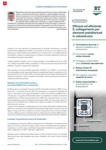 ELEMENTI PREFABBRICATI IN CALCESTRUZZOwww.cpi-worldwide.com C&PI %u2013 Calcestruzzo & Prefabbricazione International %u2013 6 | 2025Inoltre, ha un ruolo decisivo la combinazione di prodotti. Ad esempio, un solaio parzialmente prefabbricato dotato di uno strato di armatura e di un getto di completamento: mentre l'elemento prefabbricato in calcestruzzo in s%u00e9 sarebbe facile da smantellare, il getto di completamento e lo strato di armatura applicato rendono lo smantellamento quasi impossibile!L%u2019ideale sarebbe ritardare il pi%u00f9 a lungo possibile lo smantellamento di un edificio. L'edificio dovrebbe essere progettato in modo tale da poter essere facilmente adattato a funzioni e applicazioni cambiate.Solo quando non %u00e8 pi%u00f9 possibile apportare modifiche a un edificio, i suoi componenti dovrebbero poter essere facilmente smantellati per essere riutilizzati in un'altra applicazione o in un altro edificio. Questo approccio prolunga notevolmente la durata dei materiali e riduce l'impatto ambientale. Il tema del presente articolo %u00e8 il riutilizzo di elementi portanti.Riutilizzo di vecchie/attuali strutture portanti prefabbricate in calcestruzzoEU ReCreate %u00e8 un progetto finanziato dall%u2019UE nell%u2019ambito di Horizon 2020. %u00c8 composto da 11 pacchetti di lavoro (AP) che perseguono un approccio globale alla ricerca e alla pratica nel campo dell'edilizia circolare con elementi prefabbricati in calcestruzzo. Il progetto UE ReCreate studia le possibilit%u00e0 di riutilizzo di elementi prefabbricati in calcestruzzo provenienti da edifici che originariamente non erano stati progettati per essere riutilizzati. Poich%u00e9 questi edifici non sono stati costruiti in vista di uno smantellamento, solitamente il taglio con seghe %u00e8 il metodo di smantellamento pi%u00f9 comune.Tuttavia, alcuni progetti e configurazioni di prova hanno dimostrato strategie dettagliate che consentono di smantellare facilmente gli edifici senza ricorrere a lavori di taglio su larga scala. Se un edificio pu%u00f2 essere smantellato senza ricorrere al taglio, ci%u00f2 ha un effetto positivo sulla dichiarazione ambientale di prodotto (EPD) del processo di smantellamento e quindi anche sulla sostenibilit%u00e0 del prodotto riutilizzato.Il palazzo di giustizia provvisorio di AmsterdamLa progettazione di questo edificio completamente riutilizzabile mira a garantire che, dopo il suo primo periodo di utilizzo, possa essere completamente smantellato e ricostruito in un altro luogo. L%u2019architetto (Cepezed) ha esaminato le possibilit%u00e0 di ridurre, riutilizzare e riciclare i materiali su ogni scala.Elementi quali il rivestimento della facciata, le scale, le lastre di vetro e le maniglie delle porte sono stati progettati per essere riutilizzati, cos%u00ec come l'intera struttura portante.n Ronald Klein-Holte %u00e8 stato responsabile della divisione Ricerca e Sviluppo di VBI Ontwikkeling B.V., un%u2019azienda del Consolis Group nei Paesi Bassi. In qualit%u00e0 di ingegnere civile qualificato, ha lavorato per circa 4 anni nel settore della progettazione strutturale, concentrandosi in particolare sulla costruzione e sull'applicazione di sistemi di solai alveolari in calcestruzzo precompresso. Dopo aver iniziato a lavorare presso VBI nel 1987, ha promosso l'innovazione nel campo delle soluzioni prefabbricate in calcestruzzo e, in qualit%u00e0 di presidente del CEN TC229/WG1/TG1, ha collaborato attivamente alla norma europea EN 1168 sui solai alveolari in calcestruzzo precompresso. %u00c8 membro di diversi comitati tecnici olandesi e internazionali, tra cui la fib Commissione 6 (prefabbricazione) e organismi nazionali sulle costruzioni in calcestruzzo, la protezione antincendio e il riutilizzo di componenti. r.klein-holte@vbi.nlEfficace ed efficiente: IL collegamento per elementi prefabbricati in calcestruzzoB.T. INNOVATION GMBHwww.bt-innovation.deConnessione durevole di elementi prefabbricati in calcestruzzoConnessione senza colata mineraleMontaggio indipendente dalle condizioni atmosfericheNessun tempo di indurimento necessarioImmediata e completa capacit%u00e0 di caricoSubito impermeabile in combinazione con RubberElast%u00aeRubberElast%u00aeBT-Spannschloss%u00aePer costruire pi%u00f9 velocemente
