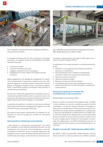 ELEMENTI PREFABBRICATI IN CALCESTRUZZOwww.cpi-worldwide.com C&PI %u2013 Calcestruzzo & Prefabbricazione International %u2013 6 | 2025 71Il sovradimensionamento non solo aumenta la robustezza strutturale, ma migliora anche la riutilizzabilit%u00e0. %u00c8 possibile ottenere ci%u00f2 tramite:%u2022 campate pi%u00f9 ampie%u2022 aumento dell'altezza dei locali%u2022 maggiore capacit%u00e0 di carico di progetto%u2022 progettazione di solai a lastre che fungono da solai intermediNella progettazione dei dettagli dei collegamenti la semplicit%u00e0 %u00e8 fondamentale. %u00c8 importante rendersi conto che collegamenti aggiuntivi o speciali possono comportare costi pi%u00f9 elevati, un maggiore impatto di CO2 e una minore riutilizzabilit%u00e0, in particolare quando si impiegano solai alveolari in calcestruzzo precompresso.Pi%u00f9 dati sono disponibili sugli elementi riutilizzabili, pi%u00f9 accuratamente %u00e8 possibile determinarne la capacit%u00e0 di carico. Un passaporto dei materiali pu%u00f2 fornire informazioni sulla cronologia e sulle materie prime utilizzate in un prodotto.La garanzia di qualit%u00e0 per i prodotti da costruzione riutilizzati deve essere ulteriormente sviluppata ed %u00e8 oggetto di uno dei pacchetti di lavoro del progetto ReCreate.Per quanto %u00e8 dato sapere, attualmente non esistono n%u00e9 certificazioni n%u00e9 marchi di qualit%u00e0 per i prodotti da costruzione riutilizzabili.Solai alveolari in calcestruzzo precompressoI solai alveolari in calcestruzzo precompresso sono ideali per il riutilizzo. La loro sezione trasversale prismatica, sia nel calcestruzzo che nell'acciaio di precompressione, consente di adattare le dimensioni senza una perdita significativa dei dettagli di rinforzo. Grazie all'utilizzo ottimale del calcestruzzo e dell'acciaio di armatura, i solai alveolari in calcestruzzo precompresso rappresentano gi%u00e0 oggi la scelta logica per ridurre al minimo l'impatto di CO2.Caratteristiche di un solaio alveolare in calcestruzzo precompresso%u2022 Prodotto su una lunga linea di produzione mediante estrusione o vibrofinitura%u2022 Precompressione solo in direzione longitudinale mediante l'utilizzo di acciaio di precompressione%u2022 Nessuna armatura trasversale%u2022 Nessuna armatura di taglio%u2022 Nessuna armatura di trazione indiretta%u2022 La resistenza alla trazione del calcestruzzo %u00e8 una propriet%u00e0 importante per un solaio alveolare in calcestruzzo precompresso!Esempi di progettazione orientata allo smantellamento e alla ricostruzioneModello Peikko / Consolis Parma (2021)Grazie ai risultati promettenti del progetto pilota, nel 2021 %u00e8 stato realizzato un secondo modello pi%u00f9 grande. Anzich%u00e9 smantellare e ricostruire semplici elementi di sostegno, %u00e8 stata presa in considerazione l'intera struttura portante. Consolis Parma ha fornito elementi prefabbricati in calcestruzzo e i test sono stati effettuati in collaborazione con Peikko. Grazie all'utilizzo degli stessi collegamenti, la ricostruzione della struttura portante %u00e8 avvenuta senza problemi, proprio come la prima configurazione. Evidente la conclusione: la tecnologia dei collegamenti a vite offre la fattibilit%u00e0 tecnica per un riutilizzo efficace delle strutture portanti prefabbricate in calcestruzzo.Modello Consolis VBI / Peikko Benelux (2024-2025)Nel 2024 e 2025 Consolis VBI e Peikko Benelux insieme hanno costruito la struttura portante di un edificio costituita Fig. 5: Modello di grandi dimensioni, realizzato da Peikko e Consolis Parma nel 2021Fig. 6: Modello di grandi dimensioni realizzato da Consolis VBI e Peikko Benelux tra il 2024 e il 2025