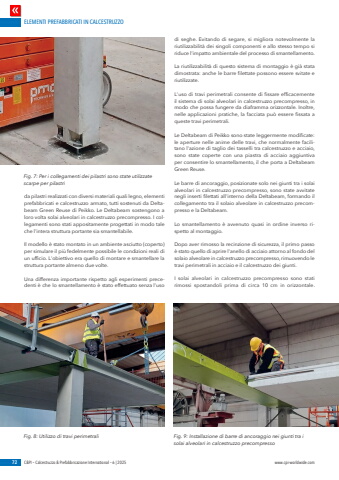 ELEMENTI PREFABBRICATI IN CALCESTRUZZO72 C&PI %u2013 Calcestruzzo & Prefabbricazione International %u2013 6 | 2025 www.cpi-worldwide.comda pilastri realizzati con diversi materiali quali legno, elementi prefabbricati e calcestruzzo armato, tutti sostenuti da Deltabeam Green Reuse di Peikko. Le Deltabeam sostengono a loro volta solai alveolari in calcestruzzo precompresso. I collegamenti sono stati appositamente progettati in modo tale che l'intera struttura portante sia smantellabile.Il modello %u00e8 stato montato in un ambiente asciutto (coperto) per simulare il pi%u00f9 fedelmente possibile le condizioni reali di un ufficio. L'obiettivo era quello di montare e smantellare la struttura portante almeno due volte.Una differenza importante rispetto agli esperimenti precedenti %u00e8 che lo smantellamento %u00e8 stato effettuato senza l'uso di seghe. Evitando di segare, si migliora notevolmente la riutilizzabilit%u00e0 dei singoli componenti e allo stesso tempo si riduce l'impatto ambientale del processo di smantellamento.La riutilizzabilit%u00e0 di questo sistema di montaggio %u00e8 gi%u00e0 stata dimostrata: anche le barre filettate possono essere svitate e riutilizzate.L'uso di travi perimetrali consente di fissare efficacemente il sistema di solai alveolari in calcestruzzo precompresso, in modo che possa fungere da diaframma orizzontale. Inoltre, nelle applicazioni pratiche, la facciata pu%u00f2 essere fissata a queste travi perimetrali.Le Deltabeam di Peikko sono state leggermente modificate: le aperture nelle anime delle travi, che normalmente facilitano l'azione di taglio dei tasselli tra calcestruzzo e acciaio, sono state coperte con una piastra di acciaio aggiuntiva per consentire lo smantellamento, il che porta a Deltabeam Green Reuse.Le barre di ancoraggio, posizionate solo nei giunti tra i solai alveolari in calcestruzzo precompresso, sono state avvitate negli inserti filettati all'interno della Deltabeam, formando il collegamento tra il solaio alveolare in calcestruzzo precompresso e la Deltabeam.Lo smantellamento %u00e8 avvenuto quasi in ordine inverso rispetto al montaggio.Dopo aver rimosso la recinzione di sicurezza, il primo passo %u00e8 stato quello di aprire l'anello di acciaio attorno al fondo del solaio alveolare in calcestruzzo precompresso, rimuovendo le travi perimetrali in acciaio e il calcestruzzo dei giunti.I solai alveolari in calcestruzzo precompresso sono stati rimossi spostandoli prima di circa 10 cm in orizzontale. Fig. 7: Per i collegamenti dei pilastri sono state utilizzate scarpe per pilastriFig. 8: Utilizzo di travi perimetrali Fig. 9: Installazione di barre di ancoraggio nei giunti tra i solai alveolari in calcestruzzo precompresso