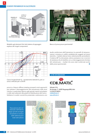 ELEMENTI PREFABBRICATI IN CALCESTRUZZO78 C&PI %u2013 Calcestruzzo & Prefabbricazione International %u2013 6 | 2025 www.cpi-worldwide.comproccio a fessura diffusa (rotating smeared crack approach) per valutare il danneggiamento del calcestruzzo nelle zone critiche, in particolare attorno agli spinotti inseriti nel pilastro e nelle aree adiacenti alla piastra di distribuzione del carico.Sebbene le analisi numeriche presentate costituiscano uno studio preliminare dell%u2019interazione tra pannelli di tamponamento e struttura in edifici prefabbricati soggetti ad azioni sismiche, i risultati ottenuti sono estremamente promettenti. Il sistema MT ha dimostrato ottime prestazioni sia in termini di resistenza che di duttilit%u00e0, con un danneggiamento limitato del calcestruzzo %u2014 risultati che sono stati confermati anche dalle prove sperimentali. nALTRE INFORMAZIONIEdilmatic S.P.A.Via Gonzaga, 11, 46020 Pegognaga (MN), ItaliaT+39 0376 558225 info@edilmatic.it www.edilmatic.itRModello agli elementi finiti del sistema di appoggio: esploso dei singoli componentiBanco di prova prove sperimentaliFessurazione del calcestruzzo nell%u2019intorno degli spinotti annegati nel pilastro e contour delle deformazioni totali del bulloneCarico longitudinale Fy %u2013 spostamento laterale %u03b4 y per un carico verticale pari a 20 kN