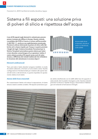 ELEMENTI PREFABBRICATI IN CALCESTRUZZO80 C&PI %u2013 Calcestruzzo & Prefabbricazione International %u2013 6 | 2025 www.cpi-worldwide.comL%u2019uso di fili esposti negli elementi in calcestruzzo precompresso %u00e8 sempre pi%u00f9 diffuso in Europa. Questo metodo, convalidato dal CSTB in Francia, %u00e8 incluso nell%u2019Eurocodice 2, EN1992-1-1, anche se non esplicitamente menzionato. Previene la silicosi eliminando la polvere di silice nelle fabbriche ed %u00e8 a basso impatto per l%u2019acqua, in quanto previene i fanghi dei tagli. Il sistema brevettato Prensoland per la finitrice Tensyland automatizza questo sistema per lastre e travi alveolari, senza bisogno di un operatore. Inoltre, il nostro sistema produce fili esposti senza scarti di calcestruzzo, a differenza dei metodi tradizionali che richiedono la rimozione del calcestruzzo in eccesso dopo il Elementi unidirezionaliTravi, pre-solai e lastre alveolari vengono installati, in modo da essere adiacenti, a formare un%u2019unica lastra coesa. Questa configurazione %u00e8 fondamentale per resistere alle spinte laterali del vento o dei terremoti, in quanto impedisce lo spostamento relativo tra le lastre. Azione delle forze orizzontaliPer massimizzare l%u2019attrito ed evitare la separazione, le lastre devono essere a stretto contatto. I fili esposti aumentano questo attrito interferendo con le staffe delle travi di supporto e assicurando che le piastre rimangano unite. Questo metodo previene la silicosi e rispetta l%u2019acqua, riducendone il fabbisogno ed evitando la formazione di fanghi. Sistema a fili esposti: una soluzione priva di polveri di silicio e rispettosa dell%u2019acquaPrensoland S.A., 08592 Sant Mart%u00ed de Centelles, Barcellona, SpagnaAzione delle forze orizzontali, dovute al vento o ai terremoti, sulle solette