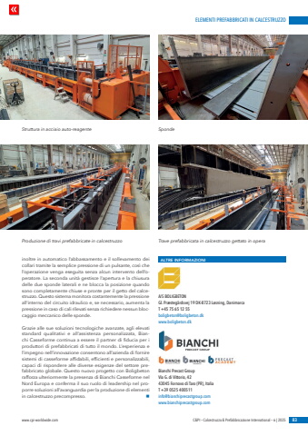 ELEMENTI PREFABBRICATI IN CALCESTRUZZOwww.cpi-worldwide.com C&PI %u2013 Calcestruzzo & Prefabbricazione International %u2013 6 | 2025 83inoltre in automatico l%u2019abbassamento e il sollevamento dei collari tramite la semplice pressione di un pulsante, cos%u00ec che l%u2019operazione venga eseguita senza alcun intervento dell%u2019operatore. La seconda unit%u00e0 gestisce l%u2019apertura e la chiusura delle due sponde laterali e ne blocca la posizione quando sono completamente chiuse e pronte per il getto del calcestruzzo. Questo sistema monitora costantemente la pressione all%u2019interno del circuito idraulico e, se necessario, aumenta la pressione in caso di cali rilevati senza richiedere nessun bloccaggio meccanico delle sponde.Grazie alle sue soluzioni tecnologiche avanzate, agli elevati standard qualitativi e all%u2019assistenza personalizzata, Bianchi Casseforme continua a essere il partner di fiducia per i produttori di prefabbricati di tutto il mondo. L%u2019esperienza e l%u2019impegno nell%u2019innovazione consentono all%u2019azienda di fornire sistemi di casseforme affidabili, efficienti e personalizzabili, capaci di rispondere alle diverse esigenze del settore prefabbricato globale. Questo nuovo progetto con Boligbeton rafforza ulteriormente la presenza di Bianchi Casseforme nel Nord Europa e conferma il suo ruolo di leadership nel proporre soluzioni all%u2019avanguardia per la produzione di elementi in calcestruzzo precompresso. nALTRE INFORMAZIONIA/S BOLIGBETON Gl. Pr%u00e6steg%u00e5rdsvej 19 DK-8723 L%u00f8sning, DanimarcaT +45 75 65 12 55boligbeton@boligbeton.dkwww.boligbeton.dkBianchi Precast Group Via G. di Vittorio, 42 43045 Fornovo di Taro (PR), Italia T +39 0525 400511 info@bianchiprecastgroup.com www.bianchiprecastgroup.com Struttura in acciaio auto-reagenteProduzione di travi prefabbricate in calcestruzzoSpondeTrave prefabbricata in calcestruzzo gettato in opera
