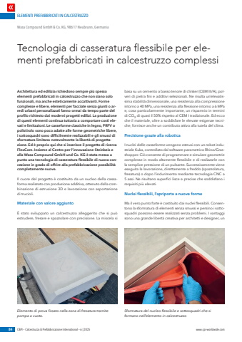ELEMENTI PREFABBRICATI IN CALCESTRUZZO84 C&PI %u2013 Calcestruzzo & Prefabbricazione International %u2013 6 | 2025 www.cpi-worldwide.comArchitettura ed edilizia richiedono sempre pi%u00f9 spesso elementi prefabbricati in calcestruzzo che non siano solo funzionali, ma anche esteticamente accattivanti. Forme complesse e libere, elementi per facciate senza giunti o arredi urbani personalizzati fanno ormai da tempo parte del profilo richiesto dai moderni progetti edilizi. La produzione di questi elementi continua tuttavia a comportare costi elevati e limitazioni. Le casseforme classiche in legno, PRFV o polistirolo sono poco adatte alle forme geometriche libere, i sottosquadri sono difficilmente realizzabili e gli smussi di sformatura limitano notevolmente la libert%u00e0 di progettazione. Ed %u00e8 proprio qui che si inserisce il progetto di ricerca FlexCore. Insieme al Centro per l%u2019innovazione Steinbeis e alla Wasa Compound GmbH und Co. KG %u00e8 stata messa a punto una tecnologia di casseratura flessibile di nuova concezione in grado di offrire alla prefabbricazione possibilit%u00e0 completamente nuove.Il cuore del progetto %u00e8 costituito da un nucleo della cassaforma realizzato con produzione additiva, ottenuto dalla combinazione di estrusione 3D e lavorazione con asportazione di trucioli.Materiale con valore aggiunto%u00c8 stato sviluppato un calcestruzzo alleggerito che si pu%u00f2 estrudere, fresare e spazzolare con precisione. La miscela si basa su un cemento a basso tenore di clinker (CEM III/A), polveri di pietra fini e additivi selezionati. Ne risulta un%u2019elevatissima stabilit%u00e0 dimensionale, una resistenza alla compressione intorno a 40 MPa, una resistenza alla flessione intorno a 6 MPa e, cosa particolarmente importante, un risparmio in termini di CO2 di quasi il 50% rispetto al CEM I tradizionale. Ed ecco che il materiale, oltre a soddisfare le elevate esigenze tecniche, fornisce anche un contributo attivo alla tutela del clima.Precisione grazie alla roboticaI nuclei delle casseforme vengono estrusi con un robot industriale Kuka, controllato dal software parametrico Rhino/Grasshopper. Ci%u00f2 consente di programmare e simulare geometrie complesse in modo altamente flessibile e di realizzarle con la semplice pressione di un pulsante. Successivamente viene eseguita la lavorazione, direttamente a freddo (spazzolatura, fresatura) o dopo l'indurimento mediante tecnologia CNC a 5 assi. Ne risultano superfici lisce e precise che soddisfano i requisiti pi%u00f9 elevati.Nuclei flessibili, l%u2019apriporta a nuove formeMa il vero punto forte %u00e8 costituito dai nuclei flessibili. Consentono la sformatura di elementi senza smussi e persino i sottosquadri possono essere realizzati senza problemi. I vantaggi sono una grande libert%u00e0 creativa per architetti e designer, un Tecnologia di casseratura flessibile per elementi prefabbricati in calcestruzzo complessiWasa Compound GmbH & Co. KG, 98617 Neubrunn, GermaniaElemento di prova fissato nella zona di fresatura tramite pompa a vuoto.Sformatura del nucleo flessibile e sottosquadri che si formano nell%u2019elemento in calcestruzzo