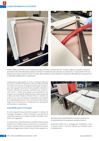 ELEMENTI PREFABBRICATI IN CALCESTRUZZO86 C&PI %u2013 Calcestruzzo & Prefabbricazione International %u2013 6 | 2025 www.cpi-worldwide.comL'elaborazione del progetto di ricerca e sviluppo FlexCore secondo la modalit%u00e0 di soluzione contenuta nella domanda si %u00e8 svolta come previsto. Il progetto ha permesso di raggiungere altri traguardi importanti. %u00c8 stato possibile elaborare e risolvere radicalmente questioni scientifiche per risolvere i rischi tecnici. I risultati del progetto sono promettenti e dimostrano sia il potenziale dell'applicazione della stampa 3D e della successiva fresatura allo stato fresco e indurito, sia quello di una nuova tecnologia di casseratura per ampliare le complessit%u00e0 geometriche, come ad esempio l'eliminazione degli smussi di sformatura o l'integrazione di sottosquadri nell'elemento in calcestruzzo.Sostenibilit%u00e0 grazie al riciclaggioUn altro traguardo importante del progetto %u00e8 il sistema di riciclaggio sviluppato. I residui di fresatura e gli elementi di casseratura dismessi non vengono smaltiti, ma trattati e riutilizzati come aggregati.Le ricerche hanno dimostrato che %u00e8 possibile sostituire senza problemi fino al 50% le polveri di pietra fini con materiale riciclato. In questo ambito, la resistenza alla flessione aumenta addirittura leggermente. Inoltre, i flussi di rifiuti vengono notevolmente ridotti, con un vantaggio per l'ambiente e i costi. In questo modo, il ciclo dei materiali pu%u00f2 chiudersi quasi completamente.Struttura della cassaforma con la combinazione degli elementi in calcestruzzo con il nucleo in legno (a sinistra) e successiva produzione del nucleo flessibile (a destra). A tal fine, la cassaforma viene riempita con poliuretano. Il componente in PU cos%u00ec ottenuto pu%u00f2 essere utilizzato insieme al nucleo della cassaforma come elemento di casseratura flessibile per la produzione di un elemento prefabbricato in calcestruzzo. Sformatura del nucleo flessibile (a sinistra) e panoramica di tutti gli elementi di casseratura utilizzati (a destra)