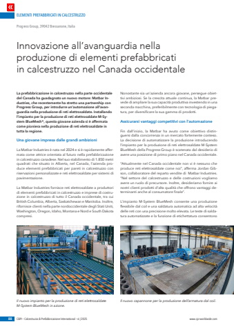 ELEMENTI PREFABBRICATI IN CALCESTRUZZO88 C&PI %u2013 Calcestruzzo & Prefabbricazione International %u2013 6 | 2025 www.cpi-worldwide.comLa prefabbricazione in calcestruzzo nella parte occidentale del Canada ha guadagnato un nuovo motore: Matbar Industries, che recentemente ha stretto una partnership con Progress Group, per introdurre un%u2019automazione all%u2019avanguardia nella produzione di reti elettrosaldate. Installando l%u2019impianto per la produzione di reti elettrosaldate M-System BlueMesh%u00ae, questa giovane azienda si %u00e8 affermata come pioniera nella produzione di reti elettrosaldate in tutta la regione.Una giovane impresa dalle grandi ambizioniLa Matbar Industries %u00e8 nata nel 2024 e si %u00e8 rapidamente affermata come attrice orientata al futuro nella prefabbricazione in calcestruzzo canadese. Nel suo stabilimento di 1.850 metri quadrati che situato in Alberta, nel Canada, l%u2019azienda produce elementi prefabbricati per pareti in calcestruzzo con riservazioni personalizzate e reti elettrosaldate per sistemi di pavimentazione.La Matbar Industries fornisce reti elettrosaldate a produttori di elementi prefabbricati in calcestruzzo e imprese di costruzione in calcestruzzo di tutto il Canada occidentale, tra cui British Columbia, Alberta, Saskatchewan e Manitoba. Inoltre, rifornisce clienti nella parte nordoccidentale degli Stati Uniti, Washington, Oregon, Idaho, Montana e Nord e South Dakota compresi.Nonostante sia un%u2019azienda ancora giovane, persegue obiettivi ambiziosi. Se la crescita attuale continua, la Matbar prevede di ampliare la sua capacit%u00e0 produttiva investendo in una seconda macchina, preferibilmente con tecnologia di piegatura, per diversificare la sua gamma di prodotti.Assicurarsi vantaggi competitivi con l%u2019automazioneFin dall%u2019inizio, la Matbar ha avuto come obiettivo distinguersi dalla concorrenza in un mercato fortemente conteso. La decisione di automatizzare la produzione introducendo l%u2019impianto per la produzione di reti elettrosaldate M-System BlueMesh della Progress Group %u00e8 scatenata dal desiderio di avere una posizione di primo piano nel Canada occidentale.%u201cAttualmente nel Canada occidentale non vi %u00e8 nessuno che produce reti elettrosaldate come noi%u201d, afferma Jordan Gibson, collaboratore del reparto vendite di Matbar Industries. %u201cNel settore del calcestruzzo e delle costruzioni vogliamo avere un ruolo di precursore. Inoltre, desideriamo fornire ai nostri clienti prodotti d%u2019alta qualit%u00e0 che offrono vantaggi determinanti anche al consumatore finale%u201d.L%u2019impianto M-System BlueMesh consente una produzione flessibile dal coil e una saldatura automatica ad alta velocit%u00e0 delle reti con una precisione molto elevata. Le teste di saldatura automatizzate e la funzione di etichettatura consentono Innovazione all%u2019avanguardia nella produzione di elementi prefabbricati in calcestruzzo nel Canada occidentaleProgress Group, 39042 Bressanone, ItaliaIl nuovo impianto per la produzione di reti elettrosaldate M-System BlueMesh in azione.Il nuovo capannone per la produzione dell%u2019armatura dal coil.