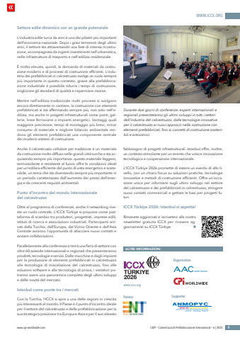 WWW.ICCX.ORGwww.cpi-worldwide.com C&PI %u2013 Calcestruzzo & Prefabbricazione International %u2013 6 | 2025 9Settore edile dinamico con un grande potenzialeL%u2019industria edile turca da anni %u00e8 uno dei pilastri pi%u00f9 importanti dell%u2019economia nazionale. Dopo i gravi terremoti degli ultimi anni, il settore sta attraversando una fase di intensa ricostruzione, accompagnata da ingenti investimenti nell%u2019urbanistica, nelle infrastrutture di trasporto e nell%u2019edilizia residenziale.%u00c8 molto elevata, quindi, la domanda di materiali da costruzione moderni e di processi di costruzione efficienti. L%u2019industria dei prefabbricati in calcestruzzo svolge un ruolo sempre pi%u00f9 importante in questo contesto: grazie alla prefabbricazione industriale %u00e8 possibile ridurre i tempi di costruzione, migliorare gli standard di qualit%u00e0 e risparmiare risorse.Mentre nell%u2019edilizia tradizionale molti processi si svolgono ancora direttamente in cantiere, la costruzione con elementi prefabbricati si sta affermando sempre pi%u00f9, non solo nell%u2019edilizia, ma anche in progetti infrastrutturali come ponti, gallerie, linee ferroviarie o impianti energetici. Vantaggi quali maggiore precisione, tempi di montaggio pi%u00f9 brevi, minor consumo di materiale e migliore bilancio ambientale rendono gli elementi prefabbricati una componente centrale dei moderni sistemi di costruzione.Anche il calcestruzzo cellulare per tradizione %u00e8 un materiale da costruzione molto diffuso nelle grandi citt%u00e0 turche e sta acquisendo sempre pi%u00f9 importanza: questo materiale leggero, termoisolante e resistente al fuoco offre le condizioni ideali per un%u2019edilizia efficiente dal punto di vista energetico e sostenibile, un tema che sta diventando sempre pi%u00f9 importante in un periodo caratterizzato dall%u2019aumento dei prezzi dell%u2019energia e da crescenti requisiti ambientali.Punto d%u2019incontro del mondo internazionale del calcestruzzoOltre al programma di conferenze, anche il networking riveste un ruolo centrale. L%u2019ICCX T%u00fcrkiye si propone come piattaforma di scambio tra produttori, progettisti, imprese edili, istituti di ricerca e associazioni industriali. Partecipanti arrivati dalla Turchia, dall%u2019Europa, dal Vicino Oriente e dall%u2019Asia Centrale avranno l%u2019opportunit%u00e0 di allacciare nuovi contatti e avviare collaborazioni.Parallelamente alla conferenza si terr%u00e0 una fiera di settore con oltre 60 aziende internazionali e regionali che presenteranno prodotti, tecnologie e servizi. Dalle macchine e dagli impianti per la produzione di elementi prefabbricati in calcestruzzo alla tecnologia di miscelazione del calcestruzzo, fino alle soluzioni software e alla tecnologia di prova, i visitatori potranno avere una panoramica completa degli ultimi sviluppi e delle novit%u00e0 del mercato.Istanbul come ponte tra i mercatiCon la Turchia, l%u2019ICCX si apre a una delle regioni in crescita pi%u00f9 interessanti al mondo. Il Paese %u00e8 il punto d%u2019incontro ideale per il settore del calcestruzzo e della prefabbricazione per la sua strategica posizione tra Europa e Asia e per il suo elevato fabbisogno di progetti infrastrutturali. Istanbul offre, inoltre, un contesto stimolante per un evento che unisce innovazione tecnologica e cooperazione internazionale.L%u2019ICCX T%u00fcrkiye 2026 promette di essere un evento di alto livello, con un chiaro focus su soluzioni pratiche, tecnologie innovative e metodi di costruzione efficienti. Offre un%u2019occasione unica per informarsi sugli ultimi sviluppi nel settore del calcestruzzo e dei prefabbricati in calcestruzzo, stringere nuovi contatti commerciali e gettare le basi per progetti futuri.ICCX T%u00fcrkiye 2026: Istanbul vi aspetta!Rimanete aggiornati e iscrivetevi alla nostra newsletter gratuita ICCX per ricevere aggiornamenti su ICCX T%u00fcrkiye. nALTRE INFORMAZIONIwww.iccx.orgT%u00dcRKIYE2026PartnerOrganisationDurante due giorni di conferenze, esperti internazionali e regionali presenteranno gli ultimi sviluppi in tutti i settori dell%u2019industria del calcestruzzo, dalle tecnologie innovative per il calcestruzzo ai nuovi approcci nella costruzione con elementi prefabbricati, fino ai concetti di costruzione sostenibili e antisismici.Supporter