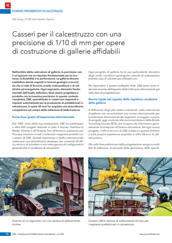 ELEMENTI PREFABBRICATI IN CALCESTRUZZO92 C&PI %u2013 Calcestruzzo & Prefabbricazione International %u2013 6 | 2025 www.cpi-worldwide.comNell%u2019ambito della costruzione di gallerie, la precisione non %u00e8 un%u2019opzione ma un requisito fondamentale per la sicurezza, la durabilit%u00e0 e la performance. Le gallerie devono soddisfare elevati requisiti in termini geologici e tecnici, sia che si tratti di ferrovie, strade, metropolitane o di reti idriche ed energetiche. Ogni segmento, elemento fondamentale dell%u2019anello definitivo, deve essere progettato e prodotto con la massima precisione. In questo contesto complesso, CBE, specializzato in casseri per segmenti e impianti automatizzati per la produzione di prefabbricati in calcestruzzo, in quasi 40 anni ha acquisito una straordinaria competenza nel campo delle tolleranze di fabbricazione.Know-how grazie all%u2019esperienza internazionaleDal 1987, anno della sua costituzione, CBE ha partecipato a oltre 650 progetti dislocati in tutto il mondo. Dall%u2019Asia al Medio Oriente e all%u2019Oceania fino all%u2019America, passando per l%u2019Europa, troviamo in tutti i continenti i segmenti prodotti con i casseri di CBE. Questa esperienza a livello internazionale costituisce uno straordinario database che consente all%u2019ufficio tecnico di accedere a una vasta gamma di configurazioni geometriche e condizioni di ubicazione.Ogni progetto di galleria ha le sue particolarit%u00e0: diametro degli anelli, condizioni geologiche, velocit%u00e0 di realizzazione prevista, tipo di calcestruzzo utilizzato ecc.Per rispondere a queste molteplici sfide, CBE tiene conto sistematicamente dell%u2019aspetto delle tolleranze dimensionali gi%u00e0 nella fase di progettazione.Norme rigide nel rispetto delle rispettive condizioni della galleriaA differenza degli altri settori industriali, nella costruzione di gallerie non ancora esiste una norma internazionale per le tolleranze dimensionali dei segmenti. Il maggior numero di progetti oggi si orienta alle raccomandazioni della British Tunneling Society (BTS) che fungono da riferimento generalmente riconosciuto all%u2019interno del settore. Ad ogni nuovo progetto, l%u2019ufficio tecnico di CBE si basa su queste direttive e sulla propria esperienza acquisita in oltre 38 anni di attivit%u00e0 pratica.Gi%u00e0 nella fase preliminare della progettazione vengono svolti test di tolleranza. A seconda della geometria, delle specifiCasseri per il calcestruzzo con una precisione di 1/10 di mm per opere di costruzione di gallerie affidabiliCBE Group, 37550 Saint Avertin, FranciaDisarmo di un segmento con una ventosa di sollevamento Acimex Cassero CBE e ventosa di sollevamento Acimex per i segmenti prefabbricati in calcestruzzo