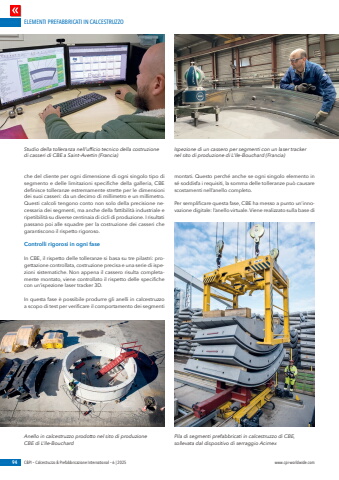 ELEMENTI PREFABBRICATI IN CALCESTRUZZO94 C&PI %u2013 Calcestruzzo & Prefabbricazione International %u2013 6 | 2025 www.cpi-worldwide.comche del cliente per ogni dimensione di ogni singolo tipo di segmento e delle limitazioni specifiche della galleria, CBE definisce tolleranze estremamente strette per le dimensioni dei suoi casseri: da un decimo di millimetro e un millimetro. Questi calcoli tengono conto non solo della precisione necessaria dei segmenti, ma anche della fattibilit%u00e0 industriale e ripetibilit%u00e0 su diverse centinaia di cicli di produzione. I risultati passano poi alle squadre per la costruzione dei casseri che garantiscono il rispetto rigoroso.Controlli rigorosi in ogni faseIn CBE, il rispetto delle tolleranze si basa su tre pilastri: progettazione controllata, costruzione precisa e una serie di ispezioni sistematiche. Non appena il cassero risulta completamente montato, viene controllato il rispetto delle specifiche con un%u2019ispezione laser tracker 3D.In questa fase %u00e8 possibile produrre gli anelli in calcestruzzo a scopo di test per verificare il comportamento dei segmenti montati. Questo perch%u00e9 anche se ogni singolo elemento in s%u00e9 soddisfa i requisiti, la somma delle tolleranze pu%u00f2 causare scostamenti nell%u2019anello completo.Per semplificare questa fase, CBE ha messo a punto un%u2019innovazione digitale: l%u2019anello virtuale. Viene realizzato sulla base di Anello in calcestruzzo prodotto nel sito di produzione CBE di L%u2019Ile-BouchardPila di segmenti prefabbricati in calcestruzzo di CBE, sollevata dal dispositivo di serraggio AcimexStudio della tolleranza nell%u2019ufficio tecnico della costruzione di casseri di CBE a Saint-Avertin (Francia)Ispezione di un cassero per segmenti con un laser tracker nel sito di produzione di L%u2019Ile-Bouchard (Francia)