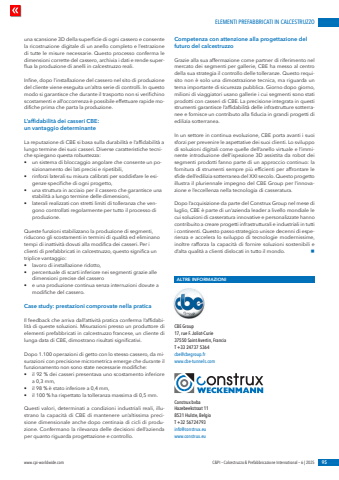 ELEMENTI PREFABBRICATI IN CALCESTRUZZOwww.cpi-worldwide.com C&PI %u2013 Calcestruzzo & Prefabbricazione International %u2013 6 | 2025 95una scansione 3D della superficie di ogni cassero e consente la ricostruzione digitale di un anello completo e l%u2019estrazione di tutte le misure necessarie. Questo processo conferma le dimensioni corrette del cassero, archivia i dati e rende superflua la produzione di anelli in calcestruzzo reali.Infine, dopo l%u2019installazione del cassero nel sito di produzione del cliente viene eseguita un%u2019altra serie di controlli. In questo modo si garantisce che durante il trasporto non si verifichino scostamenti e all%u2019occorrenza %u00e8 possibile effettuare rapide modifiche prima che parta la produzione.L%u2019affidabilit%u00e0 dei casseri CBE: un vantaggio determinanteLa reputazione di CBE si basa sulla durabilit%u00e0 e l%u2019affidabilit%u00e0 a lungo termine dei suoi casseri. Diverse caratteristiche tecniche spiegano questa robustezza:%u2022 un sistema di bloccaggio angolare che consente un posizionamento dei lati precisi e ripetibili,%u2022 rinforzi laterali su misura calibrati per soddisfare le esigenze specifiche di ogni progetto,%u2022 una struttura in acciaio per il cassero che garantisce una stabilit%u00e0 a lungo termine delle dimensioni,%u2022 laterali realizzati con stretti limiti di tolleranza che vengono controllati regolarmente per tutto il processo di produzione.Queste funzioni stabilizzano la produzione di segmenti, riducono gli scostamenti in termini di qualit%u00e0 ed eliminano tempi di inattivit%u00e0 dovuti alla modifica dei casseri. Per i clienti di prefabbricati in calcestruzzo, questo significa un triplice vantaggio:%u2022 lavoro di installazione ridotto,%u2022 percentuale di scarti inferiore nei segmenti grazie alle dimensioni precise del cassero%u2022 e una produzione continua senza interruzioni dovute a modifiche del cassero.Case study: prestazioni comprovate nella praticaIl feedback che arriva dall%u2019attivit%u00e0 pratica conferma l%u2019affidabilit%u00e0 di queste soluzioni. Misurazioni presso un produttore di elementi prefabbricati in calcestruzzo francese, un cliente di lunga data di CBE, dimostrano risultati significativi.Dopo 1.100 operazioni di getto con lo stesso cassero, da misurazioni con precisione micrometrica emerge che durante il funzionamento non sono state necessarie modifiche:%u2022 il 92 % dei casseri presentava uno scostamento inferiore a 0,3 mm,%u2022 il 98 % %u00e8 stato inferiore a 0,4 mm,%u2022 il 100 % ha rispettato la tolleranza massima di 0,5 mm.Questi valori, determinati a condizioni industriali reali, illustrano la capacit%u00e0 di CBE di mantenere un%u2019altissima precisione dimensionale anche dopo centinaia di cicli di produzione. Confermano la rilevanza delle decisioni dell%u2019azienda per quanto riguarda progettazione e controllo.Competenza con attenzione alla progettazione del futuro del calcestruzzoGrazie alla sua affermazione come partner di riferimento nel mercato dei segmenti per gallerie, CBE ha messo al centro della sua strategia il controllo delle tolleranze. Questo requisito non %u00e8 solo una dimostrazione tecnica, ma riguarda un tema importante di sicurezza pubblica. Giorno dopo giorno, milioni di viaggiatori usano gallerie i cui segmenti sono stati prodotti con casseri di CBE. La precisione integrata in questi strumenti garantisce l%u2019affidabilit%u00e0 delle infrastrutture sotterranee e fornisce un contributo alla fiducia in grandi progetti di edilizia sotterranea.In un settore in continua evoluzione, CBE porta avanti i suoi sforzi per prevenire le aspettative dei suoi clienti. Lo sviluppo di soluzioni digitali come quelle dell%u2019anello virtuale e l%u2019imminente introduzione dell%u2019ispezione 3D assistita da robot dei segmenti prodotti fanno parte di un approccio continuo: la fornitura di strumenti sempre pi%u00f9 efficienti per affrontare le sfide dell%u2019edilizia sotterranea del XXI secolo. Questo progetto illustra il pluriennale impegno del CBE Group per l%u2019innovazione e l%u2019eccellenza nella tecnologia di casseratura. Dopo l%u2019acquisizione da parte del Construx Group nel mese di luglio, CBE %u00e8 parte di un%u2019azienda leader a livello mondiale le cui soluzioni di casseratura innovative e personalizzate hanno contribuito a creare progetti infrastrutturali e industriali in tutti i continenti. Questo passo strategico unisce decenni di esperienza e accelera lo sviluppo di tecnologie modernissime, inoltre rafforza la capacit%u00e0 di fornire soluzioni sostenibili e d%u2019alta qualit%u00e0 a clienti dislocati in tutto il mondo. nALTRE INFORMAZIONICBE Group 17, rue F. Joliot-Curie 37550 Saint Avertin, Francia T +33 24737 5364 cbe@cbegroup.frwww.cbe-tunnels.comConstrux bvba Hazebeekstraat 11 8531 Hulste, BelgioT +32 56724793 info@construx.euwww.construx.eu