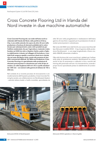 ELEMENTI PREFABBRICATI IN CALCESTRUZZO96 C&PI %u2013 Calcestruzzo & Prefabbricazione International %u2013 6 | 2025 www.cpi-worldwide.comCross Concrete Flooring Ltd, con sede nell%u2019area nord-occidentale dell%u2019Irlanda del Nord, nella periferia di Derry City, %u00e8 una solida azienda che opera da oltre 20 anni nella produzione e fornitura di elementi prefabbricati in calcestruzzo per solai/pavimenti, scale e altri prodotti sia per l%u2019edilizia residenziale che per l%u2019agricoltura. L%u2019azienda %u00e8 stata fondata nel 2005 da John e Stephen Harkin, padre e figlio. Lo stabilimento %u00e8 situato nel villaggio di Drumahoe e i prodotti finiti vengono spediti a numerosi clienti sia in Irlanda che nel resto del Regno Unito, grazie alla presenza di due uffici commerciali dedicati. Sin dalla sua fondazione, Cross Concrete Flooring si %u00e8 specializzata nella produzione di elementi precompressi in calcestruzzo per solai di tipo alveolare, sia nella larghezza 600 mm che in quella standard da 1200 mm %u2013 con sezioni nella gamma di altezza da 150 a 250 mm.Nel contesto di un recente processo di rinnovamento e ammodernamento dell%u2019impianto produttivo, Cross Concrete Flooring ha avviato una collaborazione con Nordimpianti System %u2013 azienda italiana leader a livello mondiale, specializzata da oltre 50 anni nella progettazione e realizzazione dell%u2019intera gamma di macchine e apparati per la produzione di solai alveolari precompressi in calcestruzzo.Nel corso del 2022 sono stati forniti una nuova macchina del tipo Estrusore modello EVO2 %u2013 il top di gamma della produzione Nordimpianti %u2013 e una sega longitudinale a fresco modello 500LPB, alimentata a batteria.Oltre alla fornitura dei nuovi macchinari, adattati per l%u2019utilizzo sulle piste di produzione esistenti, Nordimpianti ha curato anche le fasi di avviamento e collaudo in loco, nonch%u00e9 del training del personale sull%u2019uso e la manutenzione, inviando i propri tecnici specializzati presso lo stabilimento di Londonderry. Cross Concrete Flooring Ltd in Irlanda del Nord investe in due macchine automatiche Nordimpianti System Srl, 66100 Chieti (CH), ItaliaEstrusore EVO2 di Nordimpianti Estrusore EVO2 operativo in fase di getto