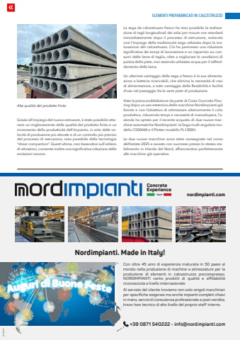 ELEMENTI PREFABBRICATI IN CALCESTRUZZOwww.cpi-worldwide.com C&PI %u2013 Calcestruzzo & Prefabbricazione International %u2013 6 | 2025 97Grazie all%u2019impiego del nuovo estrusore, %u00e8 stato possibile ottenere un miglioramento della qualit%u00e0 del prodotto finito e un incremento della produttivit%u00e0 dell%u2019impianto, in virt%u00f9 delle velocit%u00e0 di produzione pi%u00f9 elevate e di un controllo pi%u00f9 preciso del processo di estrusione, reso possibile dalla tecnologia %u201cshear compaction%u201d. Quest%u2019ultima, non basandosi sull%u2019utilizzo di vibrazioni, consente inoltre una significativa riduzione delle emissioni sonore.La sega da calcestruzzo fresco ha reso possibile la realizzazione di tagli longitudinali dei solai per misure non standard immediatamente dopo il processo di estrusione, evitando cos%u00ec l%u2019impiego della tradizionale sega utilizzata dopo la maturazione del calcestruzzo. Ci%u00f2 ha permesso una riduzione significativa dei tempi di lavorazione e un risparmio sui consumi delle lame di taglio, oltre a migliorare le condizioni di pulizia delle piste, non essendo utilizzata acqua per il raffreddamento della lama.Un ulteriore vantaggio della sega a fresco %u00e8 la sua alimentazione a batterie ricaricabili, che elimina la necessit%u00e0 di cavi di alimentazione, a tutto vantaggio della flessibilit%u00e0 e facilit%u00e0 d%u2019uso nel passaggio fra le varie piste di produzione. Vista la piena soddisfazione da parte di Cross Concrete Flooring dopo un uso estensivo delle macchine Nordimpianti gi%u00e0 fornite e con l%u2019obiettivo di ottimizzare ulteriormente il ciclo produttivo, riducendo tempi e necessit%u00e0 di manodopera, l%u2019azienda ha optato per il recente acquisto di due nuove macchine automatiche Nordimpianti: la Sega multi-angolare modello C500AM e il Plotter modello PL1200H.Le due nuove macchine sono state consegnate nel corso dell%u2019estate 2025 e avviate con successo presso lo stesso stabilimento in Irlanda del Nord, affiancandosi perfettamente alle macchine gi%u00e0 operative.Alta qualit%u00e0 del prodotto finitoCon oltre 45 anni di esperienza maturata in 50 paesi al mondo nella produzione di machine e attrezzature per la produzione di elementi in calcestruzzo precompresso, NORDIMPIANTI vanta prodotti di qualit%u00e0 e affidabilit%u00e0 riconosciuta a livello internazionale.Al servizio del cliente troviamo non solo singoli macchinari per specifiche esigenze ma anche impianti completi chiavi in mano, servizi di consulenza professionale e post vendita, know how tecnico di alto livello del proprio staff interno.Nordimpianti. Made in Italy!adv | webnue.itConcreteExperience ITA LY nordimpianti.com%ue138+39 0871 540222 - info@nordimpianti.com