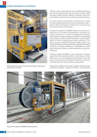 ELEMENTI PREFABBRICATI IN CALCESTRUZZO98 C&PI %u2013 Calcestruzzo & Prefabbricazione International %u2013 6 | 2025 www.cpi-worldwide.comIl Plotter %u00e8 stato inoltre esposto come modello dimostrativo allo stand di Nordimpianti durante l%u2019ultima edizione della fiera Bauma 2025, tenutasi a Monaco di Baviera, Germania, prima della sua spedizione allo stabilimento di Londonderry.Le nuove macchine automatiche contribuiscono in modo concreto all%u2019ottimizzazione del processo produttivo e alla riduzione della manodopera necessaria nel corso dei turni di lavoro di Cross Concrete Flooring.La Sega multi-angolare C500AM, dotata di un preciso puntatore laser e un controllo computerizzato, si posiziona con estrema precisione e in modo completamente autonomo nella posizione di taglio trasversale, angolato o longitudinale dei pannelli per solaio prodotti sulle piste. I punti di taglio, definiti in fase di programmazione della produzione, vengono caricati con appositi file di testo. Inoltre, grazie a una copertura telescopica doppia della lama di taglio e al sistema di spruzzo in pressione dell%u2019acqua di raffreddamento della lama, le emissioni di polveri vengono abbattute in modo considerevole.Il Plotter modello PL1200H %u00e8 invece destinato al duplice scopo di marcare autonomamente in modo univoco e indelebile i solai, con codici alfanumerici identificativi e testi utili per il riconoscimento e tracciabilit%u00e0 del prodotto, nonch%u00e9 per la foratura dei fori di scarico dell%u2019acqua dagli alveoli.Alimentato con batteria ricaricabile, il Plotter %u00e8 dotato di doppia testina di stampa %u2013 superiore e laterale %u2013 ed %u00e8 anch%u2019esso Plotter destinato a Cross Concrete Flooring in esposizione alla fiera Bauma 2025Sega multi-angolare C500AM di Nordimpianti