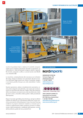ELEMENTI PREFABBRICATI IN CALCESTRUZZOwww.cpi-worldwide.com C&PI %u2013 Calcestruzzo & Prefabbricazione International %u2013 6 | 2025 99ALTRE INFORMAZIONINORDIMPIANTI SYSTEM SRLVia Erasmo Piaggio, 19/A66100 Chieti (CH), ItaliaT +39 0871 540222info@nordimpianti.comwww.nordimpianti.comCROSS CONCRETE FLOORING LTDFawney Road Cross DrumahoeBT47 3NB L%u2019Derry, Irlanda del NordT +44 028 71301488technical@crossconcreteflooring.comwww.crossconcreteflooring.communito di puntatore laser e sistema di controllo computerizzato per la massima precisione durante le operazioni. Le informazioni e i dati da stampare vengono salvati in appositi file di testo, preparati in ufficio e caricati tramite rete WLAN o su chiavetta USB.La macchina, contestualmente alla marcatura con inchiostro dei solai, esegue la foratura con precisione dei fori di scarico dell%u2019acqua dagli alveoli, per evitare il possibile ristagno e successiva perdita d%u2019acqua una volta assemblato il solaio in opera.Questa operazione, adesso completamente automatica, veniva prima eseguita manualmente, cos%u00ec come per la misurazione e la marcatura dei solai per il taglio. Oltre alla riduzione della manodopera necessaria sono stati sensibilmente ridotti gli errori umani, a beneficio della qualit%u00e0 e della produttivit%u00e0 dell%u2019impianto.Dopo il successo gi%u00e0 della prima fornitura, visti gli eccellenti risultati ora ottenuti con l%u2019introduzione delle due nuove macchine automatiche di Nordimpianti, Cross Concrete Flooring conferma la propria volont%u00e0 di investire e innovare per il continuo miglioramento delle condizioni di lavoro in stabilimento, della produttivit%u00e0 e redditivit%u00e0 dell%u2019impianto, nonch%u00e9 dell%u2019eccellente qualit%u00e0 dei loro prodotti finiti. nPlotter PL1200H di Nordimpianti Il nuovo Plotter in funzione insieme all%u2019Estrusore EVO2 fornito nel 2022