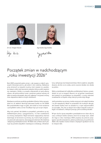 www.cpi-worldwide.com%u0009 ZBI %u2013 Zak%u0142ady Betonowe International %u2013 6 | 2025 3OD REDAKCJIRok 2025 przyni%u00f3s%u0142 wiele zmian i, jak zawsze w takich sytuacjach, kluczowe jest to, jak sobie z nimi radzimy. Zw%u0142aszcza przy zmianach w zespole musimy mie%u0107 zawsze na uwadze, %u017ce naszym celem jest tworzenie zespo%u0142u, kt%u00f3ry w pe%u0142ni wspiera si%u0119 nawzajem. Ka%u017cdy co prawda odpowiada za sw%u00f3j w%u0142asny obszar, ale jednocze%u015bnie mo%u017ce i powinien patrze%u0107 szerzej ni%u017c tylko na swoje obowi%u0105zki, aby m%u00f3c zg%u0142asza%u0107 i inicjowa%u0107 zmiany oraz ulepszenia tak%u017ce w innych obszarach.Niedawno podczas podr%u00f3%u017cy spotka%u0142em klienta, kt%u00f3ry opowiedzia%u0142 mi, %u017ce w%u0142a%u015bnie sko%u0144czy%u0142 planowa%u0107 kadr%u0119 na rok 2028! Nie powiedzia%u0142em tego na g%u0142os, ale zrobi%u0142 na mnie wra%u017cenie i pomy%u015bla%u0142em sobie, %u017ce te%u017c chcia%u0142bym by%u0107 ju%u017c na tym etapie.Aby m%u00f3c patrze%u0107 tak daleko w przysz%u0142o%u015b%u0107, potrzebne s%u0105 najdok%u0142adniejsze plany i przygotowania, i to bez oczekiwania na zmiany zewn%u0119trzne. Rz%u0105d niemiecki najwyra%u017aniej r%u00f3wnie%u017c dostrzeg%u0142, %u017ce konieczne s%u0105 zmiany, by mo%u017cna by%u0142o przywr%u00f3ci%u0107 pewno%u015b%u0107 planowania, stanowi%u0105c%u0105 fundament dla stabilnej i aktywnej przedsi%u0119biorczo%u015bci. W 2026 roku w Niemczech planuje si%u0119 przede wszystkim inwestycje w edukacj%u0119, infrastruktur%u0119, cyfryzacj%u0119 oraz bezpiecze%u0144stwo. Brzmi pi%u0119knie, wszystko s%u0142uszne, ale kto na to czeka, zanim zacznie dzia%u0142a%u0107, ten dzia%u0142a za p%u00f3%u017ano.Wielu przedstawicieli zak%u0142ad%u00f3w prefabrykacji betonu powiedzia%u0142o mi ju%u017c na targach Bauma, %u017ce s%u0105 gotowi inwestowa%u0107, ale brakuje im perspektyw na przysz%u0142o%u015b%u0107, a moim zdaniem oczekiwanie na lepsze czasy trwa po prostu zbyt d%u0142ugo.Je%u015bli potrzebne s%u0105 zmiany, trzeba zaczyna%u0107 od ma%u0142ych krok%u00f3w i to jak najszybciej. Mo%u017ce to prowadzi%u0107 do trudnych decyzji, ale zawsze trzeba mie%u0107 na uwadze to, o czym wspomnia%u0142em na pocz%u0105tku. Ten, kto w du%u017cym lub ma%u0142ym zespole mo%u017ce polega%u0107 na ludziach, z kt%u00f3rymi pracuje, jest na dobrej drodze.W tym duchu %u017cycz%u0119 wszystkim przedsi%u0119biorcom du%u017co si%u0142y na czas, w kt%u00f3rym trzeba samemu bra%u0107 los w swoje r%u0119ce. Je%u017celi do tego w roku inwestycji 2026 pojawi%u0105 si%u0119 jeszcze pozytywne czynniki zewn%u0119trzne, jestem przekonany, %u017ce pod koniec 2026 roku b%u0119dzie mo%u017cna m%u00f3wi%u0107 o lepszych wynikach ni%u017c ma to miejsce dzi%u015b.Pocz%u0105tek zmian w nadchodz%u0105cym %u201eroku inwestycji 2026%u201dDr in%u017c. Holger Karutz Agnieszka Spychalska
