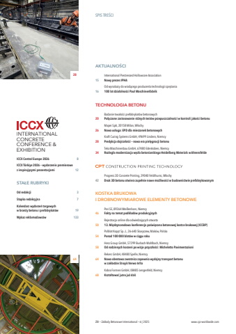 ZBI %u2013 Zak%u0142ady Betonowe International %u2013 6 | 2025 www.cpi-worldwide.comSPIS TRE%u015aCIAKTUALNO%u015aCIInternational Prestressed Hollowcore Association15 Nowy prezes IPHA Od wynalazcy do wiod%u0105cego producenta technologii spr%u0119%u017cania16%u0009 100 lat dzia%u0142alno%u015bci Paul MaschinenfabrikTECHNOLOGIA BETONUBadanie trwa%u0142o%u015bci prefabrykat%u00f3w betonowych20%u0009 Po%u0142%u0105czone zastosowanie r%u00f3%u017cnych test%u00f3w przepuszczalno%u015bci w kontroli jako%u015bci betonuMapei SpA, 20158 Milan,W%u0142ochy26%u0009 Nowa us%u0142uga: EPD dla mieszanek betonowychKraft Curing Systems GmbH, 49699 Lindern, Niemcy28%u0009 Predykcja dojrza%u0142o%u015bci %u2013 nowa era piel%u0119gnacji betonuTeka Maschinenbau GmbH, 67480 Edenkoben, Niemcy34%u0009 Rozleg%u0142a modernizacja w%u0119z%u0142a betoniarskiego Heidelberg Materials w AhrensfeldeProgress 3D Concrete Printing, 39040 Feldthurns,W%u0142ochy42%u0009 Druk 3D betonu otwiera zupe%u0142nie nowe mo%u017cliwo%u015bci w budownictwie prefabrykowanymKOSTKA BRUKOWA I DROBNOWYMIAROWE ELEMENTY BETONOWEPeri SE, 89264 Wei%u00dfenhorn, Niemcy46%u0009 Fakty na temat podk%u0142ad%u00f3w produkcyjnychRejestracja online dla odwiedzaj%u0105cych otwarta50%u0009 13. Mi%u0119dzynarodowa konferencja po%u015bwi%u0119cona betonowej kostce brukowej (ICCBP)Polblat Kopyt Sp.J., 26-640 Skaryszew, Mak%u00f3w, Polska54%u0009 Ponad 100 000 blat%u00f3w w ci%u0105gu rokuHess Group GmbH, 57299 Burbach-Wahlbach, Niemcy58%u0009 Od rodzinnych korzeni po wizje przysz%u0142o%u015bci: Micheletto PavimentazioniRekers GmbH, 48480 Spelle, Niemcy64%u0009 Nowa obrotowa zwrotnica zapewnia wydajny transport betonuw zak%u0142adzie Struyk Verwo InfraKobra Formen GmbH, 08485 Lengenfeld, Niemcy68%u0009 Kszta%u0142towa%u0107 jutro ju%u017c dzi%u015bICCX Central Europe 2026 8ICCX T%u00fcrkiye 2026 %u2013 wydarzenie premierowez inspiruj%u0105cymi prezentacjami 12STA%u0141E RUBRYKIOd redakcji%u0009 3Stopka redakcyjna%u0009 7Kalendarz wydarze%u0144 targowychw bran%u017cy betonu i prefabrykat%u00f3w%u0009 19Wykaz reklamodawc%u00f3w%u0009 133INTERNATIONAL CONCRETECONFERENCE & EXHIBITION6428