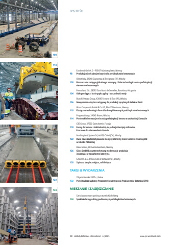 SPIS TRE%u015aCIEurobend GmbH, D %u2013 90547 N%u00fcrnberg-Stein, Niemcy98%u0009 Produkcja siatek zbrojeniowych dla prefabrykat%u00f3w betonowychOlmet Italy, 31040 Signoressa diTrevignano (TV),W%u0142ochy100%u0009 Rozszerzanie zasi%u0119gu globalnego: maszyny i linie technologiczne do prefabrykacjielement%u00f3w betonowychPrensoland S.A., 08592 Sant Mart%u00ed de Centelles, Barcelona, Hiszpania104%u0009 Odkryte ci%u0119gna: brak ryzyka pylicy i oszcz%u0119dno%u015b%u0107 wodyBianchi Precast Group, 43045 Fornovo diTaro (PR),W%u0142ochy106%u0009 Nowy samono%u015bny tor naci%u0105gowy do produkcji spr%u0119%u017conych belek w DaniiWasa Compound GmbH & Co. KG, 98617 Neubrunn, Niemcy110%u0009 Elastyczna technologia form dla skomplikowanych prefabrykat%u00f3w betonowychProgress Group, 39042 Brixen,W%u0142ochy114%u0009 Pionierskie innowacje w bran%u017cy prefabrykacji betonu w zachodniej KanadzieCBE Group, 37550 Saint Avertin,Francja118%u0009 Formy do betonu z dok%u0142adno%u015bci%u0105 do jednej dziesi%u0105tej milimetra,kluczowe dla niezawodno%u015bci tuneluNordimpianti System Srl, 66100 Chieti (CH),W%u0142ochy122%u0009 Dwie nowe zautomatyzowane maszyny dla firmy Cross Concrete Flooring Ltdw Irlandii P%u00f3%u0142nocnejRatec GmbH, 68766 Hockenheim, Niemcy126%u0009 Glass GmbH Bauunternehmung modernizuje produkcj%u0119inwestuj%u0105c w now%u0105 form%u0119 bateryjn%u0105Schnell S.p.a., 61036 Colli al Metauro (PU),W%u0142ochy130%u0009 Szybsza, bezpieczniejsza,solidniejszaTARGI & WYDARZENIA29 pa%u017adziernika 2025 r., Kielce132%u0009 Piotr Dauksza wybrany Prezesem Stowarzyszenia Producent%u00f3w Beton%u00f3w (SPB)MIESZANIE I ZAG%u0118SZCZANIESze%u015bciopoziomowy parking w tunelu K%u00fcchelberg134%u0009 Spektakularny parking podziemny z prefabrykat%u00f3w betonowych100118ZBI %u2013 Zak%u0142ady Betonowe International %u2013 6 | 2025 www.cpi-worldwide.com134122