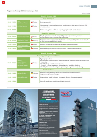WWW.ICCX.ORGwww.cpi-worldwide.com%u0009 ZBI %u2013 Zak%u0142ady Betonowe International %u2013 6 | 2025 9Dzie%u0144 1 %u2013 4. marca 2026Sesja otwieraj%u0105ca10:00 - 10:30 Prof. Waldemar Pich%u00f3r Polska Beton przysz%u0142o%u015bci10:30 - 11:00 Dr Maja K%u0119pniak Polska %u015alad w%u0119glowy i gospodarka o obiegu zamkni%u0119tym, a tak%u017ce szerszy kontekst ESG w budownictwie11:30 - 12:00 Elektrownie j%u0105drowe w Polsce %u2013 wsp%u00f3lny projekt producent%u00f3w betonuMateria%u0142y i innowacje14:00 - 14:30 Giovanni Spychalski Polska Przyk%u0142ady zastosowania sztucznej inteligencji w usprawnianiu proces%u00f3w biznesowych w bran%u017cy budowlanej i betonowej14:30 - 15:00 Dr Matthias Tietze Niemcy Po%u0142%u0105czenie innowacyjnych przedsi%u0119biorstw z bran%u017cy prefabrykat%u00f3w budowlanych w celu stworzenia wsp%u00f3lnoty jako%u015bci15:00 - 15:30 Prof. Pawe%u0142 Pichniarczyk Polska Paszport budynk%u00f3w, %u015blad w%u0119glowy wyzwania bran%u017cy betonowej15:30 - 16:00 Mgr in%u017c. David Abouem Niemcy Beton w%u0142%u00f3knisty do element%u00f3w betonowych o wysokiej wytrzyma%u0142o%u015bciDzie%u0144 2 %u2013 5. marca 2026Elementy prefabrykowane z betonu10:00 - 12:00Wst%u0119p:Dawid Niteckimoderator: Patrycjusz Wy%u017cgaPolskaDyskusja panelowa%u2022 Rozwi%u0105zania prefabrykowane dla deweloper%u00f3w %u2013 radzenie sobie z kryzysem czasu i koszt%u00f3w%u2022 Prefabrykacja w praktyce deweloperaPekabex %u2013 szanse, wyzwania i do%u015bwiadczenia z produkcji i budowy%u2022 Prefabrykat oczami dewelopera %u2013 potrzeby, obawy i szanse wsp%u00f3%u0142pracyKostka brukowa13:30 - 14:00 Bastian Strybny Niemcy Beton o niskiej zawarto%u015bci wody do produkcji wyrob%u00f3w betonowych i jego potencja%u0142 optymalizacyjny14:00 - 14:30 Joanna Skrzypek Polska Nowe oblicze kostki brukowej %u2013 innowacje, design, ekologia, przysz%u0142o%u015b%u010714:30 - 15:00 Kontrola jako%u015bci w produkcji wyrob%u00f3w betonowychProgram konferencji ICCX Central Europe 2026.Stan na 18.11.20251 RECEPTION HOPPER4 HOPPERS OF 70 MC / EACH FOR A TOTAL OF 280 MC8 HOPPERS OF 35 MC / EACH FOR A TOTAL OF 280 MC1 LOADING SYSTEM WITH BUCKET ELEVATOR FOR HOPPERS3 CEMENT SILOS OF 80 TON EACH2 PLANETARY MIXERS MPR SERY HIGH PERFORMANCE 3000/2000 LTMIXER AUTOMATIC WASHING SYSTEM1 AGGREGATE MOBILE WEIGHING BUCKET2 CEMENT SCALES2 WATER SCALES2 ADMIXTURE SCALESCONTROL PANEL IN PROTECTION CABINCAMERAS VIDEO CONTROL1 DIRTY WATER DOSER1 DIRTY WATER TREATMENT SYSTEMAUTOCLAVE WATER SYSTEM WITH STORAGE TANKEXCELLENCEIN CONCRETE BATCHING PLANTSTAILOR MADEBATCHING PLANTSTURNKEY SOLUTIONSwww.rocchipg.euCMYCMMYCY CMYKRocchi logo allargato.pdf 1 11/03/19 17:24PASSAGGIO DI BETTONA (PG) ITALYTOWER CONCRETE BATCHING PLANT TK TYPE FOR A HIGH PRODUCTION OF QUALITY CONCRETE FOR THE PRODUCTION OF PRECAST ELEMENTS