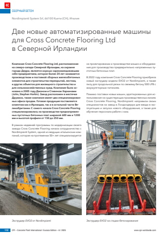 %u0421%u0411%u041e%u0420%u041d%u042b%u0419 %u0411%u0415%u0422%u041e%u041d112 CPI %u2013 Concrete Plant International | Eurasia Edition %u2013 6 | 2025 www.cpi-worldwide.com%u041a%u043e%u043c%u043f%u0430%u043d%u0438%u044f Cross Concrete Flooring Ltd, %u0440%u0430%u0441%u043f%u043e%u043b%u043e%u0436%u0435%u043d%u043d%u0430%u044f %u043d%u0430 %u0441%u0435%u0432%u0435%u0440%u043e-%u0437%u0430%u043f%u0430%u0434%u0435 %u0421%u0435%u0432%u0435%u0440%u043d%u043e%u0439 %u0418%u0440%u043b%u0430%u043d%u0434%u0438%u0438, %u043d%u0430 %u043e%u043a%u0440%u0430%u0438%u043d%u0435 %u0433%u043e%u0440%u043e%u0434%u0430 %u0414%u0435%u0440%u0440%u0438, %u044f%u0432%u043b%u044f%u0435%u0442%u0441%u044f %u0445%u043e%u0440%u043e%u0448%u043e %u0437%u0430%u0440%u0435%u043a%u043e%u043c%u0435%u043d%u0434%u043e%u0432%u0430%u0432%u0448%u0438%u043c %u0441%u0435%u0431%u044f %u043f%u0440%u0435%u0434%u043f%u0440%u0438%u044f%u0442%u0438%u0435%u043c, %u043a%u043e%u0442%u043e%u0440%u043e%u0435 %u0431%u043e%u043b%u0435%u0435 20 %u043b%u0435%u0442 %u0437%u0430%u043d%u0438%u043c%u0430%u0435%u0442%u0441%u044f %u043f%u0440%u043e%u0438%u0437%u0432%u043e%u0434%u0441%u0442%u0432%u043e%u043c %u0438 %u043f%u043e%u0441%u0442%u0430%u0432%u043a%u043e%u0439 %u0441%u0431%u043e%u0440%u043d%u044b%u0445 %u0436%u0435%u043b%u0435%u0437%u043e%u0431%u0435%u0442%u043e%u043d%u043d%u044b%u0445 %u044d%u043b%u0435%u043c%u0435%u043d%u0442%u043e%u0432 %u0434%u043b%u044f %u0441%u0442%u0440%u043e%u0438%u0442%u0435%u043b%u044c%u0441%u0442%u0432%u0430 %u043f%u0435%u0440%u0435%u043a%u0440%u044b%u0442%u0438%u0439, %u043b%u0435%u0441%u0442%u043d%u0438%u0446 %u0438 %u0434%u0440%u0443%u0433%u0438%u0445 %u043e%u0431%u044a%u0435%u043a%u0442%u043e%u0432 %u0434%u043b%u044f %u0436%u0438%u043b%u0438%u0449%u043d%u043e%u0433%u043e %u0441%u0442%u0440%u043e%u0438%u0442%u0435%u043b%u044c%u0441%u0442%u0432%u0430 %u0438 %u0434%u043b%u044f %u0441%u0435%u043b%u044c%u0441%u043a%u043e%u0445%u043e%u0437%u044f%u0439%u0441%u0442%u0432%u0435%u043d%u043d%u044b%u0445 %u043d%u0443%u0436%u0434. %u041a%u043e%u043c%u043f%u0430%u043d%u0438%u044f %u0431%u044b%u043b%u0430 %u043e%u0441%u043d%u043e%u0432%u0430%u043d%u0430 %u0432 2005 %u0433%u043e%u0434%u0443 %u0414%u0436%u043e%u043d%u043e%u043c %u0438 %u0421%u0442%u0438%u0432%u0435%u043d%u043e%u043c %u0425%u0430%u0440%u043a%u0438%u043d%u0430%u043c%u0438 (John, Stephen Harkin). %u0417%u0430%u0432%u043e%u0434 %u0440%u0430%u0441%u043f%u043e%u043b%u043e%u0436%u0435%u043d %u0432 %u043c%u0435%u0441%u0442%u0435%u0447%u043a%u0435 %u0414%u0440%u0443%u043c%u0430%u0445%u043e, %u0442%u0430%u043a%u0436%u0435 %u043a%u043e%u043c%u043f%u0430%u043d%u0438%u044f %u0438%u043c%u0435%u0435%u0442 %u0434%u0432%u0430 %u0441%u043f%u0435%u0446%u0438%u0430%u043b%u0438%u0437%u0438%u0440%u043e%u0432%u0430%u043d%u043d%u044b%u0445 %u043e%u0444%u0438%u0441%u0430 %u043f%u0440%u043e%u0434%u0430%u0436. %u0413%u043e%u0442%u043e%u0432%u0430%u044f %u043f%u0440%u043e%u0434%u0443%u043a%u0446%u0438%u044f %u043f%u043e%u0441%u0442%u0430%u0432%u043b%u044f%u0435%u0442%u0441%u044f %u043a%u043b%u0438%u0435%u043d%u0442%u0430%u043c %u043a%u0430%u043a %u0432 %u0418%u0440%u043b%u0430%u043d%u0434%u0438%u0438, %u0442%u0430%u043a %u0438 %u0432 %u043e%u0441%u0442%u0430%u043b%u044c%u043d%u043e%u0439 %u0447%u0430%u0441%u0442%u0438 %u0412%u0435%u043b%u0438%u043a%u043e%u0431%u0440%u0438%u0442%u0430%u043d%u0438%u0438. %u0421 %u0441%u0430%u043c%u043e%u0433%u043e %u043d%u0430%u0447%u0430%u043b%u0430 Cross Concrete Flooring %u0441%u043f%u0435%u0446%u0438%u0430%u043b%u0438%u0437%u0438%u0440%u043e%u0432%u0430%u043b%u0438%u0441%u044c %u043d%u0430 %u043f%u0440%u043e%u0438%u0437%u0432%u043e%u0434%u0441%u0442%u0432%u0435 %u043f%u0440%u0435%u0434%u043d%u0430%u043f%u0440%u044f%u0436%u0435%u043d%u043d%u044b%u0445 %u043f%u0443%u0441%u0442%u043e%u0442%u043d%u044b%u0445 %u0431%u0435%u0442%u043e%u043d%u043d%u044b%u0445 %u043f%u043b%u0438%u0442 %u0448%u0438%u0440%u0438%u043d%u043e%u0439 600 %u043c%u043c %u0438 1200 %u043c%u043c %u0438 %u0432%u044b%u0441%u043e%u0442%u043e%u0439 %u043f%u0440%u043e%u0444%u0438%u043b%u044f %u043e%u0442 150 %u0434%u043e 250 %u043c%u043c.%u0412 %u0440%u0430%u043c%u043a%u0430%u0445 %u043d%u0435%u0434%u0430%u0432%u043d%u0435%u0439 %u043f%u0440%u043e%u0433%u0440%u0430%u043c%u043c%u044b %u043f%u043e %u043c%u043e%u0434%u0435%u0440%u043d%u0438%u0437%u0430%u0446%u0438%u0438 %u0441%u0432%u043e%u0435%u0433%u043e %u0437%u0430%u0432%u043e%u0434%u0430 Cross Concrete Flooring %u043d%u0430%u0447%u0430%u043b%u0430 %u0441%u043e%u0442%u0440%u0443%u0434%u043d%u0438%u0447%u0435%u0441%u0442%u0432%u043e %u0441 Nordimpianti System, %u043e%u0434%u043d%u043e%u0439 %u0438%u0437 %u0432%u0435%u0434%u0443%u0449%u0438%u0445 %u0438%u0442%u0430%u043b%u044c%u044f%u043d%u0441%u043a%u0438%u0445 %u043a%u043e%u043c%u043f%u0430%u043d%u0438%u0439, %u043a%u043e%u0442%u043e%u0440%u0430%u044f %u043d%u0430 %u043f%u0440%u043e%u0442%u044f%u0436%u0435%u043d%u0438%u0438 50+ %u043b%u0435%u0442 %u0441%u043f%u0435%u0446%u0438%u0430%u043b%u0438%u0437%u0438%u0440%u0443%u0435%u0442%u0441%u044f%u043d%u0430 %u043f%u0440%u043e%u0435%u043a%u0442%u0438%u0440%u043e%u0432%u0430%u043d%u0438%u0438 %u0438 %u043f%u0440%u043e%u0438%u0437%u0432%u043e%u0434%u0441%u0442%u0432%u0435 %u043c%u0430%u0448%u0438%u043d %u0438 %u043e%u0431%u043e%u0440%u0443%u0434%u043e%u0432%u0430%u043d%u0438%u044f %u0434%u043b%u044f %u043f%u0440%u043e%u0438%u0437%u0432%u043e%u0434%u0441%u0442%u0432%u0430 %u043f%u0440%u0435%u0434%u0432%u0430%u0440%u0438%u0442%u0435%u043b%u044c%u043d%u043e %u043d%u0430%u043f%u0440%u044f%u0436%u0435%u043d%u043d%u044b%u0445 %u043f%u0443%u0441%u0442%u043e%u0442%u043d%u044b%u0445 %u0431%u0435%u0442%u043e%u043d%u043d%u044b%u0445 %u043f%u043b%u0438%u0442.%u0412 2022 %u0433%u043e%u0434%u0443 %u043a%u043e%u043c%u043f%u0430%u043d%u0438%u044f Cross Concrete Flooring %u043f%u0440%u0438%u043e%u0431%u0440%u0435%u043b%u0430 %u043d%u043e%u0432%u044b%u0439 %u044d%u043a%u0441%u0442%u0440%u0443%u0434%u0435%u0440 %u043c%u043e%u0434%u0435%u043b%u0438 EVO2 %u043e%u0442 N
