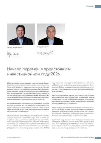 www.cpi-worldwide.com CPI %u2013 Concrete Plant International | Eurasia Edition %u2013 6 | 2025 3EDITORIAL2025 %u0433%u043e%u0434 %u043f%u0440%u0438%u043d%u0435%u0441 %u043c%u043d%u043e%u0433%u043e %u043f%u0435%u0440%u0435%u043c%u0435%u043d, %u0438, %u043a%u0430%u043a %u044d%u0442%u043e %u0432%u0441%u0435%u0433%u0434%u0430 %u0431%u044b%u0432%u0430%u0435%u0442 %u0441 %u043f%u0435%u0440%u0435%u043c%u0435%u043d%u0430%u043c%u0438, %u0432%u0441%u0435 %u0437%u0430%u0432%u0438%u0441%u0438%u0442 %u043e%u0442 %u0442%u043e%u0433%u043e, %u043a%u0430%u043a %u0432%u044b %u043a %u043d%u0438%u043c %u043e%u0442%u043d%u043e%u0441%u0438%u0442%u0435%u0441%u044c. %u041a%u043e%u0433%u0434%u0430 %u0440%u0435%u0447%u044c %u0437%u0430%u0445%u043e%u0434%u0438%u0442 %u043e %u043a%u0430%u0434%u0440%u043e%u0432%u044b%u0445 %u0438%u0437%u043c%u0435%u043d%u0435%u043d%u0438%u044f%u0445, %u043c%u044b %u0432%u0441%u0435%u0433%u0434%u0430 %u0434%u043e%u043b%u0436%u043d%u044b %u043f%u043e%u043c%u043d%u0438%u0442%u044c, %u0447%u0442%u043e %u043d%u0430%u0448%u0435%u0439 %u0446%u0435%u043b%u044c%u044e %u0434%u043e%u043b%u0436%u043d%u043e %u0431%u044b%u0442%u044c %u0444%u043e%u0440%u043c%u0438%u0440%u043e%u0432%u0430%u043d%u0438%u0435 %u043a%u043e%u043c%u0430%u043d%u0434%u044b, %u0447%u043b%u0435%u043d%u044b %u043a%u043e%u0442%u043e%u0440%u043e%u0439 %u043f%u043e%u043b%u043d%u043e%u0441%u0442%u044c%u044e %u043f%u043e%u0434%u0434%u0435%u0440%u0436%u0438%u0432%u0430%u044e%u0442 %u0434%u0440%u0443%u0433 %u0434%u0440%u0443%u0433%u0430. %u041a%u043e%u043c%u0430%u043d%u0434%u044b, %u0432 %u043a%u043e%u0442%u043e%u0440%u043e%u0439 %u0432%u0441%u0435 %u043d%u0435%u0441%u0443%u0442 %u043e%u0442%u0432%u0435%u0442%u0441%u0442%u0432%u0435%u043d%u043d%u043e%u0441%u0442%u044c %u0437%u0430 %u0441%u0432%u043e%u044e %u0434%u0435%u044f%u0442%u0435%u043b%u044c%u043d%u043e%u0441%u0442%u044c, %u043d%u043e %u0433%u0434%u0435 %u043a%u0430%u0436%u0434%u044b%u0439 %u043c%u043e%u0436%u0435%u0442 %u0438 %u0434%u043e%u043b%u0436%u0435%u043d %u0441%u043c%u043e%u0442%u0440%u0435%u0442%u044c %u0437%u0430 %u043f%u0440%u0435%u0434%u0435%u043b%u044b %u0441%u0432%u043e%u0435%u0433%u043e %u0433%u043e%u0440%u0438%u0437%u043e%u043d%u0442%u0430, %u043f%u0440%u0435%u0434%u043b%u0430%u0433%u0430%u0442%u044c %u0438 %u0438%u043d%u0438%u0446%u0438%u0438%u0440%u043e%u0432%u0430%u0442%u044c %u0438%u0437%u043c%u0435%u043d%u0435%u043d%u0438%u044f %u0438 %u0443%u043b%u0443%u0447%u0448%u0435%u043d%u0438%u044f %u0438 %u0432 %u0434%u0440%u0443%u0433%u0438%u0445 %u043e%u0431%u043b%u0430%u0441%u0442%u044f%u0445.%u0412%u043e %u0432%u0440%u0435%u043c%u044f %u043d%u0435%u0434%u0430%u0432%u043d%u0435%u0439 %u043f%u043e%u0435%u0437%u0434%u043a%u0438 %u044f %u0432%u0441%u0442%u0440%u0435%u0442%u0438%u043b %u043a%u043b%u0438%u0435%u043d%u0442%u0430, %u043a%u043e%u0442%u043e%u0440%u044b%u0439 %u0432%u0441%u043a%u043e%u043b%u044c%u0437%u044c %u0443%u043f%u043e%u043c%u044f%u043d%u0443%u043b, %u0447%u0442%u043e %u0443%u0436%u0435 %u0437%u0430%u0432%u0435%u0440%u0448%u0438%u043b %u043f%u043b%u0430%u043d%u0438%u0440%u043e%u0432%u0430%u043d%u0438%u0435 %u043a%u0430%u0434%u0440%u043e%u0432%u044b%u0445 %u0440%u0435%u0441%u0443%u0440%u0441%u043e%u0432 %u043d%u0430 2028 %u0433%u043e%u0434 (!). %u042f %u043d%u0438%u0447%u0435%u0433%u043e %u043d%u0435 %u0441%u043a%u0430%u0437%u0430%u043b, %u043d%u043e %u0431%u044b%u043b %u043e%u0447%u0435%u043d%u044c %u0432%u043f%u0435%u0447%u0430%u0442%u043b%u0435%u043d %u0438 %u043f%u0440%u043e %u0441%u0435%u0431%u044f %u043f%u043e%u0436%u0435%u043b%u0430%u043b %u0431%u044b%u0442%u044c %u043a%u0430%u043a %u043c%u0438%u043d%u0438%u043c%u0443%u043c %u043d%u0430 %u0441%u0442%u043e%u043b%u044c%u043a%u043e %u0436%u0435 %u0448%u0430%u0433%u043e%u0432 %u0432%u043f%u0435%u0440%u0435%u0434%u0438.%u0427%u0442%u043e%u0431%u044b %u0432%u0438%u0434%u0435%u0442%u044c %u0442%u0430%u043a %u0434%u0430%u043b%u0435%u043a%u043e %u0432 %u0431%u0443%u0434%u0443%u0449%u0435%u0435, %u043d%u0435%u043e%u0431%u0445%u043e%u0434%u0438%u043c%u043e %u0442%u0449%u0430%u0442%u0435%u043b%u044c%u043d%u043e%u0435 %u043f%u043b%u0430%u043d%u0438%u0440%u043e%u0432%u0430%u043d%u0438%u0435 %u0438 %u043f%u043e%u0434%u0433%u043e%u0442%u043e%u0432%u043a%u0430, %u043f%u0440%u0438 %u044d%u0442%u043e%u043c %u043d%u0435 %u0441%u0442%u043e%u0438%u0442 %u0434%u043e%u0436%u0438%u0434%u0430%u0442%u044c%u0441%u044f %u0432%u043d%u0435%u0448%u043d%u0438%u0445 %u0438%u0437%u043c%u0435%u043d%u0435%u043d%u0438%u0439. %u0424%u0435%u0434%u0435%u0440%u0430%u043b%u044c%u043d%u043e%u0435 %u043f%u0440%u0430%u0432%u0438%u0442%u0435%u043b%u044c%u0441%u0442%u0432%u043e %u0413%u0435%u0440%u043c%u0430%u043d%u0438%u0438 %u043d%u0435%u0434%u0430%u0432%u043d%u043e %u043f%u0440%u0438%u0437%u043d%u0430%u043b%u043e, %u0447%u0442%u043e %u043d%u0430%u043c %u043d%u0435%u043e%u0431%u0445%u043e%u0434%u0438%u043c%u044b %u0438%u0437%u043c%u0435%u043d%u0435%u043d%u0438%u044f %u0434%u043b%u044f %u0432%u043e%u0441%u0441%u0442%u0430%u043d%u043e%u0432%u043b%u0435%u043d%u0438%u044f %u0443%u0432%u0435%u0440%u0435%u043d%u043d%u043e%u0441%u0442%u0438 %u0432 %u043f%u043b%u0430%u043d%u0438%u0440%u043e%u0432%u0430%u043d%u0438%u0438, %u043a%u043e%u0442%u043e%u0440%u0430%u044f %u044f%u0432%u043b%u044f%u0435%u0442%u0441%u044f %u043e%u0441%u043d%u043e%u0432%u043e%u043f%u043e%u043b%u0430%u0433%u0430%u044e%u0449%u0438%u043c %u0444%u0430%u043a%u0442%u043e%u0440%u043e%u043c %u0434%u043b%u044f %u0434%u043e%u0432%u0435%u0440%u0438%u044f %u0438 %u0430%u043a%u0442%u0438%u0432%u043d%u043e%u0433%u043e %u043f%u0440%u0435%u0434%u043f%u0440%u0438%u043d%u0438%u043c%u0430%u0442%u0435%u043b%u044c%u0441%u0442%u0432%u0430. %u0412 2026 %u0433%u043e%u0434%u0443 %u0413%u0435%u0440%u043c%u0430%u043d%u0438%u044f %u043f%u043b%u0430%u043d%u0438%u0440%u0443%u0435%u0442 %u0438%u043d%u0432%u0435%u0441%u0442%u0438%u0440%u043e%u0432%u0430%u0442%u044c, %u0432 %u0447%u0430%u0441%u0442%u043d%u043e%u0441%u0442%u0438, %u0432 %u043e%u0431%u0440%u0430%u0437%u043e%u0432%u0430%u043d%u0438%u0435, %