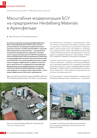 %u0411%u0415%u0422%u041e%u041d%u041d%u042b%u0415 %u0422%u0415%u0425%u041d%u041e%u041b%u041e%u0413%u0418%u041840 CPI %u2013 Concrete Plant International | Eurasia Edition %u2013 6 | 2025 www.cpi-worldwide.com%u041d%u0430 %u0437%u0430%u0432%u043e%u0434%u0435 Lindenberg %u043a%u043e%u043c%u043f%u0430%u043d%u0438%u0438 Heidelberg Materials Beton %u0432 %u0410%u0440%u0435%u043d%u0441%u0444%u0435%u043b%u044c%u0434%u0435 %u0432%u0435%u0441%u043d%u043e%u0439 2025 %u0433%u043e%u0434%u0430 %u0441%u043e%u0441%u0442%u043e%u044f%u043b%u0441%u044f %u0443%u0441%u043f%u0435%u0448%u043d%u044b%u0439 %u0432%u0432%u043e%u0434 %u0432 %u044d%u043a%u0441%u043f%u043b%u0443%u0430%u0442%u0430%u0446%u0438%u044e %u043d%u043e%u0432%u043e%u0439 %u0431%u0435%u0442%u043e%u043d%u043e%u0441%u043c%u0435%u0441%u0438%u0442%u0435%u043b%u044c%u043d%u043e%u0439 %u0443%u0441%u0442%u0430%u043d%u043e%u0432%u043a%u0438 %u0442%u0438%u043f%u0430 Mixomat THZ 3000 %u043e%u0442 %u043a%u043e%u043c%u043f%u0430%u043d%u0438%u0438 Teka. %u0426%u0435%u043d%u0442%u0440%u0430%u043b%u044c%u043d%u044b%u0439 %u043a%u043e%u043c%u043f%u043e%u043d%u0435%u043d%u0442 %u0411%u0421%u0423 %u2212 %u043a%u043e%u043b%u044c%u0446%u0435%u0432%u043e%u0439 %u0431%u0435%u0442%u043e%u043d%u043e%u0441%u043c%u0435%u0441%u0438%u0442%u0435%u043b%u044c %u043f%u0440%u0438%u043d%u0443%u0434%u0438%u0442%u0435%u043b%u044c%u043d%u043e%u0433%u043e %u0434%u0435%u0439%u0441%u0442%u0432%u0438%u044f %u0441 %u0432%u044b%u0445%u043e%u0434%u043e%u043c 2,0 %u043c%u00b3 %u0438 %u043c%u043e%u0449%u043d%u043e%u0441%u0442%u044c%u044e %u0434%u0432%u0438%u0433%u0430%u0442%u0435%u043b%u044f 75 %u043a%u0412%u0442. %u0411%u0421%u0423 %u0443%u043a%u043e%u043c%u043f%u043b%u0435%u043a%u0442%u043e%u0432%u0430%u043d%u0430 %u0438%u043d%u0442%u0435%u0433%u0440%u0438%u0440%u043e%u0432%u0430%u043d%u043d%u044b%u043c %u043e%u0431%u0435%u0441%u043f%u044b%u043b%u0438%u0432%u0430%u044e%u0449%u0438%u043c %u0443%u0441%u0442%u0440%u043e%u0439%u0441%u0442%u0432%u043e%u043c, %u0442%u043e%u0447%u043d%u043e%u0439 %u0434%u043e%u0437%u0438%u0440%u0443%u044e%u0449%u0435%u0439 %u0442%u0435%u0445%u043d%u0438%u043a%u043e%u0439 %u0438 %u0430%u0432%u0442%u043e%u043c%u0430%u0442%u0438%u0447%u0435%u0441%u043a%u0438%u043c %u0441%u043a%u0440%u0435%u0431%u043a%u043e%u043c THS 60/20 %u0441 %u0447%u0430%u0441%u0442%u043e%u0442%u043d%u044b%u043c %u043f%u0440%u0435%u043e%u0431%u0440%u0430%u0437%u043e%u0432%u0430%u0442%u0435%u043b%u0435%u043c %u0438 %u0437%u0430%u0434%u0430%u0435%u0442 %u043d%u043e%u0432%u044b%u0435 %u0441%u0442%u0430%u043d%u0434%u0430%u0440%u0442%u044b %u044d%u0444%u0444%u0435%u043a%u0442%u0438%u0432%u043d%u043e%u0441%u0442%u0438, %u0443%u0434%u043e%u0431%u0441%u0442%u0432%u0430 %u044d%u043a%u0441%u043f%u043b%u0443%u0430%u0442%u0430%u0446%u0438%u0438 %u0438 %u044d%u043a%u043e%u043b%u043e%u0433%u0438%u0447%u043d%u043e%u0441%u0442%u0438 %u043d%u0430 %u043f%u0440%u0435%u0434%u043f%u0440%u0438%u044f%u0442%u0438%u0438 %u0432 %u0410%u0440%u0435%u043d%u0441%u0444%u0435%u043b%u044c%u0434%u0435. %u041c%u043e%u0434%u0435%u0440%u043d%u0438%u0437%u0430%u0446%u0438%u044f %u0442%u0430%u043a%u0436%u0435 %u043f%u0440%u0435%u0434%u0443%u0441%u043c%u0430%u0442%u0440%u0438%u0432%u0430%u043b%u0430 %u043e%u0441%u043d%u0430%u0449%u0435%u043d%u0438%u0435 %u043f%u043e%u043b%u043d%u043e%u0441%u0442%u044c%u044e %u043d%u043e%u0432%u043e%u0439 %u0441%u0438%u0441%u0442%u0435%u043c%u043e%u0439 %u0443%u043f%u0440%u0430%u0432%u043b%u0435%u043d%u0438%u044f %u0438 %u043e%u043f%u0435%u0440%u0430%u0442%u043e%u0440%u0441%u043a%u0438%u043c %u043c%u043e%u0434%u0443%u043b%u0435%u043c, %u0447%u0442%u043e %u043e%u0442%u043a%u0440%u044b%u043b%u043e %u043d%u043e%u0432%u044b%u0435 %u043f%u0435%u0440%u0441%u043f%u0435%u043a%u0442%u0438%u0432%u044b %u0441 %u0442%u043e%u0447%u043a%u0438 %u0437%u0440%u0435%u043d%u0438%u044f %u044d%u0444%u0444%u0435%u043a%u0442%u0438%u0432%u043d%u043e%u0441%u0442%u0438 %u0431%u0435%u0442%u043e%u043d%u043d%u043e%u0433%u043e %u043f%u0440%u043e%u0438%u0437%u0432%u043e%u0434%u0441%u0442%u0432%u0430. %u0411%u0443%u0434%u0443%u0447%u0438 %u0434%u043e%u0447%u0435%u0440%u043d%u0435%u0439 %u043a%u043e%u043c%u043f%u0430%u043d%u0438%u0435%u0439 %u043a%u043e%u043d%u0446%u0435%u0440%u043d%u0430 Heidelberg Materials AG, Heidelberg Materials Beton DE GmbH %u043a%u043e%u043d%u0441%u043e%u043b%u0438%u0434%u0438%u0440%u0443%u0435%u0442 %u0432%u0441%u044e %u0434%u0435%u044f%u0442%u0435%u043b%u044c%u043d%u043e%u0441%u0442%u044c, %u0441%u0432%u044f%u0437%u0430%u043d%u043d%u0443%u044e %u0441 %u043f%u0440%u043e%u0438%u0437%u0432%u043e%u0434%u0441%u0442%u0432%u043e%u043c %u0442%u043e%u0432%u0430%u0440%u043d%u043e%u0433%u043e %u0431%u0435%u0442%u043e%u043d%u0430, %u0441%u0442%u0440%u043e%u0438%u0442%u0435%u043b%u044c%u043d%u044b%u0445 %u0440%u0430%u0441%u0442%u0432%u043e%u0440%u043e%u0432, %u043d%u0430%u043b%u0438%u0432%u043d%u044b%u0445 %u043f%u043e%u043b%u043e%u0432 %u0438 %u0441%u043f%u0435%u0446%u0438%u0430%u043b%u044c%u043d%u044b%u0445 %u0441%u0442%u0440%u043e%u0438%u0442%u0435%u043b%u044c%u043d%u044b%u0445 %u043c%u0430%u0442%u0435%u0440%u0438%u0430%u043b%u043e%u0432 %u0432 %u0413%u0435%u0440%u043c%u0430%u043d%u0438%u0438. %u0418%u043c%u0435%u044f %u0432 %u0441%u0432%u043e%u0435%u043c %u0430%u043a%u0442%u0438%u0432%u0435 %u043e%u043a%u043e%u043b%u043e 170 %u0437%u0430%u0432%u043e%u0434%u043e%u0432 %u043f%u043e %u043f%u0440%u043e%u0438%u0437%u0432%u043e%u0434%u0441%u0442%u0432%u0443 %u0442%u043e%u0432%u0430%u0440%u043d%u043e%u0433%u043e %u0431%u0435%u0442%u043e%u043d%u0430, %u0431%u043e%u043b%u0435%u0435 750 %u0430%u0432%u0442%u043e%u0431%u0435%u0442%u043e%u043d%u043e%u0441%u043c%u0435%u0441%u0438%u0442%u0435%u043b%u0435%u0439 %u0438 %u0441%u0432%u044b%u0448%u0435 150 %u0431%u0435%u0442%u043e%u043d%u043e%u043d%u0430%u0441%u043e%u0441%u043e%u0432, %u043a%u043e%u043c%u043f%u0430%u043d%u0438%u044f %u0432%u0445%u043e%u0434%u0438%u0442 %u0432 %u0447%u0438%u0441%u043b%u043e %u0432%u0435%u0434%u0443%u0449%u0438%u0445 %u043f%u043e%u0441%u0442%u0430%u0432%