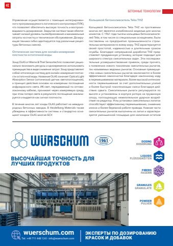 %u0411%u0415%u0422%u041e%u041d%u041d%u042b%u0415 %u0422%u0415%u0425%u041d%u041e%u041b%u041e%u0413%u0418%u0418www.cpi-worldwide.com CPI %u2013 Concrete Plant International | Eurasia Edition %u2013 6 | 2025 45%u0423%u043f%u0440%u0430%u0432%u043b%u0435%u043d%u0438%u0435 %u043e%u0441%u0443%u0449%u0435%u0441%u0442%u0432%u043b%u044f%u0435%u0442%u0441%u044f %u0441 %u043f%u043e%u043c%u043e%u0449%u044c%u044e %u0438%u043d%u0442%u0435%u0433%u0440%u0438%u0440%u043e%u0432%u0430%u043d%u043d%u043e%u0433%u043e %u043f%u0440%u043e%u0433%u0440%u0430%u043c%u043c%u0438%u0440%u0443%u0435%u043c%u043e%u0433%u043e %u043b%u043e%u0433%u0438%u0447%u0435%u0441%u043a%u043e%u0433%u043e %u043a%u043e%u043d%u0442%u0440%u043e%u043b%u043b%u0435%u0440%u0430 (%u041f%u041b%u041a),%u0447%u0442%u043e %u043f%u043e%u0437%u0432%u043e%u043b%u044f%u0435%u0442 %u043e%u0431%u0435%u0441%u043f%u0435%u0447%u0438%u0442%u044c %u0432%u044b%u0441%u043e%u043a%u0443%u044e %u0442%u043e%u0447%u043d%u043e%u0441%u0442%u044c %u0438 %u0432%u043e%u0441%u043f%u0440%u043e%u0438%u0437%u0432%u043e%u0434%u0438%u043c%u043e%u0441%u0442%u044c %u0434%u043e%u0437%u0438%u0440%u043e%u0432%u0430%u043d%u0438%u044f. %u0417%u0430%u043a%u0440%u044b%u0442%u0430%u044f %u0441%u0438%u0441%u0442%u0435%u043c%u0430 %u0442%u0430%u043a%u0436%u0435 %u043e%u0431%u0435%u0441%u043f%u0435%u0447%u0438%u0432%u0430%u0435%u0442 %u043d%u0438%u0437%u043a%u0438%u0439 %u0443%u0440%u043e%u0432%u0435%u043d%u044c %u043f%u044b%u043b%u0435%u043e%u0431%u0440%u0430%u0437%u043e%u0432%u0430%u043d%u0438%u044f %u0438 %u043c%u0438%u043d%u0438%u043c%u0430%u043b%u044c%u043d%u044b%u0435 %u0437%u0430%u0442%u0440%u0430%u0442%u044b %u043d%u0430 %u043e%u0447%u0438%u0441%u0442%u043a%u0443 %u0438 %u0442%u0435%u0445%u043d%u0438%u0447%u0435%u0441%u043a%u043e%u0435 %u043e%u0431%u0441%u043b%u0443%u0436%u0438%u0432%u0430%u043d%u0438%u0435. %u0414%u043e%u0437%u0438%u0440%u0443%u044e%u0449%u0430%u044f %u0442%u0435%u0445%u043d%u0438%u043a%u0430 %u0433%u0438%u0431%u043a%u043e %u0430%u0434%u0430%u043f%u0442%u0438%u0440%u0443%u0435%u0442%u0441%u044f %u043f%u043e%u0434 %u0440%u0430%u0437%u043b%u0438%u0447%u043d%u044b%u0435 %u0440%u0435%u0446%u0435%u043f%u0442%u0443%u0440%u044b %u0431%u0435%u0442%u043e%u043d%u043d%u044b%u0445 %u0441%u043c%u0435%u0441%u0435%u0439.%u041e%u043f%u0442%u0438%u0447%u0435%u0441%u043a%u0430%u044f %u0441%u0438%u0441%u0442%u0435%u043c%u0430 %u0434%u043b%u044f %u043e%u043d%u043b%u0430%u0439%u043d-%u0438%u0437%u043c%u0435%u0440%u0435%u043d%u0438%u044f %u043f%u043b%u043e%u0442%u043d%u043e%u0441%u0442%u0438 %u043e%u0441%u0442%u0430%u0442%u043e%u0447%u043d%u043e%u0439 %u0432%u043e%u0434%u044b%u0417%u043e%u043d%u0434 OLAS %u043e%u0442 Werne & Thiel Sensortechnic %u043f%u043e%u0437%u0432%u043e%u043b%u044f%u0435%u0442 %u0440%u0430%u0446%u0438%u043e%u043d%u0430%u043b%u044c%u043d%u043e %u044d%u043a%u043e%u043d%u043e%u043c%u0438%u0442%u044c %u0440%u0435%u0441%u0443%u0440%u0441%u044b %u0438 %u043e%u0434%u043d%u043e%u0432%u0440%u0435%u043c%u0435%u043d%u043d%u043e %u0438%u0441%u043f%u043e%u043b%u044c%u0437%u043e%u0432%u0430%u0442%u044c %u043f%u0440%u0435%u0438%u043c%u0443%u0449%u0435%u0441%u0442%u0432%u0430 %u0432 %u0432%u0438%u0434%u0435 %u0441%u043d%u0438%u0436%u0435%u043d%u0438%u044f %u0437%u0430%u0442%u0440%u0430%u0442. %u0417%u043e%u043d%u0434 %u043f%u0440%u0435%u0434%u0441%u0442%u0430%u0432%u043b%u044f%u0435%u0442 %u0441%u043e%u0431%u043e%u0439 %u043e%u043f%u0442%u0438%u0447%u0435%u0441%u043a%u0443%u044e %u0441%u0438%u0441%u0442%u0435%u043c%u0443 %u0434%u043b%u044f %u043e%u043d%u043b%u0430%u0439%u043d-%u0438%u0437%u043c%u0435%u0440%u0435%u043d%u0438%u044f %u043f%u043b%u043e%u0442%u043d%u043e%u0441%u0442%u0438 %u043e%u0441%u0442%u0430%u0442%u043e%u0447%u043d%u043e%u0439 %u0432%u043e%u0434%u044b. %u041d%u0430%u0437%u0432%u0430%u043d%u0438%u0435 OLAS %u043e%u0437%u043d%u0430%u0447%u0430%u0435%u0442 Optical LightAbsorption Sensor (%u043e%u043f%u0442%u0438%u0447%u0435%u0441%u043a%u0438%u0439 %u0434%u0430%u0442%u0447%u0438%u043a %u0441%u0432%u0435%u0442%u043e%u043f%u043e%u0433%u043b%u043e%u0449%u0435%u043d%u0438%u044f), %u0430 %u043f%u0440%u0438%u043d%u0446%u0438%u043f %u0434%u0435%u0439%u0441%u0442%u0432%u0438%u044f %u043e%u0441%u043d%u043e%u0432%u0430%u043d %u043d%u0430 %u0438%u0437%u043c%u0435%u0440%u0435%u043d%u0438%u0438 %u043f%u043e%u0433%u043b%u043e%u0449%u0435%u043d%u0438%u044f %u0438%u043d%u0444%u0440%u0430%u043a%u0440%u0430%u0441%u043d%u043e%u0433%u043e %u0441%u0432%u0435%u0442%u0430. %u0418%u041a-%u0441%u0432%u0435%u0442, %u043f%u0435%u0440%u0435%u0434%u0430%u0432%u0430%u0435%u043c%u044b%u0439 %u043f%u043e %u043e%u043f%u0442%u043e%u0432%u043e%u043b%u043e%u043a%u043e%u043d%u043d%u043e%u043c%u0443 %u043a%u0430%u0431%u0435%u043b%u044e, %u043f%u0440%u043e%u043d%u0438%u043a%u0430%u0435%u0442 %u0447%u0435%u0440%u0435%u0437 %u0438%u0437%u043c%u0435%u0440%u044f%u0435%u043c%u0443%u044e %u0441%u0440%u0435%u0434%u0443, %u043f%u0440%u0438 %u044d%u0442%u043e%u043c %u043f%u043e%u0442%u0435%u0440%u044f %u0441%u0432%u0435%u0442%u0430 %u0432 %u0440%u0435%u0437%u0443%u043b%u044c%u0442%u0430%u0442%u0435 %u043f%u043e%u0433%u043b%u043e%u0449%u0435%u043d%u0438%u044f %u0430%u043d%u0430%u043b%u0438%u0437%u0438%u0440%u0443%u0435%u0442%u0441%u044f %u0438 %u0432%u044b%u0434%u0430%u0435%u0442%u0441%u044f %u043a%u0430%u043a %u0441%u0438%u0433%u043d%u0430%u043b %u043f%u043b%u043e%u0442%u043d%u043e%u0441%u0442%u0438.%u0412 %u0442%u0435%u0447%u0435%u043d%u0438%u0435 %u043c%u043d%u043e%u0433%u0438%u0445 %u043b%u0435%u0442 %u0437%u043e%u043d%u0434%u044b OLAS %u0440%u0430%u0431%u043e%u0442%u0430%u044e%u0442 %u043d%u0430 %u043c%u0435%u0436%u0434%u0443%u043d%u0430%u0440%u043e%u0434%u043d%u044b%u0445 %u0431%u0435%u0442%u043e%u043d%u043d%u044b%u0445 %u0437%u0430%u0432%u043e%u0434%u0430%u0445. %u0412 Heidelberg Materials %u0442%u0430%u043a%u0436%u0435 %u0443%u0431%u0435%u0436%u0434%u0435%u043d%u044b %u0432 %u044d%u0444%u0444%u0435%u043a%u0442%u0438%u0432%u043d%u043e%u0441%u0442%u0438 %u0441%u0438%u0441%u0442%u0435%u043c%u044b %u0438 %u0441%