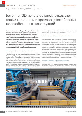 48 CPI %u2013 Concrete Plant International | Eurasia Edition %u2013 6 | 2025 www.cpi-worldwide.com%u0418%u0442%u0430%u043b%u044c%u044f%u043d%u0441%u043a%u0430%u044f %u043a%u043e%u043c%u043f%u0430%u043d%u0438%u044f Progress Group %u0438%u0437 %u0411%u0440%u0435%u0441%u0441%u0430%u043d%u043e%u043d%u0435 %u0434%u043e%u0441%u0442%u0438%u0433%u043b%u0430 %u0442%u0435%u0445%u043d%u043e%u043b%u043e%u0433%u0438%u0447%u0435%u0441%u043a%u043e%u0433%u043e %u043f%u0440%u043e%u0440%u044b%u0432%u0430, %u0440%u0430%u0437%u0440%u0430%u0431%u043e%u0442%u0430%u0432 3D-%u043f%u0440%u0438%u043d%u0442%u0435%u0440 %u0434%u043b%u044f %u0431%u0435%u0442%u043e%u043d%u0430 SPI (Selective Paste Intrusion). %u0411%u043b%u0430%u0433%u043e%u0434%u0430%u0440%u044f %u0432%u043e%u0437%u043c%u043e%u0436%u043d%u043e%u0441%u0442%u0438 %u0441%u043e%u0437%u0434%u0430%u043d%u0438%u044f %u0441%u043b%u043e%u0436%u043d%u044b%u0445 %u0444%u043e%u0440%u043c, %u0432%u044b%u0441%u043e%u043a%u043e%u0439 %u0442%u043e%u0447%u043d%u043e%u0441%u0442%u0438 %u0438 %u0440%u0430%u0446%u0438%u043e%u043d%u0430%u043b%u044c%u043d%u043e%u043c%u0443 %u0438%u0441%u043f%u043e%u043b%u044c%u0437%u043e%u0432%u0430%u043d%u0438%u044e %u0440%u0435%u0441%u0443%u0440%u0441%u043e%u0432 %u044d%u0442%u0430 %u0442%u0435%u0445%u043d%u043e%u043b%u043e%u0433%u0438%u044f %u043f%u0440%u0435%u0434%u043b%u0430%u0433%u0430%u0435%u0442 %u0441%u043e%u0432%u0435%u0440%u0448%u0435%u043d%u043d%u043e %u043d%u043e%u0432%u044b%u0435 %u043f%u0435%u0440%u0441%u043f%u0435%u043a%u0442%u0438%u0432%u044b %u0434%u043b%u044f %u043f%u0440%u043e%u043c%u044b%u0448%u043b%u0435%u043d%u043d%u043e%u0441%u0442%u0438 %u0441%u0431%u043e%u0440%u043d%u043e%u0433%u043e %u0436%u0435%u043b%u0435%u0437%u043e%u0431%u0435%u0442%u043e%u043d%u0430. %u041a%u0443%u0440%u043e%u0440%u0442%u043d%u044b%u0439 %u043a%u043e%u043c%u043f%u043b%u0435%u043a%u0441 Pareus %u0432 %u041a%u0430%u043e%u0440%u043b%u0435 %u0432 %u043d%u0430%u0441%u0442%u043e%u044f%u0449%u0435%u0435 %u0432%u0440%u0435%u043c%u044f %u044f%u0432%u043b%u044f%u0435%u0442%u0441%u044f %u043d%u0430%u0438%u0431%u043e%u043b%u0435%u0435 %u0437%u043d%u0430%u0447%u0438%u043c%u044b%u043c %u0440%u0435%u0444%u0435%u0440%u0435%u043d%u0441%u043d%u044b%u043c %u043f%u0440%u043e%u0435%u043a%u0442%u043e%u043c, %u043d%u0430%u0433%u043b%u044f%u0434%u043d%u043e %u0434%u0435%u043c%u043e%u043d%u0441%u0442%u0440%u0438%u0440%u0443%u044e%u0449%u0438%u043c %u0432%u043e%u0437%u043c%u043e%u0436%u043d%u043e%u0441%u0442%u0438 %u0442%u0435%u0445%u043d%u043e%u043b%u043e%u0433%u0438%u0438 %u0432 %u043a%u0440%u0443%u043f%u043d%u043e%u043c %u043f%u0440%u043e%u043c%u044b%u0448%u043b%u0435%u043d%u043d%u043e%u043c %u043c%u0430%u0441%u0448%u0442%u0430%u0431%u0435.%u041d%u043e%u0432%u044b%u0435 %u0433%u0440%u0430%u043d%u0438 %u0444%u043e%u0440%u043c%u044b %u0438 %u0444%u0443%u043d%u043a%u0446%u0438%u043e%u043d%u0430%u043b%u044c%u043d%u043e%u0441%u0442%u0438%u0420%u0430%u0437%u0440%u0430%u0431%u043e%u0442%u0430%u043d%u043d%u044b%u0439 %u0432 %u043d%u0430%u0443%u0447%u043d%u043e-%u0438%u0441%u0441%u043b%u0435%u0434%u043e%u0432%u0430%u0442%u0435%u043b%u044c%u0441%u043a%u043e%u043c %u043e%u0442%u0434%u0435%u043b%u0435 3D-%u043f%u0440%u0438%u043d%u0442%u0435%u0440 SPI %u0440%u0430%u0441%u0448%u0438%u0440%u044f%u0435%u0442 %u0432%u043e%u0437%u043c%u043e%u0436%u043d%u043e%u0441%u0442%u0438 %u0442%u0440%u0430%u0434%u0438%u0446%u0438%u043e%u043d%u043d%u043e%u0433%u043e %u043f%u0440%u043e%u0438%u0437%u0432%u043e%u0434%u0441%u0442%u0432%u0430 %u0441%u0431%u043e%u0440%u043d%u044b%u0445 %u0436/%u0431 %u043a%u043e%u043d%u0441%u0442%u0440%u0443%u043a%u0446%u0438%u0439, %u043f%u0440%u0435%u0434%u043b%u0430%u0433%u0430%u044f %u0433%u0438%u0431%u043a%u0438%u0439 %u0438%u043d%u0441%u0442%u0440%u0443%u043c%u0435%u043d%u0442 %u0434%u043b%u044f %u0430%u0440%u0445%u0438%u0442%u0435%u043a%u0442%u043e%u0440%u043e%u0432, %u0438%u043d%u0436%u0435%u043d%u0435%u0440%u043e%u0432 %u0438 %u043f%u0440%u043e%u0438%u0437%u0432%u043e%u0434%u0438%u0442%u0435%u043b%u0435%u0439. %u0411%u043b%u0430%u0433%u043e%u0434%u0430%u0440%u044f %u0442%u043e%u043b%u0449%u0438%u043d%u0435 %u0441%u043b%u043e%u044f %u0432%u0441%u0435%u0433%u043e %u0442%u0440%u0438 %u043c%u0438%u043b%u043b%u0438%u043c%u0435%u0442%u0440%u0430 %u0441%u043e%u0437%u0434%u0430%u044e%u0442%u0441%u044f %u0441%u0442%u0440%u043e%u0438%u0442%u0435%u043b%u044c%u043d%u044b%u0435 %u044d%u043b%u0435%u043c%u0435%u043d%u0442%u044b %u0441 %u0432%u044b%u0441%u043e%u043a%u043e%u0439 %u0434%u0435%u0442%u0430%u043b%u0438%u0437%u0430%u0446%u0438%u0435%u0439 %u2212 %u043e%u0442 %u0444%u0430%u0441%u0430%u0434%u043e%u0432 %u0438 %u043c%u0435%u0431%u0435%u043b%u0438 %u0434%u043e %u0441%u043f%u0435%u0446%u0438%u0430%u043b%u044c%u043d%u044b%u0445 %u0438%u0437%u0434%u0435%u043b%u0438%u0439. %u0420%u0430%u0437%u043c%u0435%u0440%u044b %u043f%u0440%u0438%u043d%u0442%u0435%u0440%u0430 (4,00 %u043c %u0432 %u0434%u043b%u0438%u043d%u0443, 2,50 %u043c %u0432 %u0448%u0438%u0440%u0438%u043d%u0443 %u0438 1,00 %u043c %u0432 %u0432%u044b%u0441%u043e%u0442%u0443) %u043f%u043e%u0437%u0432%u043e%u043b%u044f%u044e%u0442 %u043e%u0431%u0435%u0441%u043f%u0435%u0447%u0438%u0442%u044c %u044d%u0444%u0444%u0435%u043a%u0442%u0438%u0432%u043d%u043e%u0441%u0442%u044c %u0442%u0440%u0430%u043d%u0441%u043f%u043e%u0440%u0442%u0438%u0440%u043e%u0432%u043a%u0438 %u0438 %u043f%u043e%u0441%u043b%u0435%u0434%u0443%u044e%u0449%u0435%u0439 %u043e%u0431%u0440%u0430%u0431%u043e%u0442%u043a%u0438.%u0422%u0435%u0445%u043d%u043e%u043b%u043e%u0433%u0438%u044f SPI: %u043f%u043e%u0441%u043b%u043e%u0439%u043d%u043e%u0435 %u0441%u0442%u0440%u043e%u0438%u0442%u0435%u043b%u044c%u0441%u0442%u0432%u043e%u041c%u0435%u0442%u043e%u0434 Selective Paste Intrusion (SPI) %u0440%u0430%u0431%u043e%u0442%u0430%u0435%u0442 %u043f%u043e %u043f%u0440%u0438%u043d%u0446%u0438%u043f%u0443, %u0430%u043d%u0430%u043b%u043e%u0433%u0438%u0447%u043d%u043e%u043c%u0443 %u0441%u0435%u043b%u0435%u043a%u0442%u0438%u0432%u043d%u043e%u043c%u0443 %u043b%u0430%u0437%u