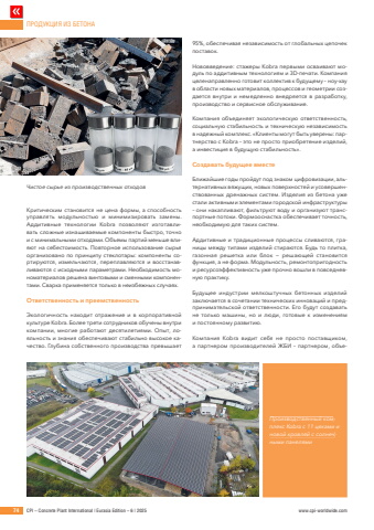 %u041f%u0420%u041e%u0414%u0423%u041a%u0426%u0418%u042f %u0418%u0417 %u0411%u0415%u0422%u041e%u041d%u041074 CPI %u2013 Concrete Plant International | Eurasia Edition %u2013 6 | 2025 www.cpi-worldwide.com%u041a%u0440%u0438%u0442%u0438%u0447%u0435%u0441%u043a%u0438%u043c %u0441%u0442%u0430%u043d%u043e%u0432%u0438%u0442%u0441%u044f %u043d%u0435 %u0446%u0435%u043d%u0430 %u0444%u043e%u0440%u043c%u044b, %u0430 %u0441%u043f%u043e%u0441%u043e%u0431%u043d%u043e%u0441%u0442%u044c%u0443%u043f%u0440%u0430%u0432%u043b%u044f%u0442%u044c %u043c%u043e%u0434%u0443%u043b%u044c%u043d%u043e%u0441%u0442%u044c%u044e %u0438 %u043c%u0438%u043d%u0438%u043c%u0438%u0437%u0438%u0440%u043e%u0432%u0430%u0442%u044c %u0437%u0430%u043c%u0435%u043d%u044b. %u0410%u0434%u0434%u0438%u0442%u0438%u0432%u043d%u044b%u0435 %u0442%u0435%u0445%u043d%u043e%u043b%u043e%u0433%u0438%u0438 Kobra %u043f%u043e%u0437%u0432%u043e%u043b%u044f%u044e%u0442 %u0438%u0437%u0433%u043e%u0442%u0430%u0432%u043b%u0438%u0432%u0430%u0442%u044c %u0441%u043b%u043e%u0436%u043d%u044b%u0435 %u0438%u0437%u043d%u0430%u0448%u0438%u0432%u0430%u0435%u043c%u044b%u0435 %u043a%u043e%u043c%u043f%u043e%u043d%u0435%u043d%u0442%u044b %u0431%u044b%u0441%u0442%u0440%u043e, %u0442%u043e%u0447%u043d%u043e %u0438 %u0441 %u043c%u0438%u043d%u0438%u043c%u0430%u043b%u044c%u043d%u044b%u043c%u0438 %u043e%u0442%u0445%u043e%u0434%u0430%u043c%u0438. %u041e%u0431%u044a%u0435%u043c%u044b %u043f%u0430%u0440%u0442%u0438%u0439 %u043c%u0435%u043d%u044c%u0448%u0435 %u0432%u043b%u0438%u044f%u044e%u0442 %u043d%u0430 %u0441%u0435%u0431%u0435%u0441%u0442%u043e%u0438%u043c%u043e%u0441%u0442%u044c. %u041f%u043e%u0432%u0442%u043e%u0440%u043d%u043e%u0435 %u0438%u0441%u043f%u043e%u043b%u044c%u0437%u043e%u0432%u0430%u043d%u0438%u0435 %u0441%u044b%u0440%u044c%u044f%u043e%u0440%u0433%u0430%u043d%u0438%u0437%u043e%u0432%u0430%u043d%u043e %u043f%u043e %u043f%u0440%u0438%u043d%u0446%u0438%u043f%u0443 %u0441%u0442%u0435%u043a%u043b%u043e%u0442%u0430%u0440%u044b: %u043a%u043e%u043c%u043f%u043e%u043d%u0435%u043d%u0442%u044b %u0441%u043e%u0440%u0442%u0438%u0440%u0443%u044e%u0442%u0441%u044f, %u0438%u0437%u043c%u0435%u043b%u044c%u0447%u0430%u044e%u0442%u0441%u044f, %u043f%u0435%u0440%u0435%u043f%u043b%u0430%u0432%u043b%u044f%u044e%u0442%u0441%u044f %u0438 %u0432%u043e%u0441%u0441%u0442%u0430%u043d%u0430%u0432%u043b%u0438%u0432%u0430%u044e%u0442%u0441%u044f %u0441 %u0438%u0441%u0445%u043e%u0434%u043d%u044b%u043c%u0438 %u043f%u0430%u0440%u0430%u043c%u0435%u0442%u0440%u0430%u043c%u0438. %u041d%u0435%u043e%u0431%u0445%u043e%u0434%u0438%u043c%u043e%u0441%u0442%u044c %u043c%u043e%u043d%u043e%u043c%u0430%u0442%u0435%u0440%u0438%u0430%u043b%u043e%u0432 %u0440%u0435%u0448%u0435%u043d%u0430 %u0432%u0438%u043d%u0442%u043e%u0432%u044b%u043c%u0438 %u0438 %u0441%u043c%u0435%u043d%u043d%u044b%u043c%u0438 %u043a%u043e%u043c%u043f%u043e%u043d%u0435%u043d%u0442%u0430%u043c%u0438. %u0421%u0432%u0430%u0440%u043a%u0430 %u043f%u0440%u0438%u043c%u0435%u043d%u044f%u0435%u0442%u0441%u044f %u0442%u043e%u043b%u044c%u043a%u043e %u0432 %u043d%u0435%u0438%u0437%u0431%u0435%u0436%u043d%u044b%u0445 %u0441%u043b%u0443%u0447%u0430%u044f%u0445.%u041e%u0442%u0432%u0435%u0442%u0441%u0442%u0432%u0435%u043d%u043d%u043e%u0441%u0442%u044c %u0438 %u043f%u0440%u0435%u0435%u043c%u0441%u0442%u0432%u0435%u043d%u043d%u043e%u0441%u0442%u044c%u042d%u043a%u043e%u043b%u043e%u0433%u0438%u0447%u043d%u043e%u0441%u0442%u044c %u043d%u0430%u0445%u043e%u0434%u0438%u0442 %u043e%u0442%u0440%u0430%u0436%u0435%u043d%u0438%u0435 %u0438 %u0432 %u043a%u043e%u0440%u043f%u043e%u0440%u0430%u0442%u0438%u0432%u043d%u043e%u0439 %u043a%u0443%u043b%u044c%u0442%u0443%u0440%u0435 Kobra. %u0411%u043e%u043b%u0435%u0435 %u0442%u0440%u0435%u0442%u0438 %u0441%u043e%u0442%u0440%u0443%u0434%u043d%u0438%u043a%u043e%u0432 %u043e%u0431%u0443%u0447%u0435%u043d%u044b %u0432%u043d%u0443%u0442%u0440%u0438 %u043a%u043e%u043c%u043f%u0430%u043d%u0438%u0438, %u043c%u043d%u043e%u0433%u0438%u0435 %u0440%u0430%u0431%u043e%u0442%u0430%u044e%u0442 %u0434%u0435%u0441%u044f%u0442%u0438%u043b%u0435%u0442%u0438%u044f%u043c%u0438. %u041e%u043f%u044b%u0442, %u043b%u043e%u044f%u043b%u044c%u043d%u043e%u0441%u0442%u044c %u0438 %u0437%u043d%u0430%u043d%u0438%u044f %u043e%u0431%u0435%u0441%u043f%u0435%u0447%u0438%u0432%u0430%u044e%u0442 %u0441%u0442%u0430%u0431%u0438%u043b%u044c%u043d%u043e %u0432%u044b%u0441%u043e%u043a%u043e%u0435 %u043a%u0430%u0447%u0435%u0441%u0442%u0432%u043e. %u0413%u043b%u0443%u0431%u0438%u043d%u0430 %u0441%u043e%u0431%u0441%u0442%u0432%u0435%u043d%u043d%u043e%u0433%u043e %u043f%u0440%u043e%u0438%u0437%u0432%u043e%u0434%u0441%u0442%u0432%u0430 %u043f%u0440%u0435%u0432%u044b%u0448%u0430%u0435%u0442 95%, %u043e%u0431%u0435%u0441%u043f%u0435%u0447%u0438%u0432%u0430%u044f %u043d%u0435%u0437%u0430%u0432%u0438%u0441%u0438%u043c%u043e%u0441%u0442%u044c %u043e%u0442 %u0433%u043b%u043e%u0431%u0430%u043b%u044c%u043d%u044b%u0445 %u0446%u0435%u043f%u043e%u0447%u0435%u043a %u043f%u043e%u0441%u0442%u0430%u0432%u043e%u043a.%u041d%u043e%u0432%u043e%u0432%u0432%u0435%u0434%u0435%u043d%u0438%u0435: %u0441%u0442%u0430%u0436%u0435%u0440%u044b Kobra %u043f%u0435%u0440%u0432%u044b%u043c%u0438 %u043e%u0441%u0432%u0430%u0438%u0432%u0430%u044e%u0442 %u043c%u043e%u0434%u0443%u043b%u044c %u043f%u043e %u0430%u0434%u0434%u0438%u0442%u0438%u0432%u043d%u044b%u043c %u0442%u0435%u0445%u043d%u043e%u043b%u043e%u0433%u0438%u044f%u043c %u0438 3D-%u043f%u0435%u0447%u0430%u0442%u0438. %u041a%u043e%u043c%u043f%u0430%u043d%u0438%u044f %u0446%u0435%u043b%u0435%u043d%u0430%u043f%u0440%u0430%u0432%u043b%u0435%u043d%u043d%u043e %u0433%u043e%u0442%u043e%u0432%u0438%u0442 %u043a%u043e%u043b%u043b%u0435%u043a%u0442%u0438%u0432 %u043a %u0431%u0443%u0434%u0443%u0449%u0435%u043c%u0443 %u2013 %u043d%u043e%u0443-%u0445%u0430%u0443%u0432 %u043e%u0431%u043b%u0430%u0441%u0442%u0438 %u043d%u043e%u0432%u044b%u0445 %u043c%u0430%u0442%u0435%u0440%u0438%u0430%u043b%u043e%u0432, %u043f%u0440%u043e%u0446%u0435%u0441%u0441%u043e%u0432 %u0438 %u0433%u0435%u