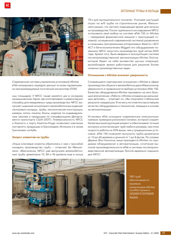 %u0411%u0415%u0422%u041e%u041d%u041d%u042b%u0415 %u0422%u0420%u0423%u0411%u042b %u0418 %u041a%u041e%u041b%u042c%u0426%u0410www.cpi-worldwide.com CPI %u2013 Concrete Plant International | Eurasia Edition %u2013 6 | 2025 77%u043d%u044b%u0445 %u043f%u043b%u043e%u0449%u0430%u0434%u0435%u0439. %u0423 NPCC %u0442%u0430%u043a%u0436%u0435 %u0438%u043c%u0435%u0435%u0442%u0441%u044f %u0446%u0435%u0445 %u0432 %u0441%u043e%u0441%u0435%u0434%u043d%u0435%u043c %u043f%u0440%u043e%u043c%u044b%u0448%u043b%u0435%u043d%u043d%u043e%u043c %u043f%u0430%u0440%u043a%u0435, %u0433%u0434%u0435 %u0438%u0437%u0433%u043e%u0442%u0430%u0432%u043b%u0438%u0432%u0430%u044e%u0442 %u0438 %u0440%u0435%u043c%u043e%u043d%u0442%u0438%u0440%u0443%u044e%u0442 %u043e%u043f%u0430%u043b%u0443%u0431%u043a%u0443 %u0434%u043b%u044f %u0435%u0436%u0435%u0434%u043d%u0435%u0432%u043d%u044b%u0445 %u043d%u0443%u0436%u0434 %u043f%u0440%u043e%u0438%u0437%u0432%u043e%u0434%u0441%u0442%u0432%u0430. NPCC %u0432%u044b%u043f%u0443%u0441%u043a%u0430%u0435%u0442 %u0448%u0438%u0440%u043e%u043a%u0438%u0439 %u0430%u0441%u0441%u043e%u0440%u0442%u0438%u043c%u0435%u043d%u0442 %u0436%u0435%u043b%u0435%u0437%u043e%u0431%u0435%u0442%u043e%u043d%u043d%u044b%u0445 %u0438%u0437%u0434%u0435%u043b%u0438%u0439:%u0441%u043c%u043e%u0442%u0440%u043e%u0432%u044b%u0435 %u043a%u043e%u043b%u043e%u0434%u0446%u044b, %u0442%u0440%u0443%u0431%u044b, %u044d%u043a%u043e%u043b%u043e%u0433%u0438%u0447%u0435%u0441%u043a%u0438%u0435 %u043a%u043e%u043d%u0441%u0442%u0440%u0443%u043a%u0446%u0438%u0438, %u043a%u0430%u043c%u0435%u0440%u044b, %u043b%u043e%u0442%u043a%u0438, %u043f%u0430%u043d%u0435%u043b%u0438, %u0431%u043e%u043a%u0441%u044b, %u0438%u0437%u0434%u0435%u043b%u0438%u044f %u043f%u043e %u0438%u043d%u0434%u0438%u0432%u0438%u0434%u0443%u0430%u043b%u044c%u043d%u044b%u043c %u0437%u0430%u043a%u0430%u0437%u0430%u043c %u0438 %u043f%u0440%u043e%u0434%u0443%u043a%u0446%u0438%u044e %u043f%u043e %u0441%u043f%u0435%u0446%u0438%u0444%u0438%u043a%u0430%u0446%u0438%u044f%u043c %u0414%u0435%u043f%u0430%u0440%u0442%u0430%u043c%u0435%u043d%u0442%u0430 %u0442%u0440%u0430%u043d%u0441%u043f%u043e%u0440%u0442%u0430 %u0421%u0428%u0410 (DOT). %u0423%u043d%u0438%u0432%u0435%u0440%u0441%u0430%u043b%u044c%u043d%u043e%u0441%u0442%u044c NPCC %u0438 %u0431%u043b%u0438%u0437%u043e%u0441%u0442%u044c %u043a %u043f%u043e%u0440%u0442%u0443 %u0425%u044d%u043c%u043f%u0442%u043e%u043d-%u0420%u043e%u0443%u0434%u0441 %u043f%u043e%u0437%u0432%u043e%u043b%u044f%u044e%u0442 %u043a%u043e%u043c%u043f%u0430%u043d%u0438%u0438 %u043f%u043e%u0441%u0442%u0430%u0432%u043b%u044f%u0442%u044c %u043f%u0440%u043e%u0434%u0443%u043a%u0446%u0438%u044e %u0432 %u0413%u0440%u0435%u043d%u043b%u0430%u043d%u0434%u0438%u044e, %u0418%u0441%u043f%u0430%u043d%u0438%u044e %u0438 %u0432 %u0437%u0430%u043b%u0438%u0432 %u0413%u0443%u0430%u043d%u0442%u0430%u043d%u0430%u043c%u043e %u043d%u0430 %u041a%u0443%u0431%u0435.%u0417%u0430%u043f%u0440%u043e%u0441 %u043a%u043b%u0438%u0435%u043d%u0442%u043e%u0432 %u043d%u0430 %u0442%u0440%u0443%u0431%u044b %u00ab%u041d%u0430%u0448%u0438 %u043a%u043b%u044e%u0447%u0435%u0432%u044b%u0435 %u043a%u043b%u0438%u0435%u043d%u0442%u044b %u043e%u0431%u0440%u0430%u0442%u0438%u043b%u0438%u0441%u044c %u043a %u043d%u0430%u043c %u0441 %u043f%u0440%u043e%u0441%u044c%u0431%u043e%u0439 %u043d%u0430%u043b%u0430%u0434%u0438%u0442%u044c %u043f%u0440%u043e%u0438%u0437%u0432%u043e%u0434%u0441%u0442%u0432%u043e %u0442%u0440%u0443%u0431%u00bb, %u2212 %u043e%u0442%u043c%u0435%u0447%u0430%u0435%u0442 %u0411%u043e %u041c%u0430%u043a%u043a%u043e%u043d%u043d%u0435%u043b%u043b. %u00ab%u0424%u0430%u043a%u0442%u0438%u0447%u0435%u0441%u043a%u0438, NPCC %u0443%u0436%u0435 %u0432%u044b%u043f%u0443%u0441%u043a%u0430%u043b%u0430 %u0436%u0435%u043b%u0435%u0437%u043e%u0431%u0435%u0442%u043e%u043d%u043d%u044b%u0435 %u0442%u0440%u0443%u0431%u044b %u0434%u0438%u0430%u043c%u0435%u0442%u0440%u043e%u043c 72, 84 %u0438 96 %u0434%u044e%u0439%u043c%u043e%u0432 %u0435%u0449%u0435 %u0432 %u043a%u043e%u043d%u0446%u0435 70-%u0445 %u0434%u043b%u044f %u043c%u0443%u043d%u0438%u0446%u0438%u043f%u0430%u043b%u044c%u043d%u043e%u0433%u043e %u0442%u043e%u043d%u043d%u0435%u043b%u044f%u00bb. %u0423%u0447%u0438%u0442%u044b%u0432%u0430%u044f %u0440%u0430%u0441%u0442%u0443%u0449%u0438%u0439 %u0441%u043f%u0440%u043e%u0441 %u043d%u0430 %u0436/%u0431 %u0442%u0440%u0443%u0431%u044b %u043d%u0430 %u0441%u0442%u0440%u043e%u0438%u0442%u0435%u043b%u044c%u043d%u043e%u043c %u0440%u044b%u043d%u043a%u0435, %u041c%u0430%u043a%u043a%u043e%u043d%u043d%u0435%u043b%u043b %u0440%u0435%u0448%u0438%u043b, %u0447%u0442%u043e %u043d%u0430%u0441%u0442%u0430%u043b%u043e %u043f%u043e%u0434%u0445%u043e%u0434%u044f%u0449%u0435%u0435 %u0432%u0440%u0435%u043c%u044f %u0434%u043b%u044f %u0437%u0430%u043f%u0443%u0441%u043a%u0430 %u0438%u0445 %u043f%u0440%u043e%u0438%u0437%u0432%u043e%u0434%u0441%u0442%u0432%u0430. %u041f%u043e%u0441%u043b%u0435 %u0442%u0449%u0430%u0442%u0435%u043b%u044c%u043d%u043e%u0433%u043e %u0438%u0441%u0441%u043b%u0435%u0434%u043e%u0432%u0430%u043d%u0438%u044f NPCC %u043e%u0441%u0442%u0430%u043d%u043e%u0432%u0438%u043b%u0430 %u0441%u0432%u043e%u0439 %u0432%u044b%u0431%u043e%u0440 %u043d%u0430 %u0441%u0438%u0441%u0442%u0435%u043c%u0435 ePak 150 %u043e%u0442 Afinitas %u2212 %u043f%u0435%u0440%u0435%u0434%u043e%u0432%u043e%u0439 %u0444%u043e%u0440%u043c%u043e%u0432%u043e%u0447%u043d%u043e%u0439 %u043c%u0430%u0448%u0438%u043d%u0435 %u0441 %u043f%u0440%u0435%u0441%u0441%u0443%u044e%u0449%u0435%u0439 %u0433%u043e%u043b%u043e%u0432%u043a%u043e%u0439, %u043e%u0441%u043d%u0430%u0449%u0435%u043d%u043d%u043e%u0439 %u0441%u043e%u0432%u0440%u0435%u043c%u0435%u043d%u043d%u043e%u0439 %u0441%u0438%u0441%u0442%u0435%u043c%u043e%u0439 %u0443%u043f%u0440%u0430%u0432%u043b%u0435%u043d%u0438%u044f %u0438 %u0441%u043b%u043e%u0436%u043d%u044b%u043c%u0438 %u043f%u0440%u043e%u0433%u0440%u0430%u043c%u043c%u043d%u044b%u043c%u0438 %u0430%u043b%u0433%u043e%u0440%u0438%u0442%u043c%u0430%u043c%u0438. %u0412%u043c%u04