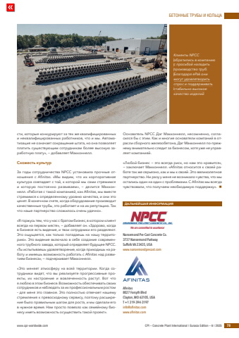 %u0411%u0415%u0422%u041e%u041d%u041d%u042b%u0415 %u0422%u0420%u0423%u0411%u042b %u0418 %u041a%u041e%u041b%u042c%u0426%u0410www.cpi-worldwide.com CPI %u2013 Concrete Plant International | Eurasia Edition %u2013 6 | 2025 79%u0441%u0442%u0438, %u043a%u043e%u0442%u043e%u0440%u044b%u0435 %u043a%u043e%u043d%u043a%u0443%u0440%u0438%u0440%u0443%u044e%u0442 %u0437%u0430 %u0442%u0435%u0445 %u0436%u0435 %u043a%u0432%u0430%u043b%u0438%u0444%u0438%u0446%u0438%u0440%u043e%u0432%u0430%u043d%u043d%u044b%u0445 %u0438 %u043d%u0435%u043a%u0432%u0430%u043b%u0438%u0444%u0438%u0446%u0438%u0440%u043e%u0432%u0430%u043d%u043d%u044b%u0445 %u0440%u0430%u0431%u043e%u0442%u043d%u0438%u043a%u043e%u0432, %u0447%u0442%u043e %u0438 %u043c%u044b. %u0410%u0432%u0442%u043e%u043c%u0430%u0442%u0438%u0437%u0430%u0446%u0438%u044f %u043d%u0435 %u043e%u0437%u043d%u0430%u0447%u0430%u0435%u0442 %u0441%u043e%u043a%u0440%u0430%u0449%u0435%u043d%u0438%u0435 %u0448%u0442%u0430%u0442%u0430, %u043d%u043e %u043e%u043d%u0430 %u043f%u043e%u0437%u0432%u043e%u043b%u044f%u0435%u0442 %u043f%u043b%u0430%u0442%u0438%u0442%u044c %u0441%u0443%u0449%u0435%u0441%u0442%u0432%u0443%u044e%u0449%u0438%u043c %u0441%u043e%u0442%u0440%u0443%u0434%u043d%u0438%u043a%u0430%u043c %u0431%u043e%u043b%u0435%u0435 %u0432%u044b%u0441%u043e%u043a%u0443%u044e %u0437%u0430%u0440%u0430%u0431%u043e%u0442%u043d%u0443%u044e %u043f%u043b%u0430%u0442%u0443%u00bb, %u2212 %u0434%u043e%u0431%u0430%u0432%u043b%u044f%u0435%u0442 %u041c%u0430%u043a%u043a%u043e%u043d%u043d%u0435%u043b%u043b.%u0421%u0445%u043e%u0436%u0435%u0441%u0442%u044c %u043a%u0443%u043b%u044c%u0442%u0443%u0440%u0417%u0430 %u0433%u043e%u0434%u044b %u0441%u043e%u0442%u0440%u0443%u0434%u043d%u0438%u0447%u0435%u0441%u0442%u0432%u0430 NPCC %u0443%u0441%u0442%u0430%u043d%u043e%u0432%u0438%u043b%u0430 %u043f%u0440%u043e%u0447%u043d%u044b%u0435 %u043e%u0442%u043d%u043e%u0448%u0435%u043d%u0438%u044f %u0441 Afinitas. %u00ab%u041c%u044b %u0432%u0438%u0434%u0438%u043c, %u0447%u0442%u043e %u0438%u0445 %u043a%u043e%u0440%u043f%u043e%u0440%u0430%u0442%u0438%u0432%u043d%u0430%u044f %u043a%u0443%u043b%u044c%u0442%u0443%u0440%u0430 %u0441%u043e%u0432%u043f%u0430%u0434%u0430%u0435%u0442 %u0441 %u0442%u043e%u0439, %u043a %u043a%u043e%u0442%u043e%u0440%u043e%u0439 %u043c%u044b %u0441%u0430%u043c%u0438 %u0441%u0442%u0440%u0435%u043c%u0438%u043c%u0441%u044f %u0438 %u043a%u043e%u0442%u043e%u0440%u0443%u044e %u043f%u043e%u0441%u0442%u043e%u044f%u043d%u043d%u043e %u0440%u0430%u0437%u0432%u0438%u0432%u0430%u0435%u043c%u00bb, %u2212 %u0434%u0435%u043b%u0438%u0442%u0441%u044f %u041c%u0430%u043a%u043a%u043e%u043d%u043d%u0435%u043b%u043b. %u00ab%u0420%u0430%u0431%u043e%u0442%u0430%u044f %u0441 %u0442%u0430%u043a%u043e%u0439 %u043a%u043e%u043c%u043f%u0430%u043d%u0438%u0435%u0439, %u043a%u0430%u043a Afinitas, %u043c%u044b %u0432%u043c%u0435%u0441%u0442%u0435 %u0441%u0442%u0440%u0435%u043c%u0438%u043c%u0441%u044f %u043a %u043e%u043f%u0440%u0435%u0434%u0435%u043b%u0435%u043d%u043d%u043e%u043c%u0443 %u0443%u0440%u043e%u0432%u043d%u044e %u043a%u0430%u0447%u0435%u0441%u0442%u0432%u0430, %u0438 %u043e%u043d%u0438 %u044d%u0442%u043e %u0446%u0435%u043d%u044f%u0442. %u0412 %u043a%u043e%u043d%u0435%u0447%u043d%u043e%u043c %u0441%u0447%u0435%u0442%u0435, %u043a%u043e%u0433%u0434%u0430 %u043e%u0431%u043e%u0440%u0443%u0434%u043e%u0432%u0430%u043d%u0438%u0435 %u043f%u0440%u043e%u0438%u0437%u0432%u043e%u0434%u0438%u0442 %u043a%u0430%u0447%u0435%u0441%u0442%u0432%u0435%u043d%u043d%u044b%u0435 %u0442%u0440%u0443%u0431%u044b, %u044d%u0442%u043e %u0440%u0430%u0431%u043e%u0442%u0430%u0435%u0442 %u0438 %u043d%u0430 %u0438%u0445 %u0440%u0435%u043f%u0443%u0442%u0430%u0446%u0438%u044e. %u0422%u0430%u043a %u0447%u0442%u043e %u043d%u0430%u0448%u0435 %u043f%u0430%u0440%u0442%u043d%u0435%u0440%u0441%u0442%u0432%u043e %u0441%u043b%u043e%u0436%u0438%u043b%u043e%u0441%u044c %u043e%u0447%u0435%u043d%u044c %u0443%u0434%u0430%u0447%u043d%u043e%u00bb.%u00ab%u042f %u0433%u043e%u0440%u0436%u0443%u0441%u044c %u0442%u0435%u043c, %u0447%u0442%u043e %u0443 %u043d%u0430%u0441 %u0441 %u0431%u0440%u0430%u0442%u043e%u043c %u0431%u0438%u0437%u043d%u0435%u0441, %u0432 %u043a%u043e%u0442%u043e%u0440%u043e%u043c %u043a%u043b%u0438%u0435%u043d%u0442 %u0432%u0441%u0435%u0433%u0434%u0430 %u043d%u0430 %u043f%u0435%u0440%u0432%u043e%u043c %u043c%u0435%u0441%u0442%u0435%u00bb, %u2212 %u0434%u043e%u0431%u0430%u0432%u043b%u044f%u0435%u0442 %u043e%u043d. %u00ab%u0417%u0434%u043e%u0440%u043e%u0432%u043e, %u043a%u043e%u0433%u0434%u0430 %u0432 %u0431%u0438%u0437%u043d%u0435%u0441%u0435 %u0435%u0441%u0442%u044c %u0432%u0438%u0434%u0435%u043d%u0438%u0435, %u0438 %u0442%u0432%u043e%u0438 %u0441%u043e%u0442%u0440%u0443%u0434%u043d%u0438%u043a%u0438 %u0435%u0433%u043e %u0440%u0430%u0437%u0434%u0435%u043b%u044f%u044e%u0442. %u042d%u0442%u043e %u043e%u0449%u0443%u0449%u0430%u0435%u0442%u0441%u044f, %u043a%u0430%u043a %u0442%u043e%u043b%u044c%u043a%u043e %u043f%u043e%u043f%u0430%u0434%u0430%u0435%u0448%u044c %u043d%u0430 %u043d%u0430%u0448%u0443 %u0442%u0435%u0440%u0440%u0438%u0442%u043e%u0440%u0438%u044e%u00bb. %u042d%u0442%u043e %u0432%u0438%u0434%u0435%u043d%u0438%u0435 %u0432%u043a%u043b%u044e%u0447%u0430%u043b%u043e %u0432 %u0441%u0435%u0431%u044f %u0441%u043e%u0437%u0434%u0430%u043d%u0438%u0435 %u0441%u043e%u0432%u0440%u0435%u043c%u0435%u043d%u043d%u043e%u0433%u043e %u0442%u0440%u0443%u0431%u043d%u043e%u0433%u043e %u0437%u0430%u0432%u043e%u0434%u0430, %u043a%u043e%u0442%u043e%u0440%u044b%u0439 %u043e%u043f%u0440%u0435%u0434%u0435%u043b%u044f%u0435%u0442 %u0431%u0443%u0434%u0443%u0449%u0435%u0435 NPCC. %u00ab%u0422%u044b %u0438%u0441%u043f%u044b%u0442%u044b%u0432%u0430%u0435%u0448%u044c %u0443%u0434%u043e%u0432%u043b%u0435%u0442%u0432%u043e%u0440%u0435%u043d%u0438%u0435, %u043a%u043e%u0433%u0434%u0430 %u043f%u0440%u0438%u0445%u043e%u0434%u0438%u0448%u044c %u043d%u0430 %u0440%u0430%u0431%u043e%u0442%u0443 %u0438 %u0438%u043c%u0435%u0435%u0448%u044c %u0432%u043e%u0437%u043c%u043e%u0436%u043d%u043e%u0441%u04
