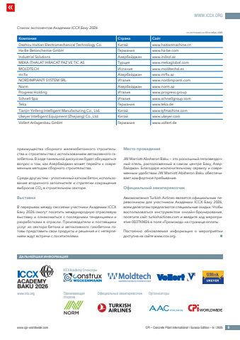 WWW.ICCX.ORGwww.cpi-worldwide.com CPI %u2013 Concrete Plant International | Eurasia Edition %u2013 6 | 2025 9%u0421%u043f%u0438%u0441%u043e%u043a %u044d%u043a%u0441%u043f%u043e%u043d%u0435%u043d%u0442%u043e%u0432 %u0410%u043a%u0430%u0434%u0435%u043c%u0438%u0438 ICCX %u0411%u0430%u043a%u0443 2026 %u041a%u043e%u043c%u043f%u0430%u043d%u0438%u044f %u0421%u0442%u0440%u0430%u043d%u0430 %u0421%u0430%u0439%u0442Dezhou Haitian Electromechanical Technology Co. %u041a%u0438%u0442%u0430%u0439 www.haitianmachine.cnHa-Be Betonchemie GmbH %u0413%u0435%u0440%u043c%u0430%u043d%u0438%u044f www.ha-be.comIndustrial Solutions %u0410%u0437%u0435%u0440%u0431%u0430%u0439%u0434%u0436%u0430%u043d www.indsol.azMEKA ITHALAT IHRACAT PAZ VE TIC AS %u0422%u0443%u0440%u0446%u0438%u044f www.mekaglobal.comMOLDTECH %u0418%u0441%u043f%u0430%u043d%u0438%u044f www.moldtechsl.esmr.fix %u0410%u0437%u0435%u0440%u0431%u0430%u0439%u0434%u0436%u0430%u043d www.mrfix.azNORDIMPIANTI SYSTEM SRL %u0418%u0442%u0430%u043b%u0438%u044f www.nordimpianti.comNorm %u0410%u0437%u0435%u0440%u0431%u0430%u0439%u0434%u0436%u0430%u043d www.norm.azProgress Holding %u0418%u0442%u0430%u043b%u0438%u044f www.progress.groupSchnell Spa %u0418%u0442%u0430%u043b%u0438%u044f www.schnellgroup.comTeka %u0413%u0435%u0440%u043c%u0430%u043d%u0438%u044f www.teka.deTianjin Yinfeng Intelligent Manufacturing Co., Ltd. %u041a%u0438%u0442%u0430%u0439 www.tyfmachine.comUkeyer Intelligent Equipment (Zhejiang) Co., Ltd. %u041a%u0438%u0442%u0430%u0439 www.ukeyer.comVollert Anlagenbau GmbH %u0413%u0435%u0440%u043c%u0430%u043d%u0438%u044f www.vollert.de%u0414%u0410%u041b%u042c%u041d%u0415%u0419%u0428%u0410%u042f %u0418%u041d%u0424%u041e%u0420%u041c%u0410%u0426%u0418%u042fwww.iccx.org %u041f%u0440%u0438%u043d%u0438%u043c%u0430%u044e%u0449%u0430%u044f %u0441%u0442%u043e%u0440%u043e%u043d%u0430ICCX Academy %u0421%u043f%u043e%u043d%u0441%u043e%u0440%u044bACADEMYBAKU 2026%u041e%u0444%u0438%u0446%u0438%u0430%u043b%u044c%u043d%u044b%u0439 %u0430%u0432%u0430%u0438%u043f%u0435%u0440%u0435%u0432%u043e%u0437%u0447%u0438%u043a %u041e%u0440%u0433%u0430%u043d%u0438%u0437%u0430%u0442%u043e%u0440%u044b%u043f%u043e %u0441%u043e%u0441%u0442%u043e%u044f%u043d%u0438%u044e %u043d%u0430 20 %u043e%u043a%u0442%u044f%u0431%u0440%u044f, 2025%u043f%u0440%u0435%u0438%u043c%u0443%u0449%u0435%u0441%u0442%u0432%u0430 %u0441%u0431%u043e%u0440%u043d%u043e%u0433%u043e %u0436%u0435%u043b%u0435%u0437%u043e%u0431%u0435%u0442%u043e%u043d%u043d%u043e%u0433%u043e %u0441%u0442%u0440%u043e%u0438%u0442%u0435%u043b%u044c%u0441%u0442%u0432%u0430 %u0438 %u0441%u0442%u0440%u043e%u0438%u0442%u0435%u043b%u044c%u0441%u0442%u0432%u0430 %u0441 %u0438%u0441%u043f%u043e%u043b%u044c%u0437%u043e%u0432%u0430%u043d%u0438%u0435%u043c %u0430%u0432%u0442%u043e%u043a%u043b%u0430%u0432%u043d%u043e%u0433%u043e %u0433%u0430%u0437%u043e%u0431%u0435%u0442%u043e%u043d%u0430. %u0412 %u0445%u043e%u0434%u0435 %u043f%u0430%u043d%u0435%u043b%u044c%u043d%u043e%u0439 %u0434%u0438%u0441%u043a%u0443%u0441%u0441%u0438%u0438 %u0431%u0443%u0434%u0435%u0442 %u043e%u0431%u0441%u0443%u0436%u0434%u0430%u0442%u044c%u0441%u044f %u0432%u043e%u043f%u0440%u043e%u0441 %u043e %u0442%u043e%u043c, %u043a%u0430%u043a %u0410%u0437%u0435%u0440%u0431%u0430%u0439%u0434%u0436%u0430%u043d %u043c%u043e%u0436%u0435%u0442 %u043f%u0435%u0440%u0435%u0439%u0442%u0438 %u043a %u0441%u043e%u0432%u0440%u0435%u043c%u0435%u043d%u043d%u044b%u043c %u043c%u0435%u0442%u043e%u0434%u0430%u043c %u0441%u0431%u043e%u0440%u043d%u043e%u0433%u043e %u0441%u0442%u0440%u043e%u0438%u0442%u0435%u043b%u044c%u0441%u0442%u0432%u0430. %u0421%u0440%u0435%u0434%u0438 %u0434%u0440%u0443%u0433%u0438%u0445 %u0442%u0435%u043c %u2013 %u0443%u043f%u043b%u043e%u0442%u043d%u0435%u043d%u043d%u044b%u0439 %u043a%u0430%u0442%u043a%u043e%u043c %u0431%u0435%u0442%u043e%u043d, %u0438%u0441%u043f%u043e%u043b%u044c%u0437%u043e%u0432%u0430%u043d%u0438%u0435 %u0432%u0442%u043e%u0440%u0438%u0447%u043d%u043e%u0433%u043e %u0437%u0430%u043f%u043e%u043b%u043d%u0438%u0442%u0435%u043b%u044f %u0438 %u0441%u0442%u0440%u0430%u0442%u0435%u0433%u0438%u0438 %u0441%u043e%u043a%u0440%u0430%u0449%u0435%u043d%u0438%u044f %u0432%u044b%u0431%u0440%u043e%u0441%u043e%u0432 CO2 %u0432 %u0441%u0442%u0440%u043e%u0438%u0442%u0435%u043b%u044c%u043d%u043e%u043c %u0441%u0435%u043a%u0442%u043e%u0440%u0435.%u0412%u044b%u0441%u0442%u0430%u0432%u043a%u0430%u0412 %u043f%u0435%u0440%u0435%u0440%u044b%u0432%u0430%u0445 %u043c%u0435%u0436%u0434%u0443 %u0441%u0435%u0441%u0441%u0438%u044f%u043c%u0438 %u0443%u0447%u0430%u0441%u0442%u043d%u0438%u043a%u0438 %u0410%u043a%u0430%u0434%u0435%u043c%u0438%u0438 ICCX %u0411%u0430%u043a%u0443 2026 %u0441%u043c%u043e%u0433%u0443%u0442 %u043f%u043e%u0441%u0435%u0442%u0438%u0442%u044c %u043c%u0435%u0436%u0434%u0443%u043d%u0430%u0440%u043e%u0434%u043d%u0443%u044e %u043e%u0442%u0440%u0430%u0441%u043b%u0435%u0432%u0443%u044e %u0432%u044b%u0441%u0442%u0430%u0432%u043a%u0443 %u0438 %u043e%u0437%u043d%u0430%u043a%u043e%u043c%u0438%u0442%u044c%u0441%u044f %u0441 %u043f%u043e%u0441%u043b%u0435%u0434%u043d%u0438%u043c%u0438 %u0442%u0435%u043d%u0434%u0435%u043d%u0446%u0438%u044f%u043c%u0438 %u0438 %u0440%u0430%u0437%u0440%u0430%u0431%u043e%u0442%u043a%u0430%u043c%u0438 %u0432 %u043e%u0442%u0440%u0430%u0441%u043b%u0438. %u041f%u0440%u043e%u0438%u0437%u0432%u043e%u0434%u0438%u0442%u0435%u043b%u0438 %u0438 %u043f%u043e%u0441%u0442%u0430%u0432%u0449%u0438%u043a%u0438 %u0443%u0441%u043b%u0443%u0433 %u0438%u0437 %u0441%u0435%u043a%u0442%u043e%u0440%u0430 %u0431%u0435%u0442%u043e%u043d%u0430 %u0438 %u0430%u0432%u0442%u043e%u043a%u043b%u0430%u0432%u043d%u043e%u0433%u043e %u0433%u0430%u0437%u043e%u0431%u0435%u0442%u043e%u043d%u0430 %u0433%u043e%u0442%u043e%u0432%u044b %u043f%u0440%u0435%u0434%u0441%u0442%u0430%u0432%u0438%u0442%u044c %u0441%u0432%u043e%u0438 %u043f%u0440%u043e%u0434%u0443%u043a%u0442%u044b %u0438 %u0440%u0435%u0448%u0435%u043d%u0438%u044f %u0438 %u0441 %u043d%u0435%u0442%u0435%u0440%u043f%u0435%u043d%u0438%u0435%u043c %u0436%u043