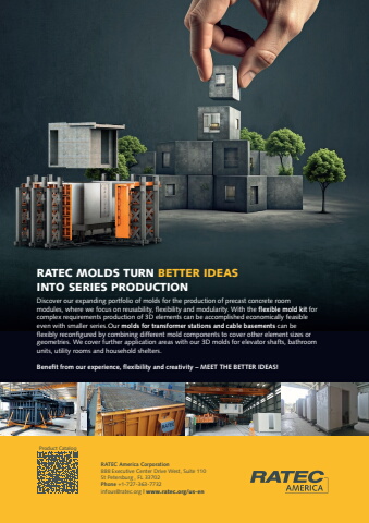 RATEC America Corporation 888 Executive Center Drive West, Suite 110St Petersburg , FL 33702Phone +1-727-363-7732 infous@ratec.org | www.ratec.org/us-enProduct CatalogDiscover our expanding portfolio of molds for the production of precast concrete room modules, where we focus on reusability, flexibility and modularity. With the flexible mold kit for complex requirements production of 3D elements can be accomplished economically feasible even with smaller series.Our molds for transformer stations and cable basements can be flexibly reconfigured by combining different mold components to cover other element sizes or geometries. We cover further application areas with our 3D molds for elevator shafts, bathroom units, utility rooms and household shelters.Benefit from our experience, flexibility and creativity %u2013 MEET THE BETTER IDEAS! RATEC MOLDS TURN BETTER IDEAS INTO SERIES PRODUCTION